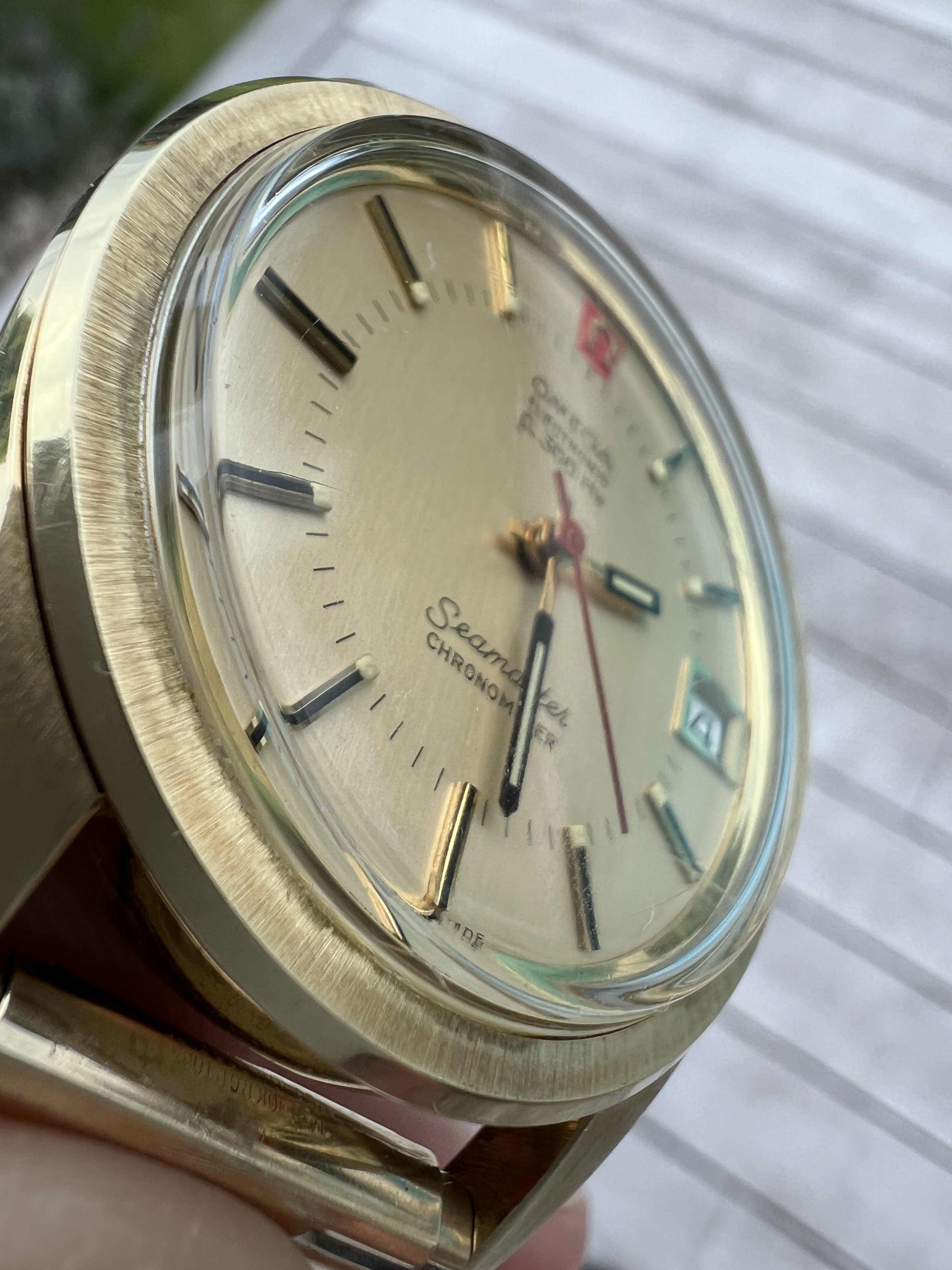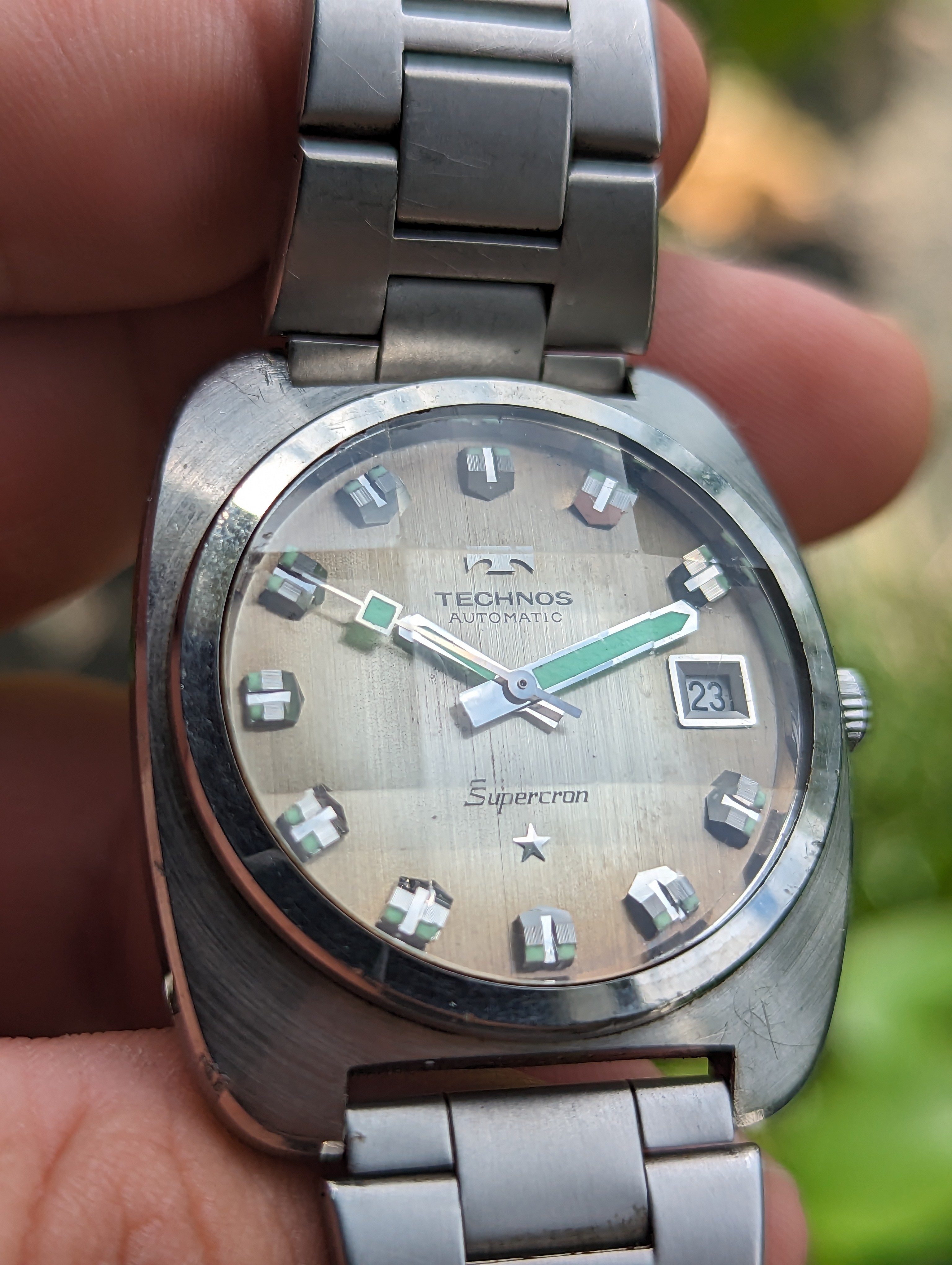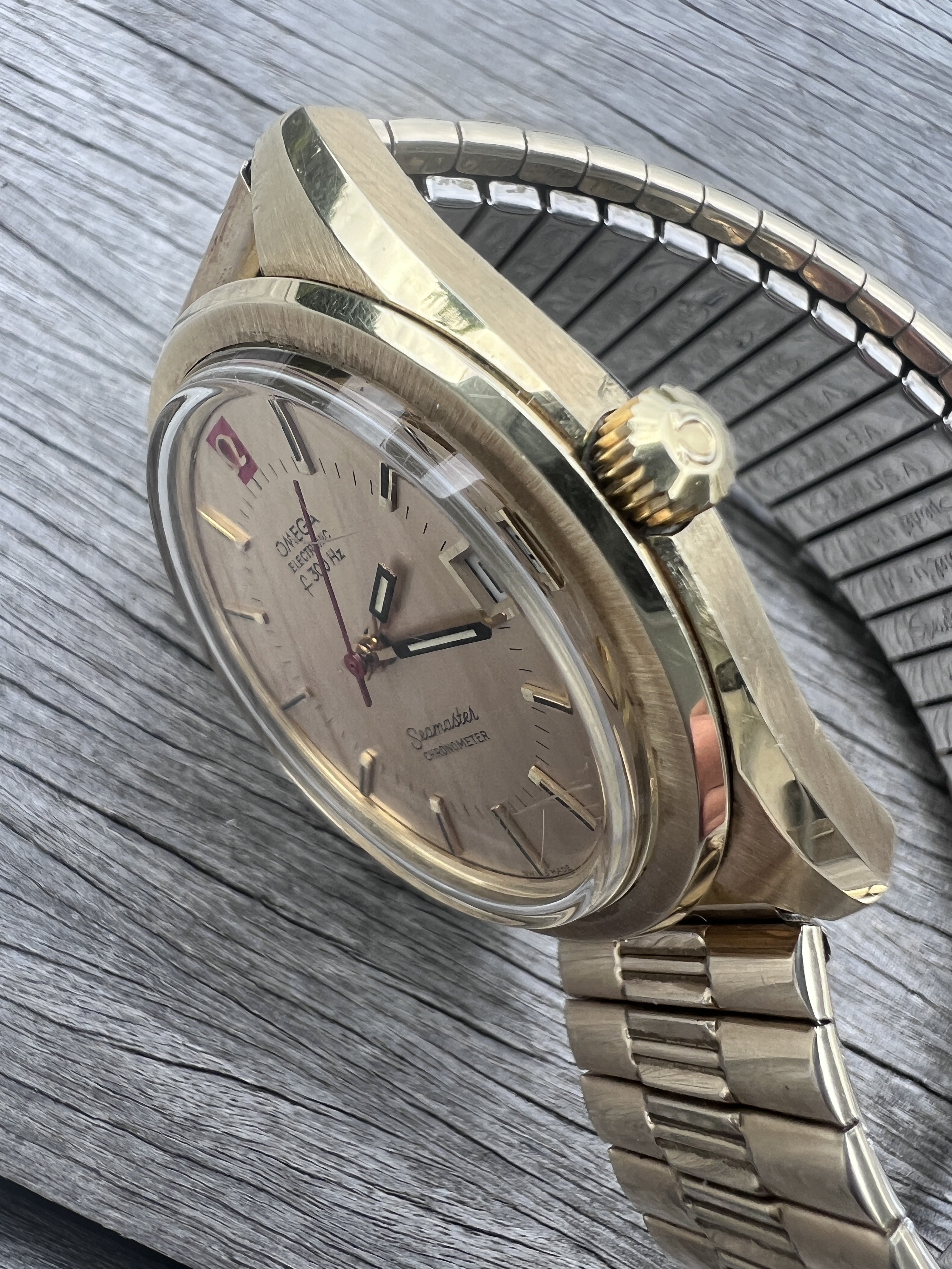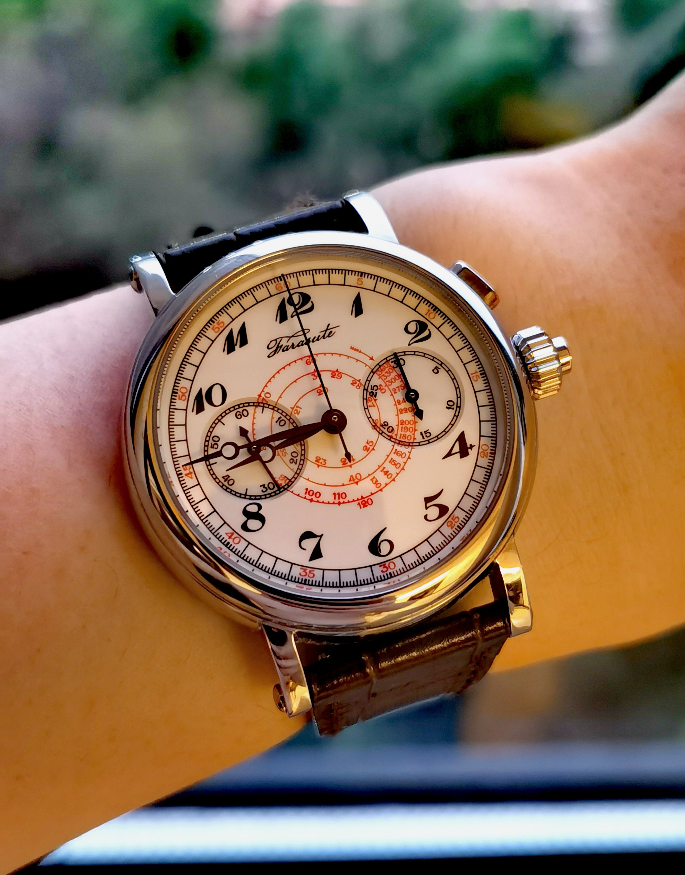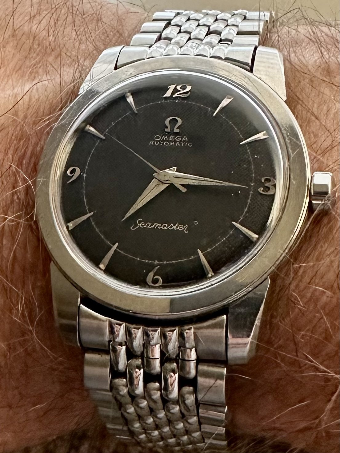 Roamer Mustang Indianapolis watches of this reference don't have luminous hands at all so they have been changed out, definitely the hour and minute hands are Roamer but that critical to the process of photographic developing second hand I am not so sure but it is a big luminous hand as befits it usage.
