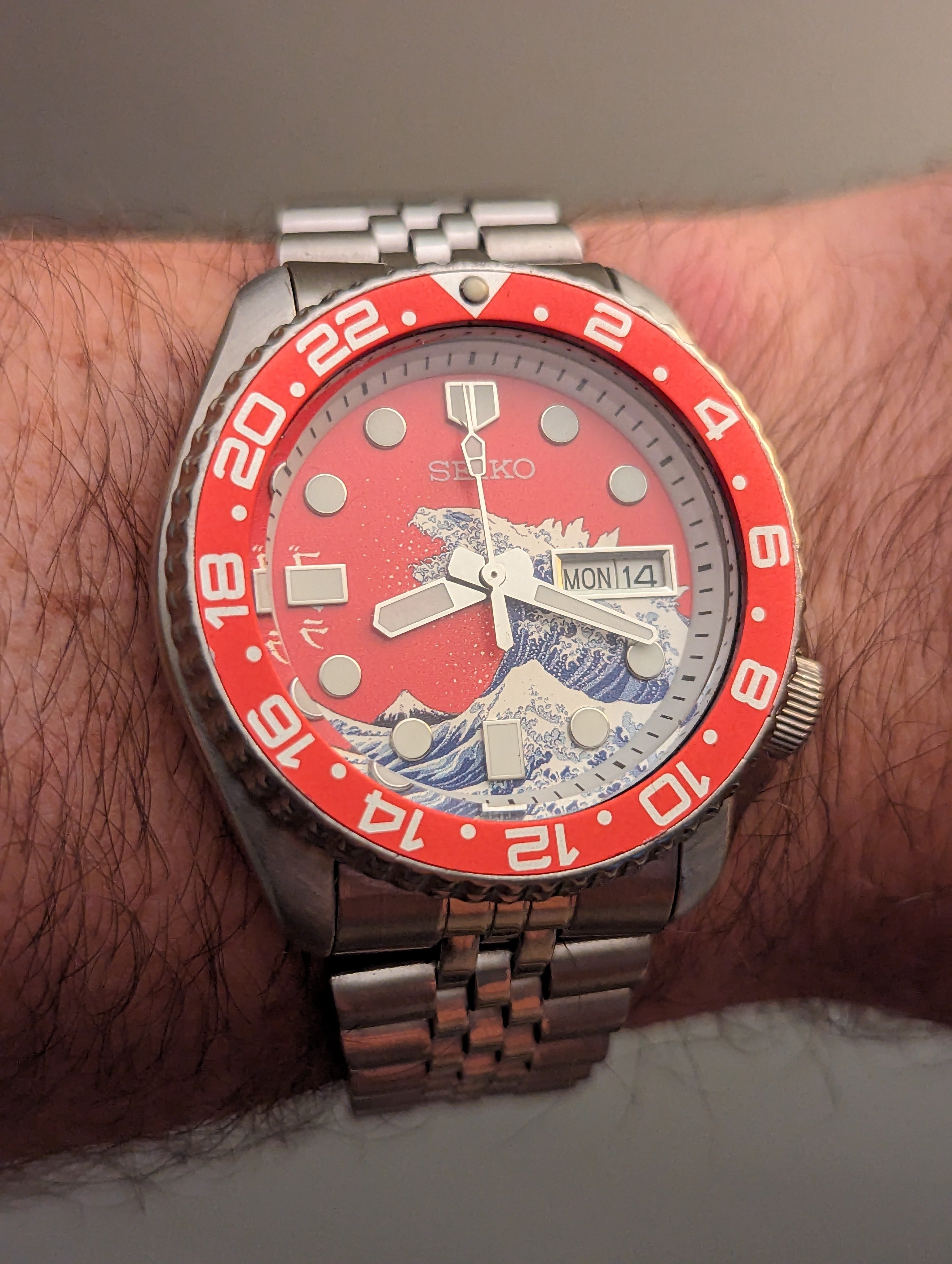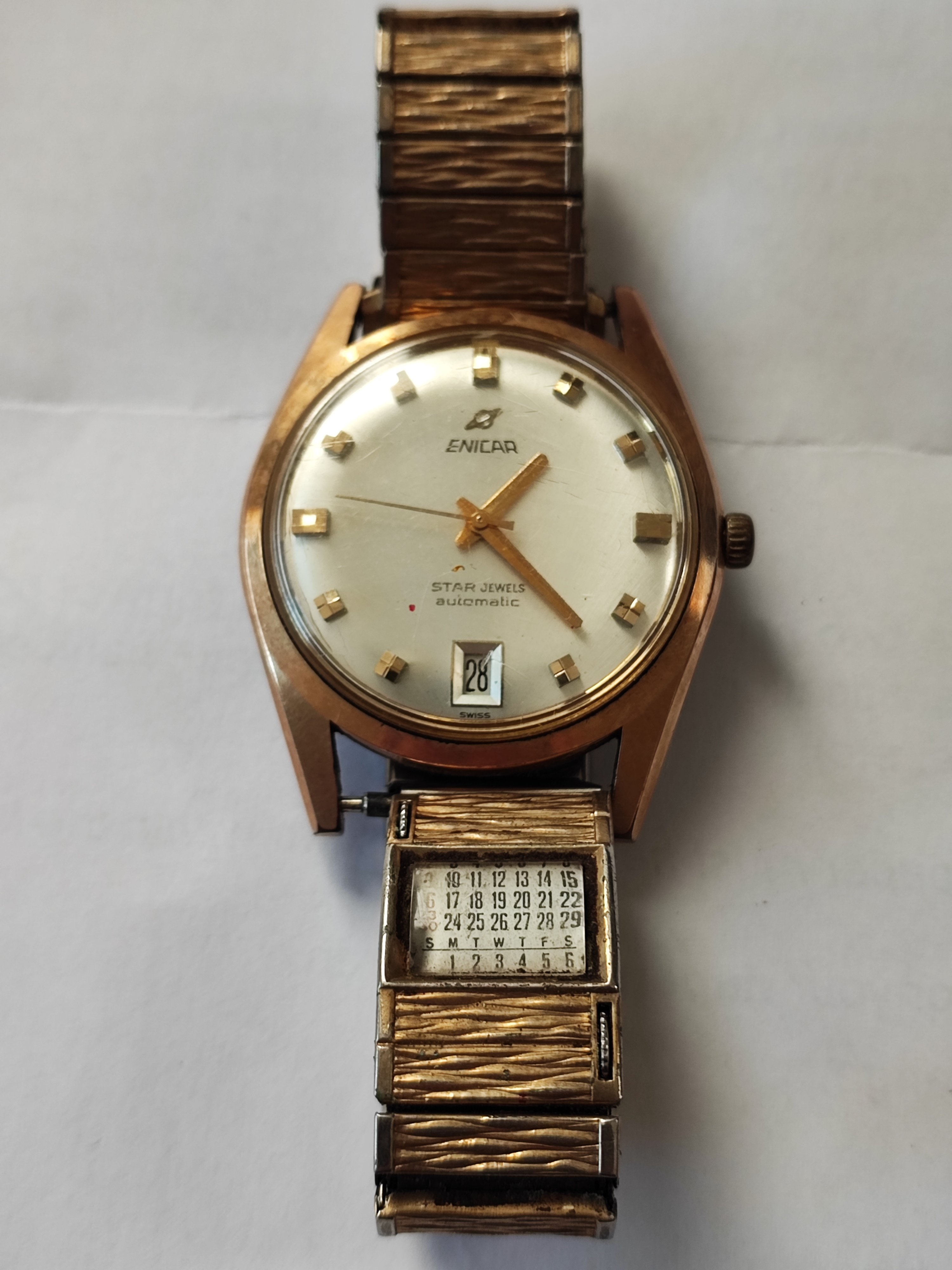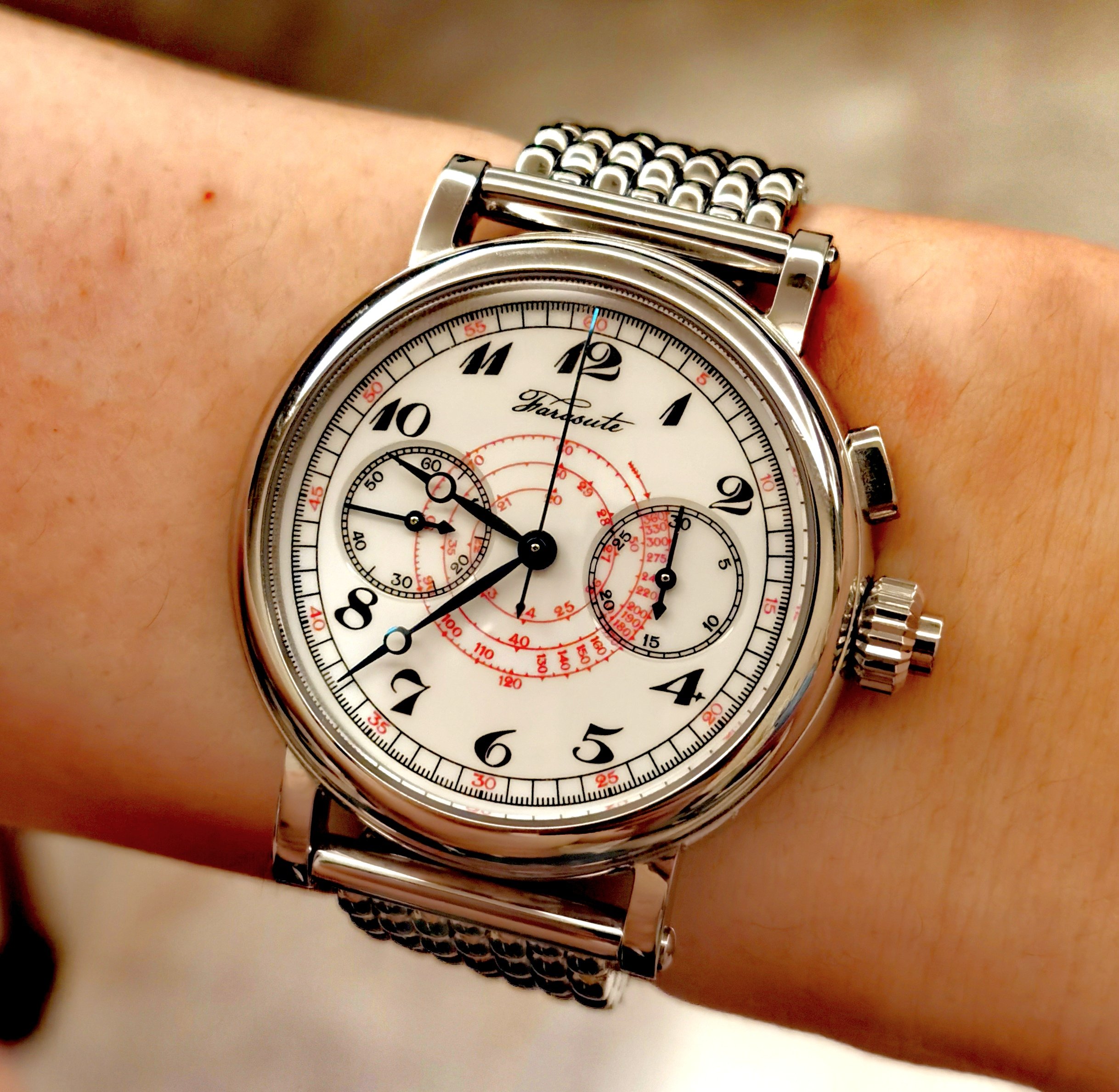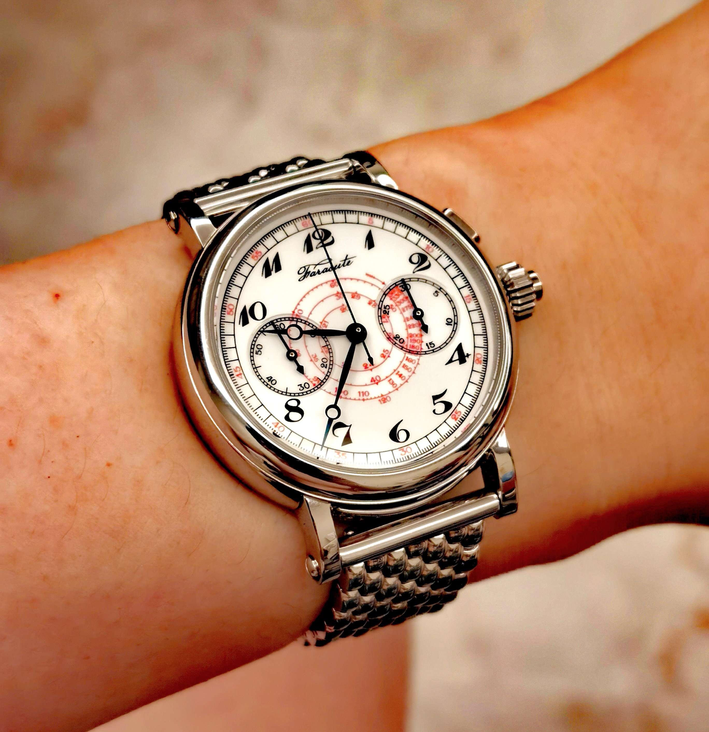 Roamer Mustang Indianapolis watches of this reference don't have luminous hands at all so they have been changed out, definitely the hour and minute hands are Roamer but that critical to the process of photographic developing second hand I am not so sure but it is a big luminous hand as befits it usage.