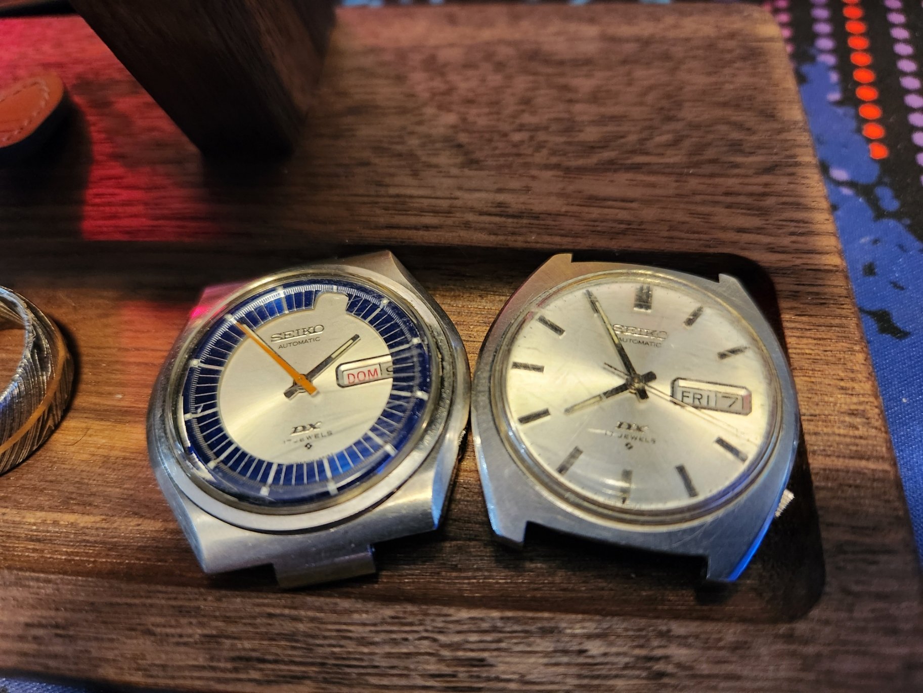 Had these come in the mail last week, both 6125 movement. The white dial has a non functional day adjuster and the blue chapter ring piece I bought for parts. Going to swap the movement and dial over from integrated bracelet case to get a cheap watch and experience with vintage seiko movements. I take my first watchmaking classes next week.