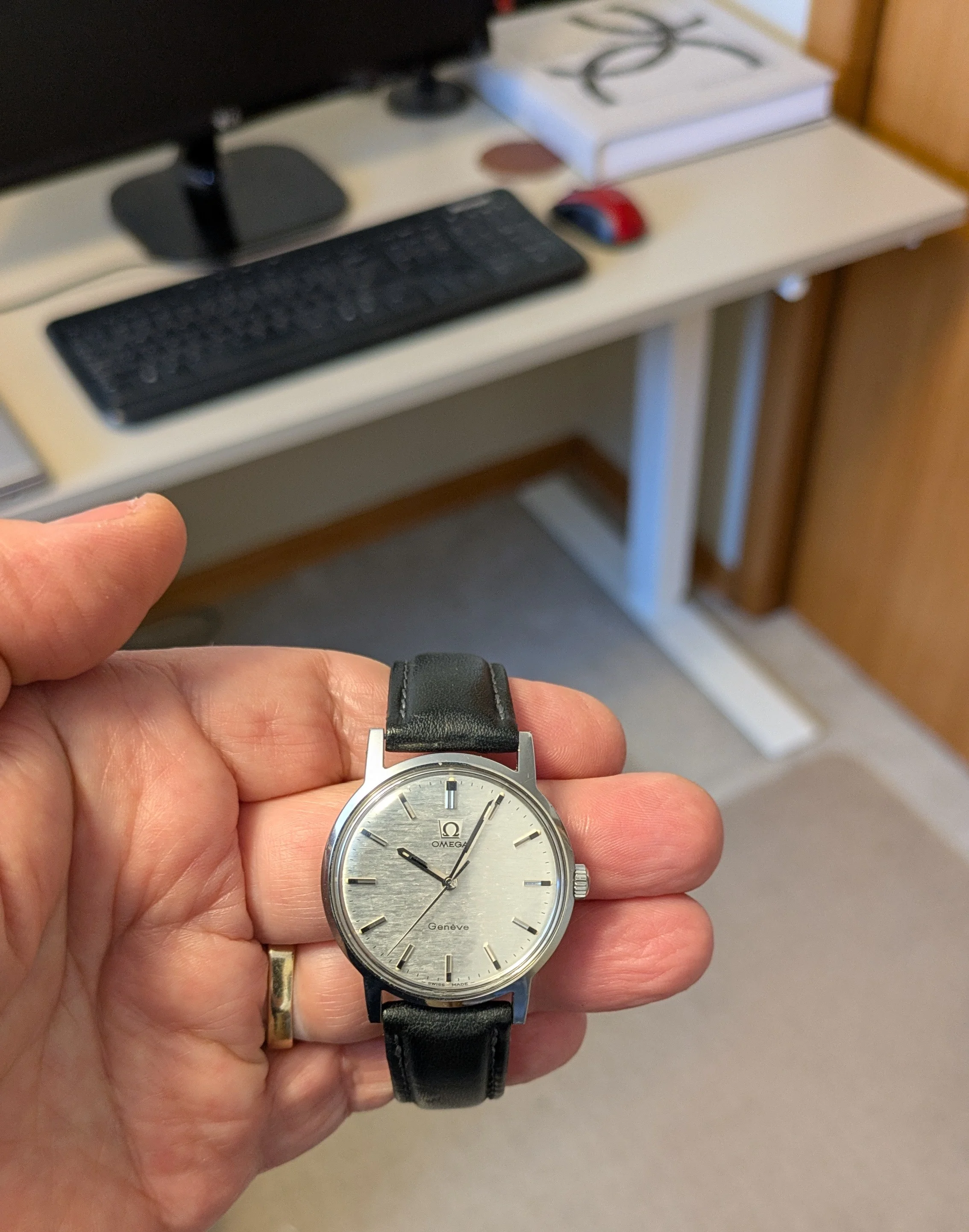 I kindof like that strap too. Dark, but not black, ties in a bit with the gold hardware. Seems it would look sharp but not out of place in either casual or dressy wear.