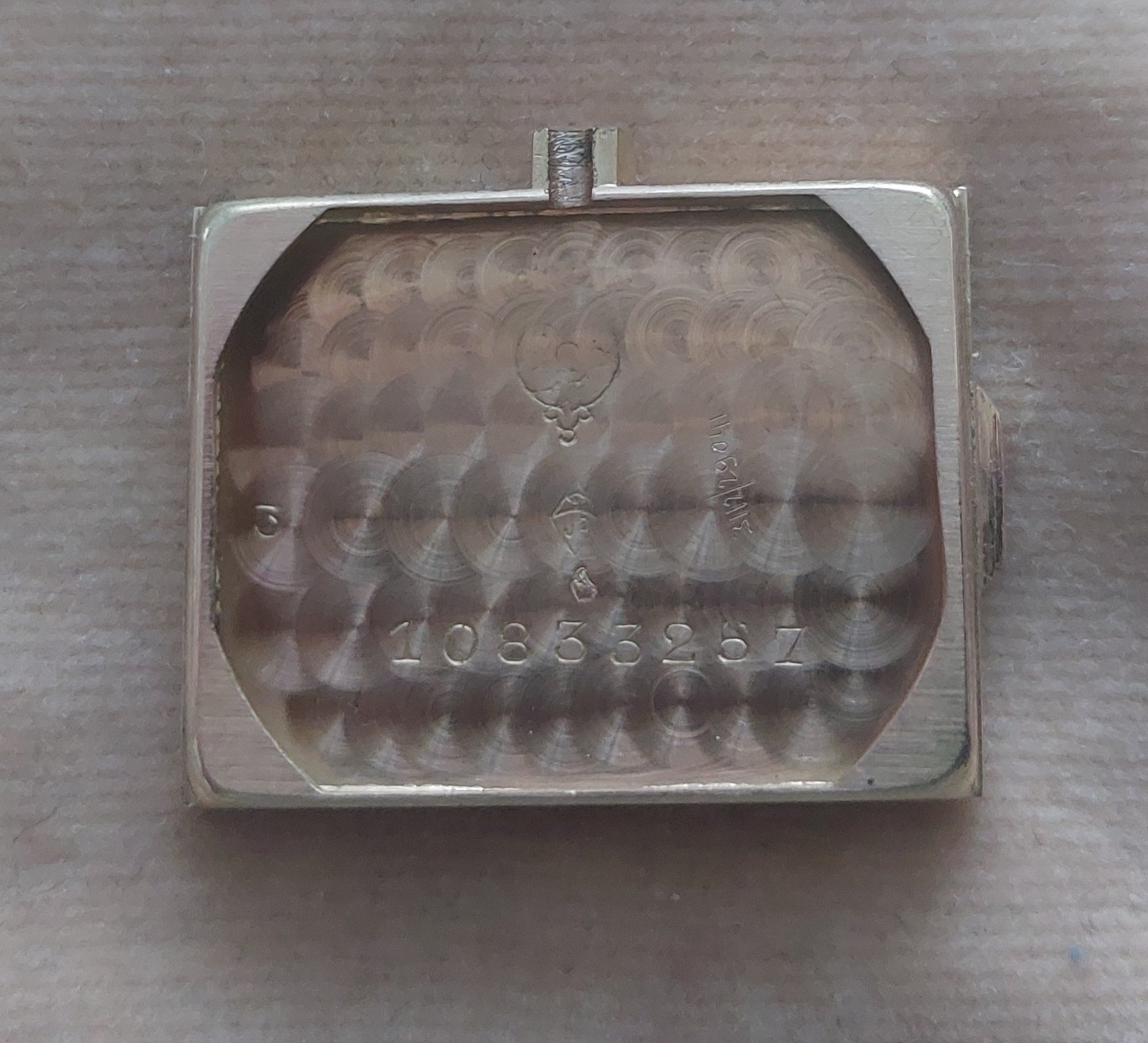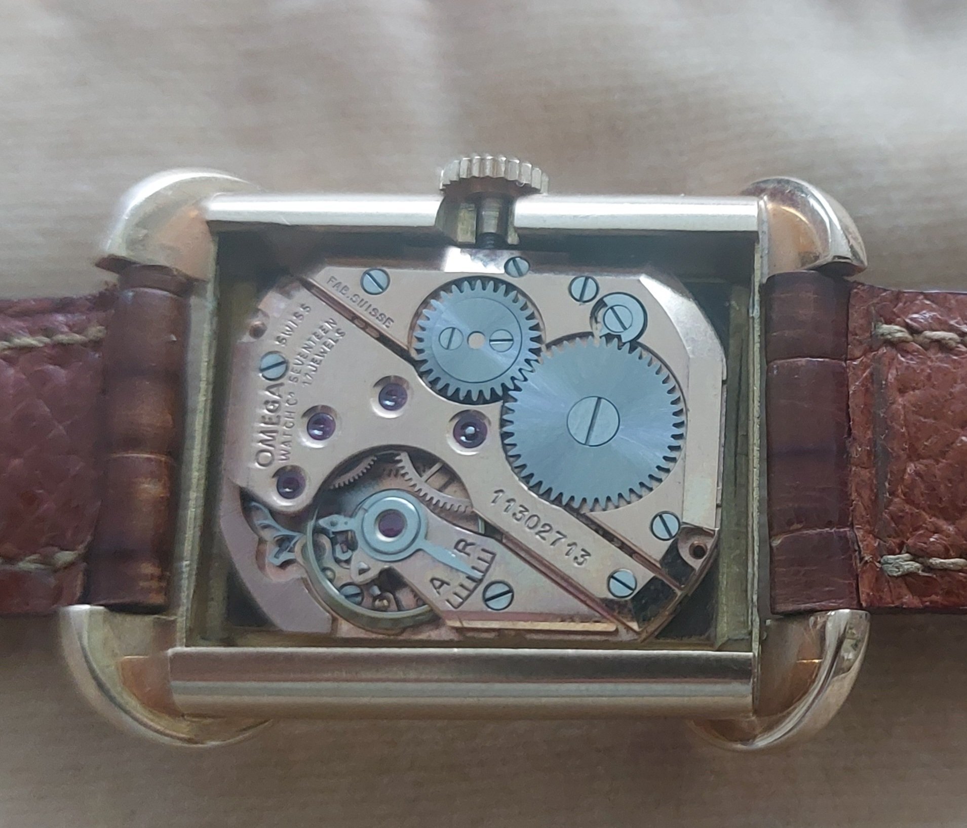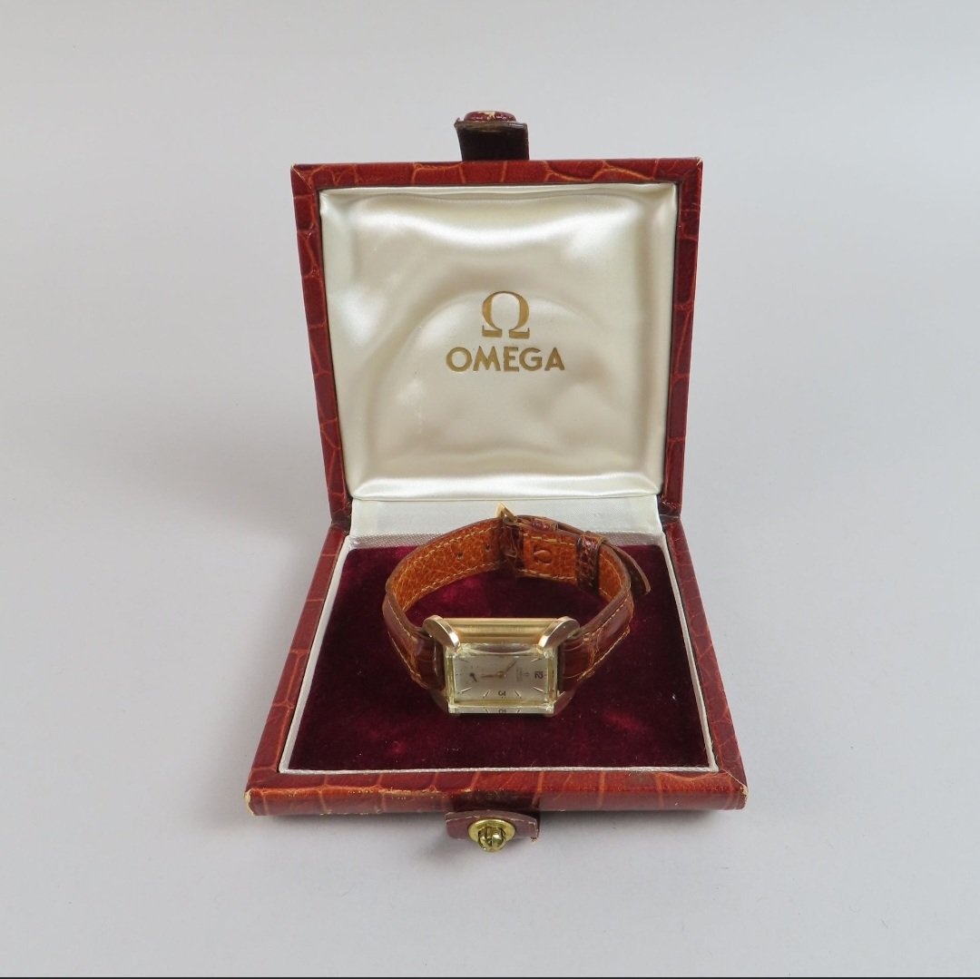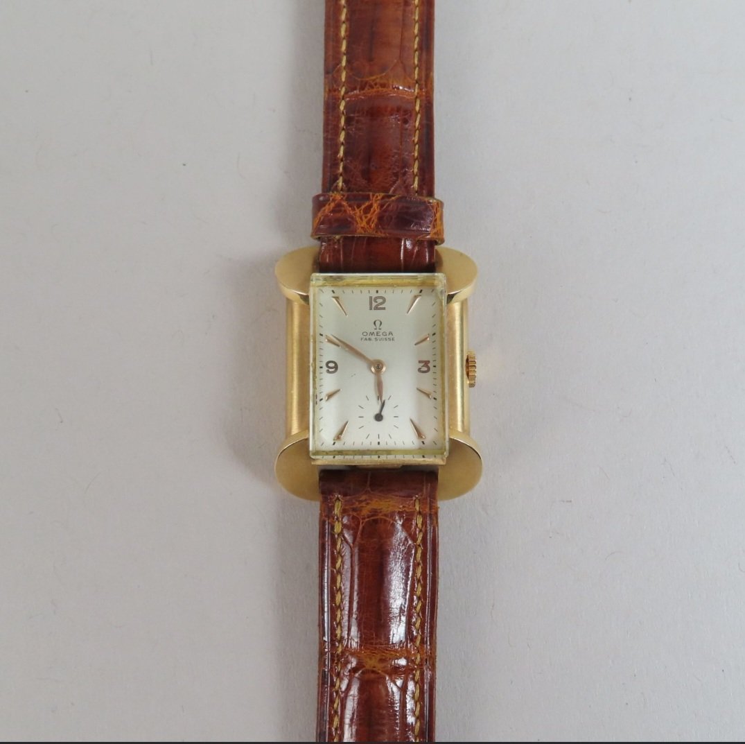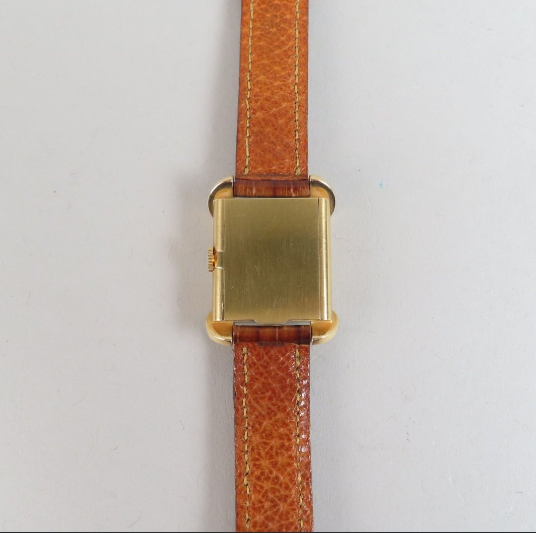 ·I recently bought this watch in France just because I loved the case. I would think that it is from the 1940s, but it looks almost unused. I have not been able to find anything similar and would be interested to hear if anyone has any information or ideas about the maker. The case and the buckle both have the French eagle's head hallmark for 18k gold. The glass is mineral glass and unusually thick. Dimensions are 27x32 mm. As I am not a watchmaker, I don't want to open the back to look for a movement number.
