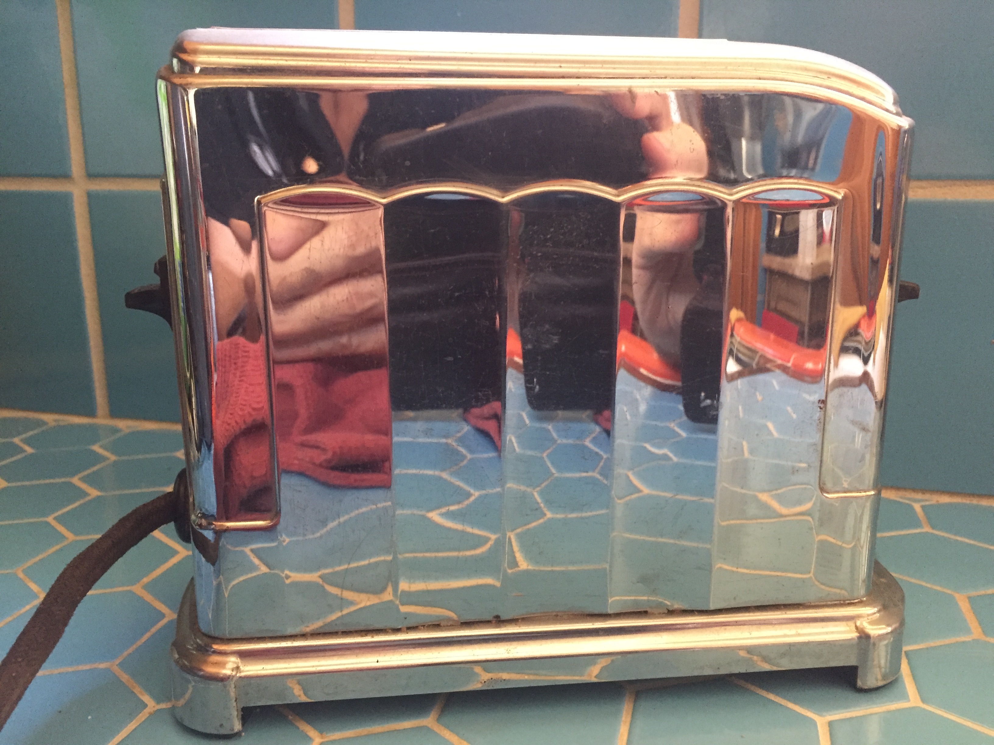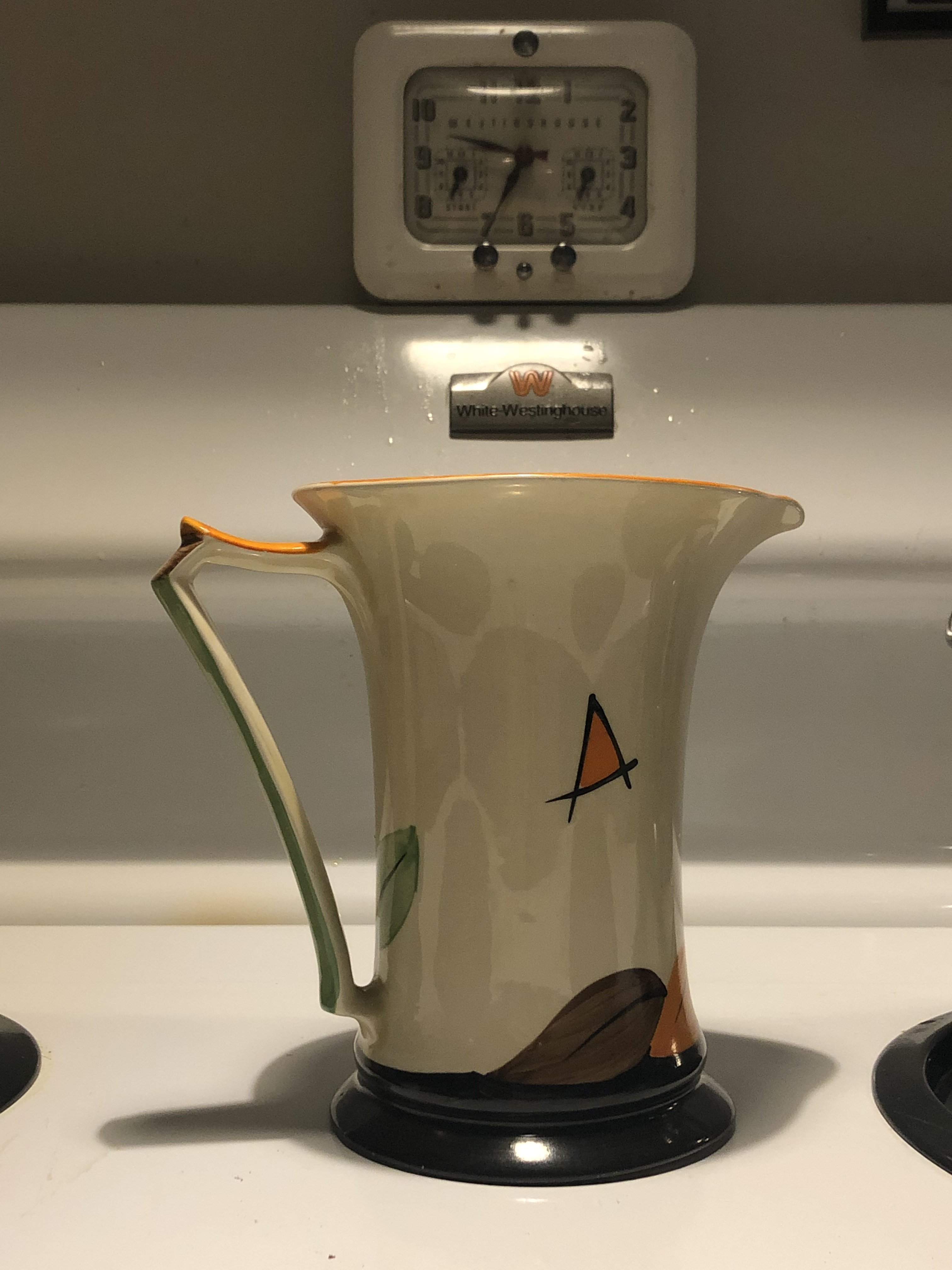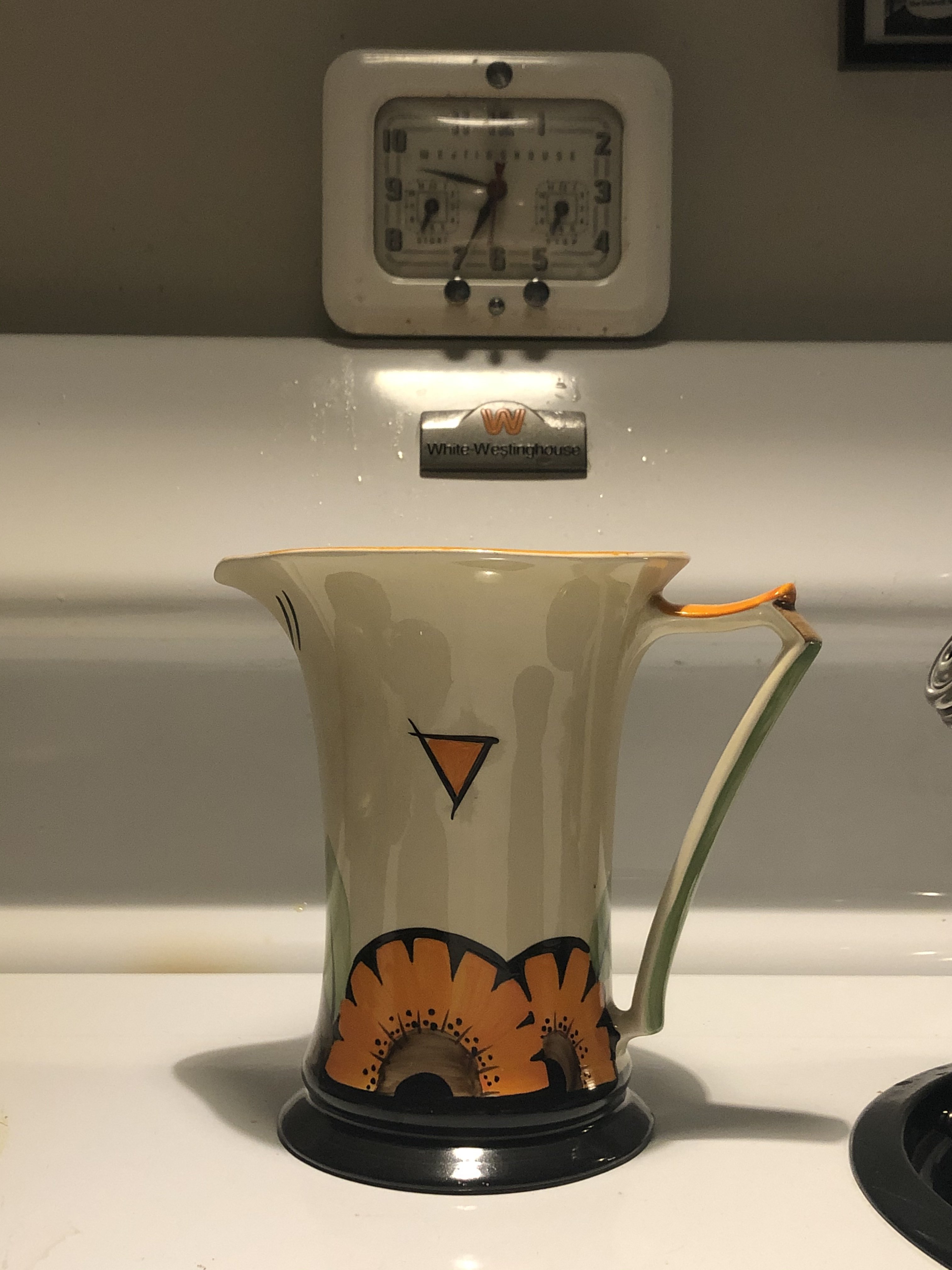 Chicago World’s Fair lamp reflected in my Seiko. The flower frog may be older than the Art Deco period. The mug qualifies, I believe. Stove clock just looked like it belonged in the photo, so I left it.