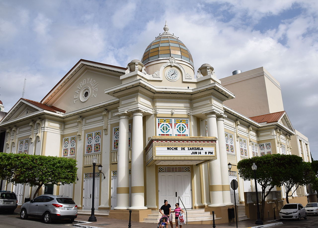 I showed the image to my son who has an interest in historical architecture and city planing which he studied at Berkeley. He recognized the theater which is in Mayaguez, Puerto Rico. The Teatro Yagüez is a neo-baroque theater designed by Francisco Maymón Palmer, and features some eclectic elements that are misconstrued by many as Art Deco. Built in 1909, it was completed well before the style or the term Art Deco existed.