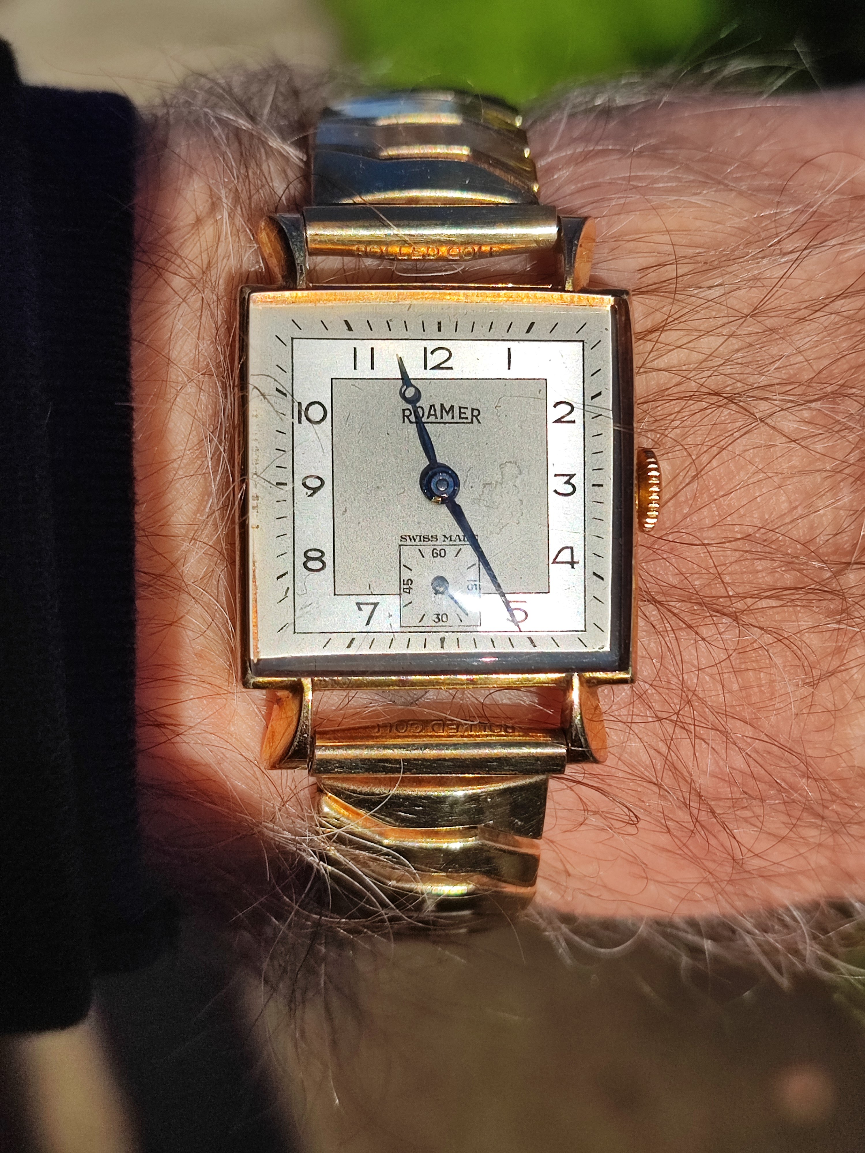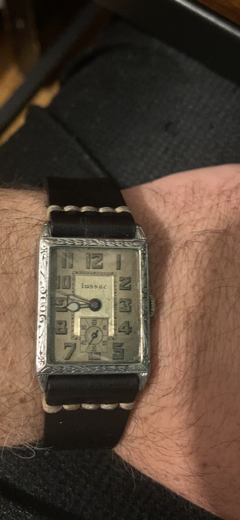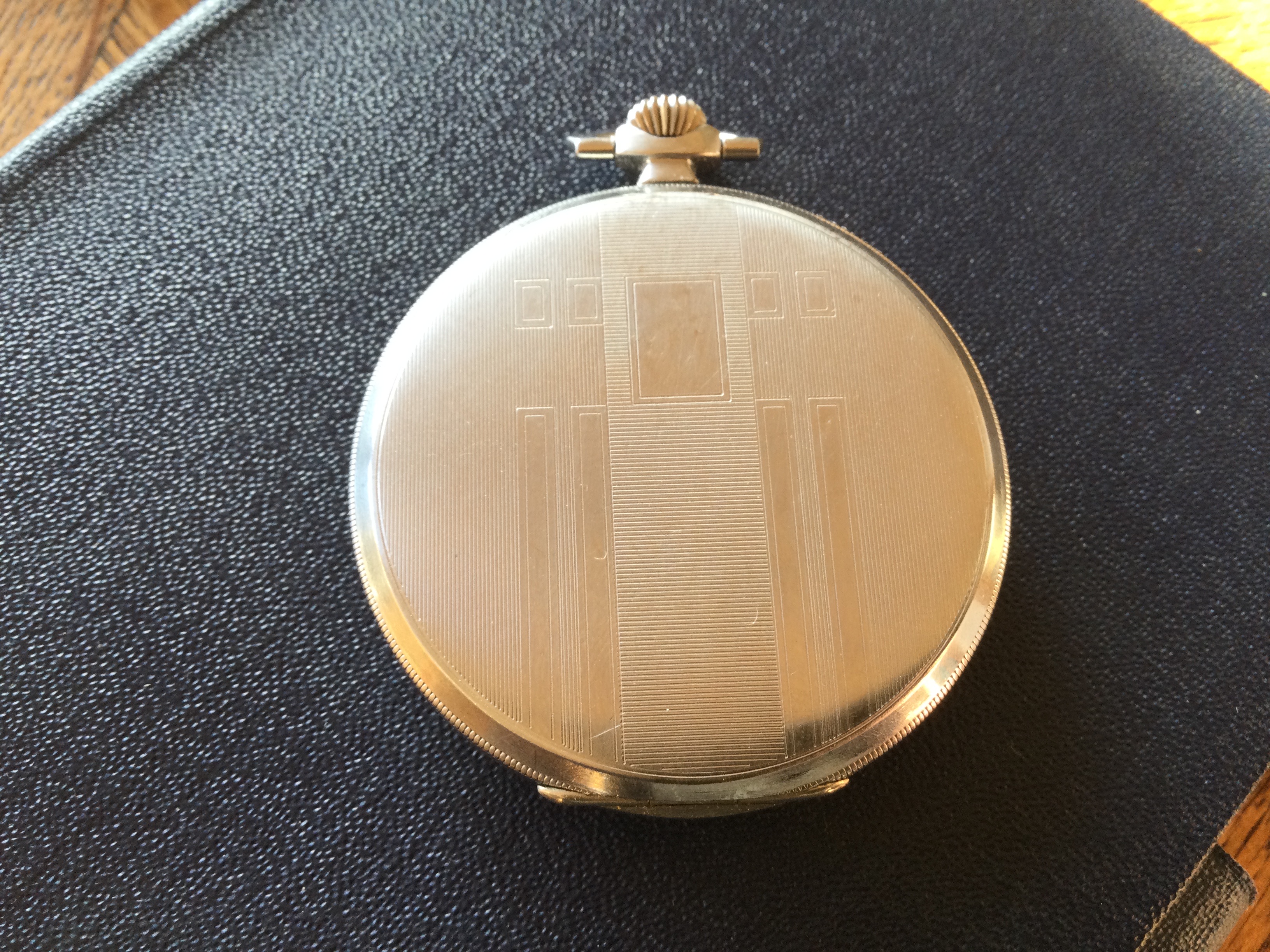 Zodiac with brushed salmon dial and mirrored foil indices. I would say late 1940s or early 1950s, as it has hacking seconds. Perhaps this is not art deco in the strictest sense,