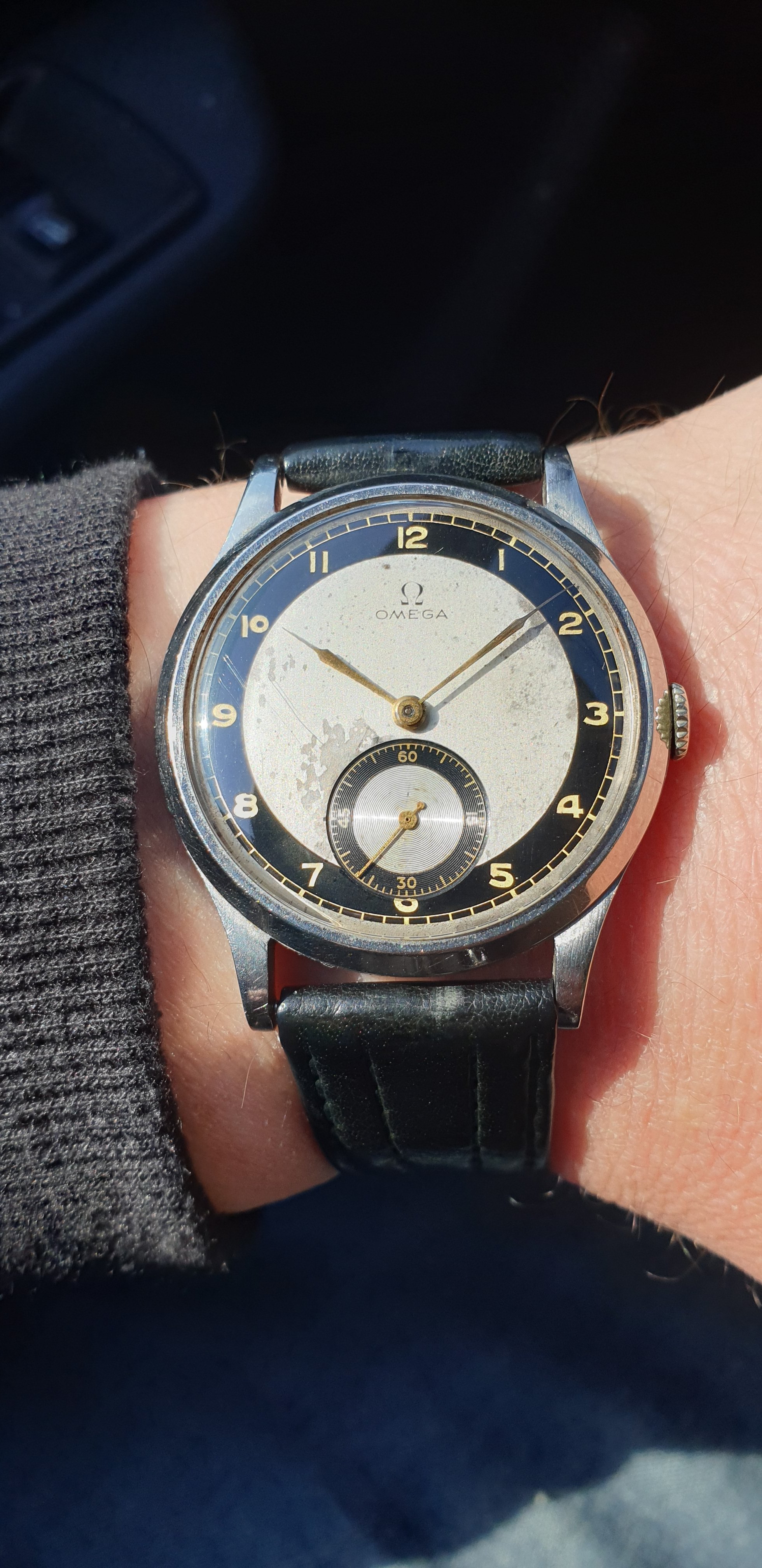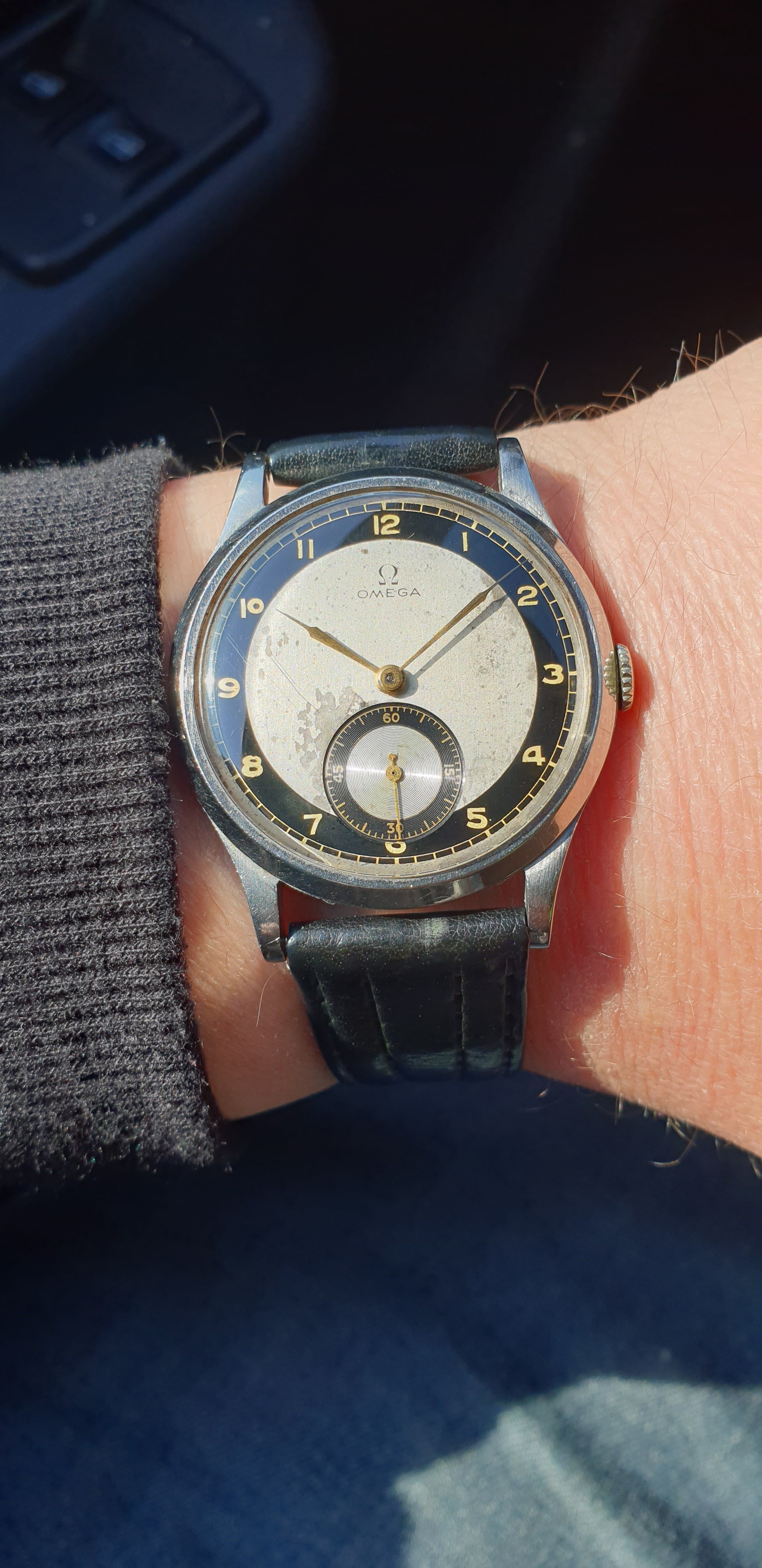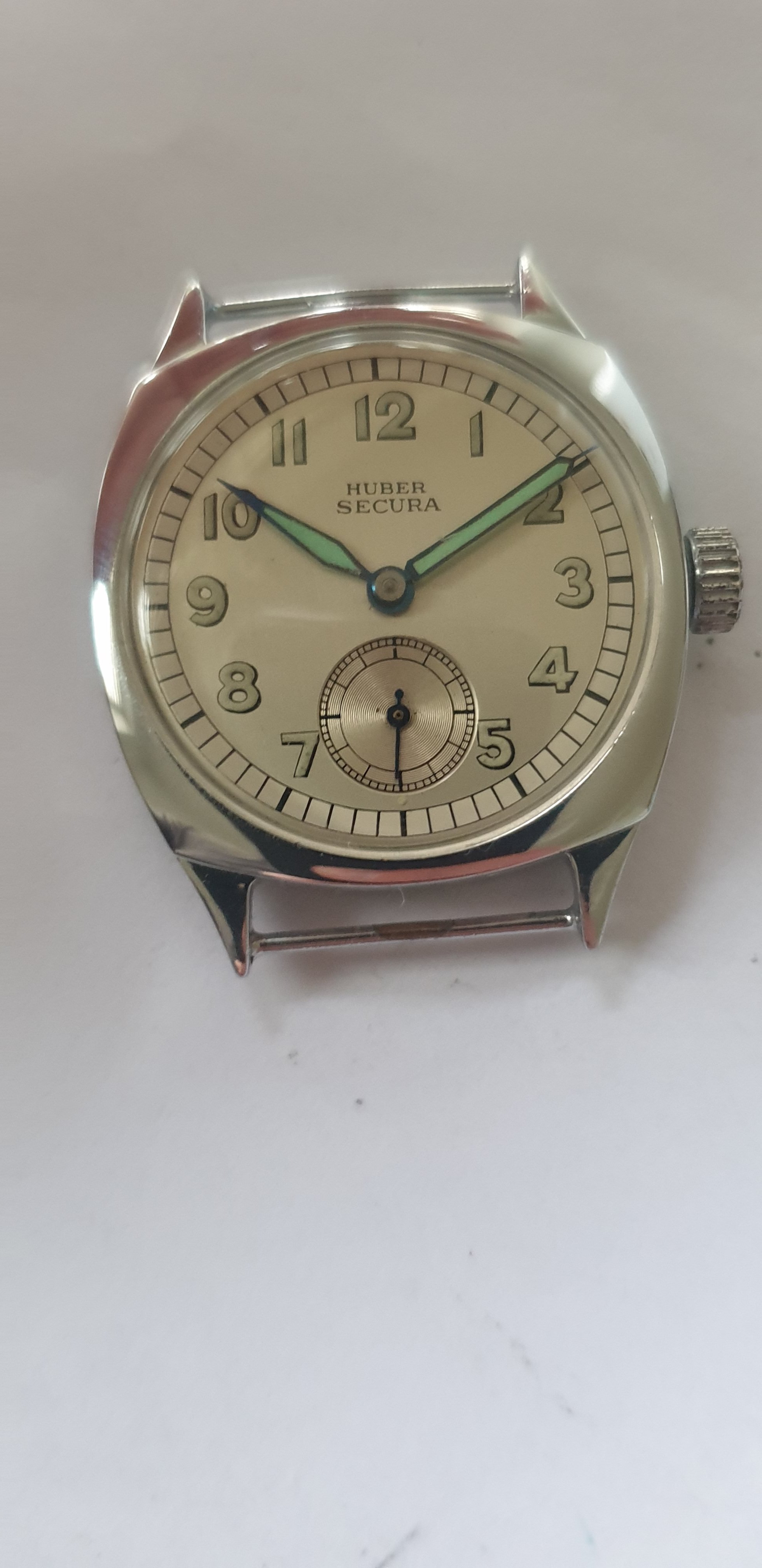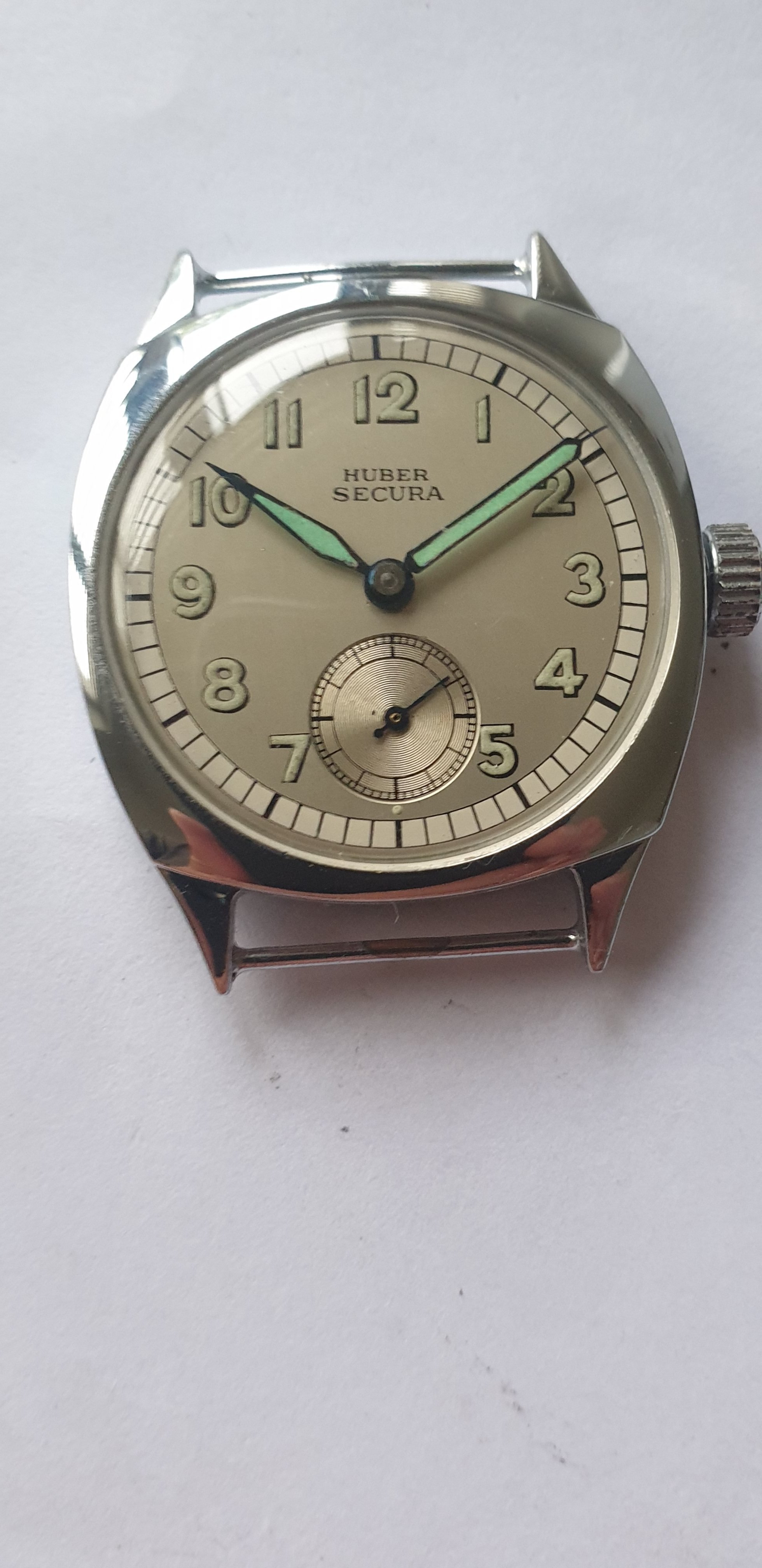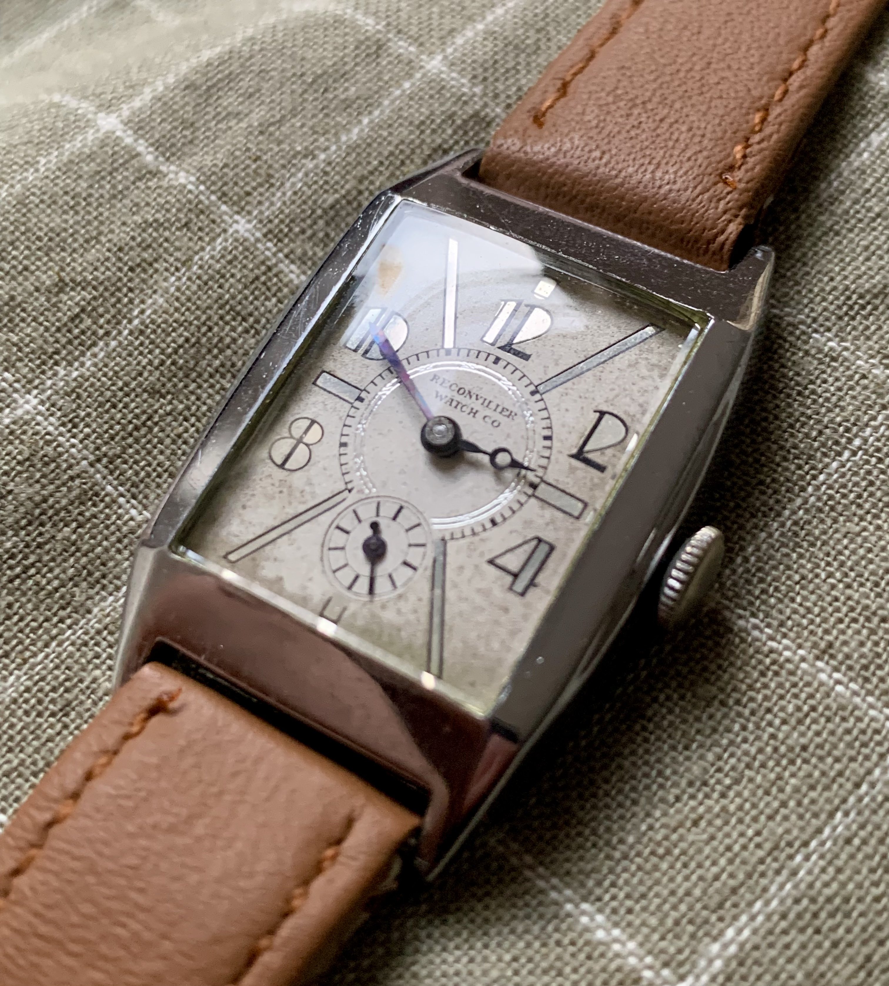 ·1940s Reconvilier with silver mirrored foil numbers in large art deco typeface. Very interesting silvered inner pattern ring. Blued steel hands. @Syrte am I okay with this one? 😀