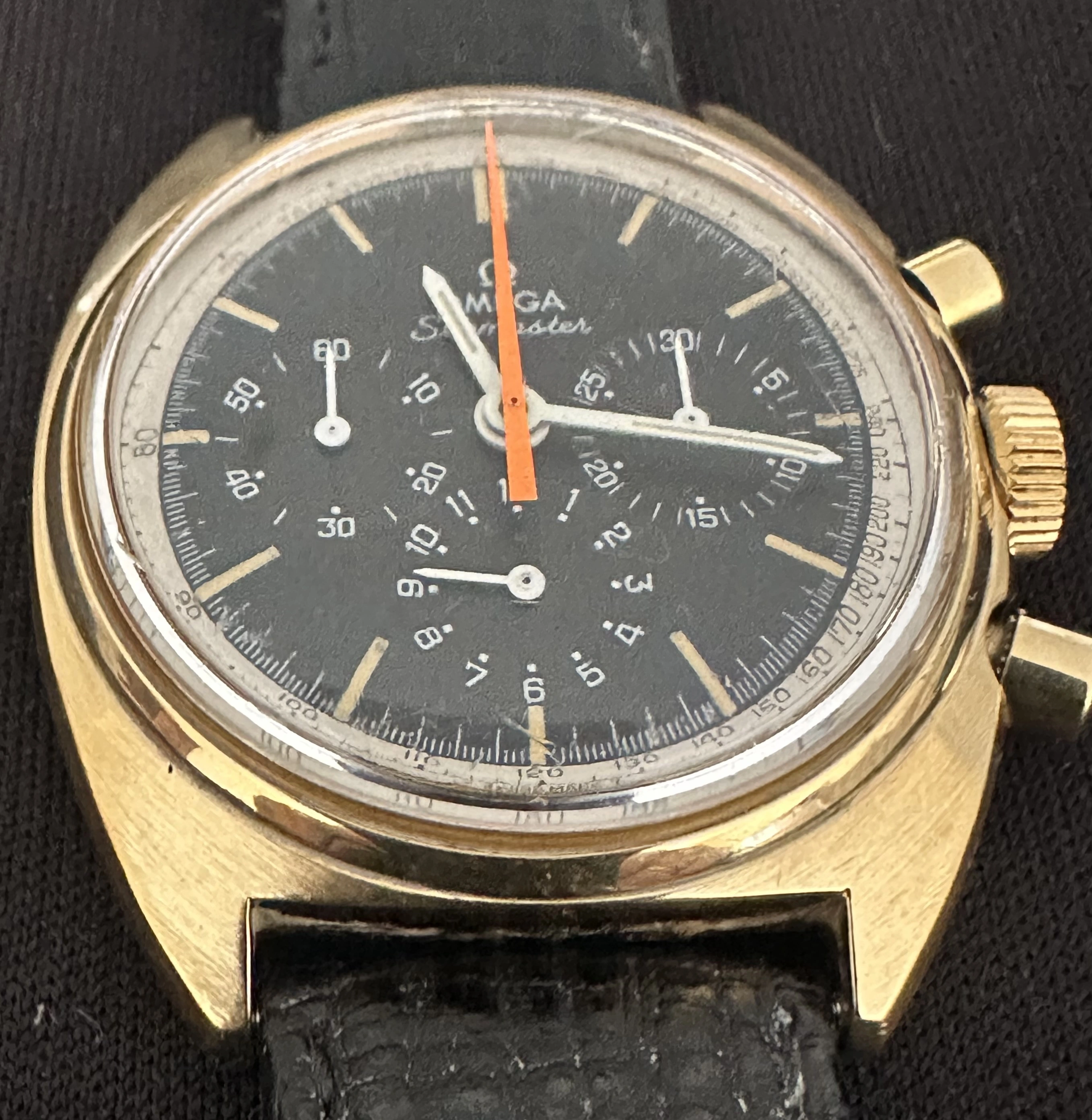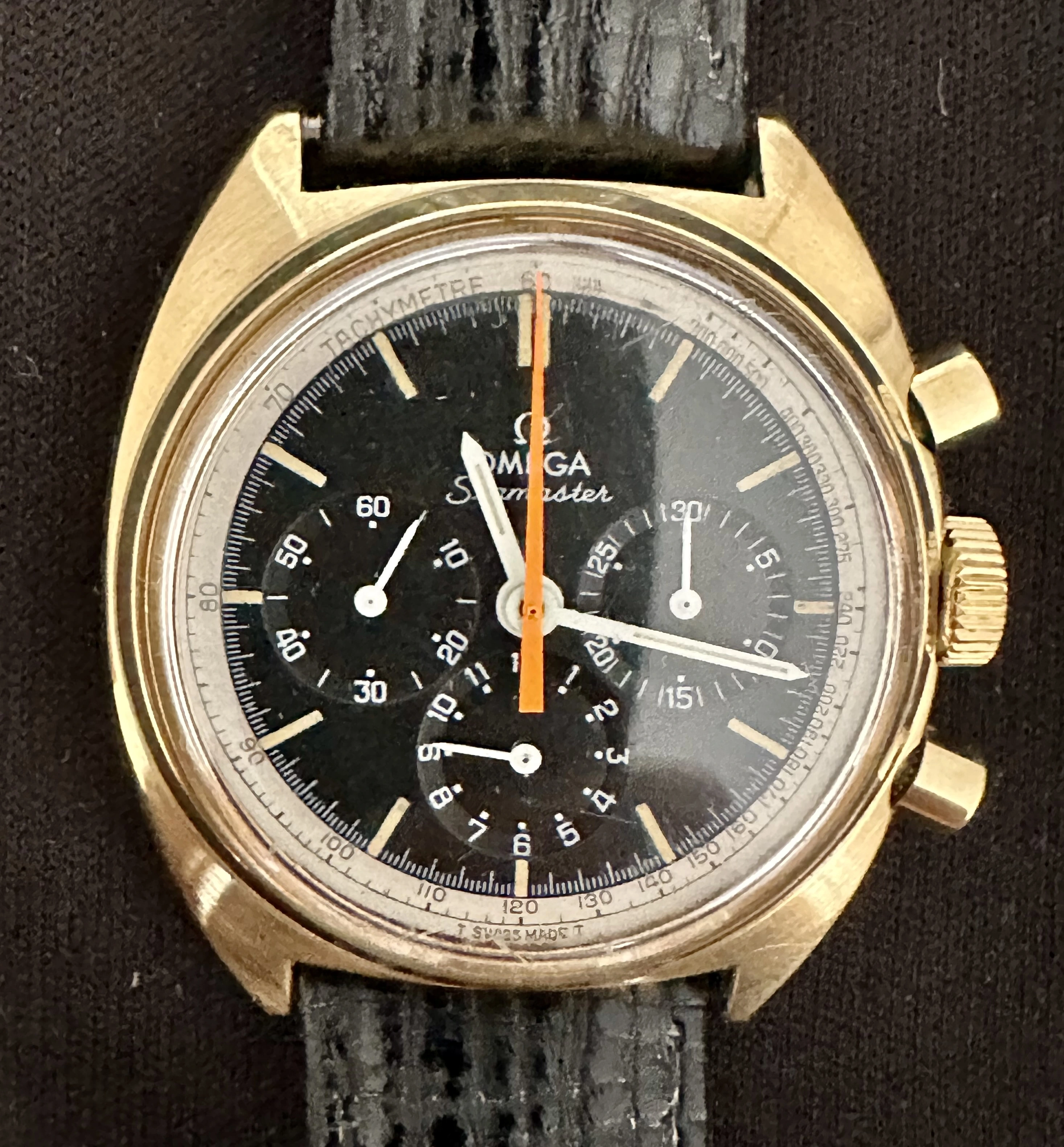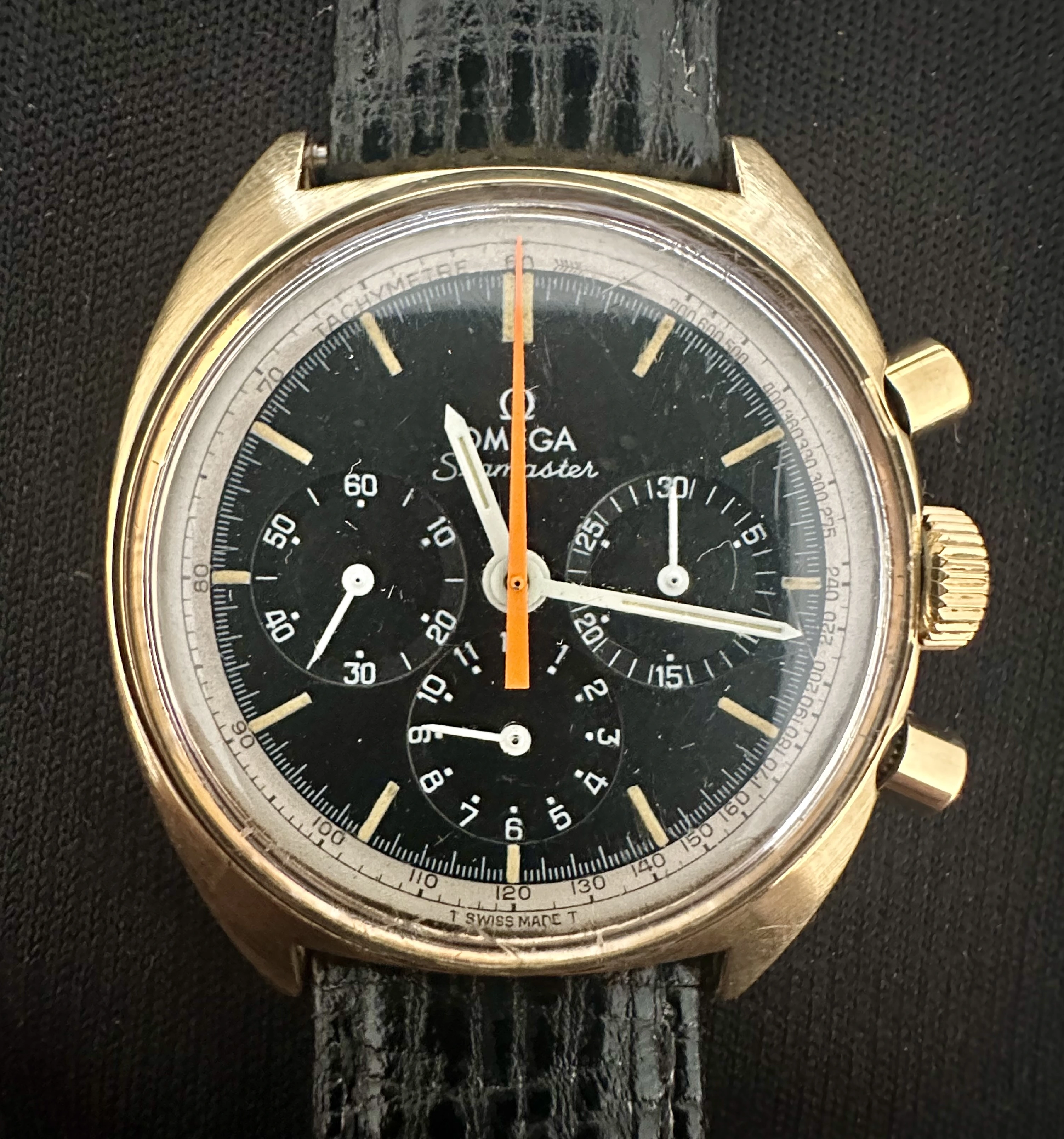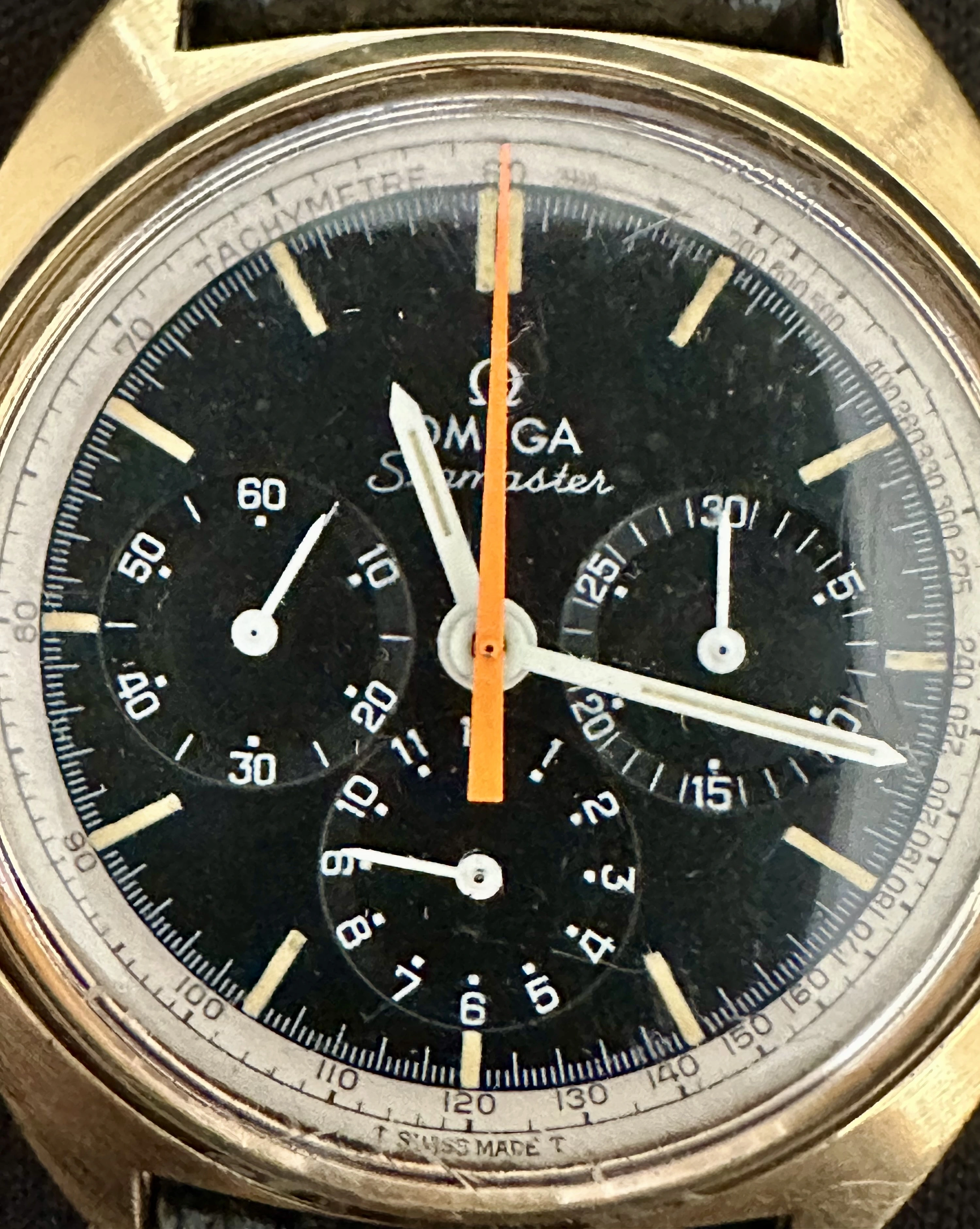 I think it’s an Omega Seamaster Chronograph 145.006 321 Orange Hand 1966, but I don’t find any with Gold case like this one they are all stainless steel casing ??
