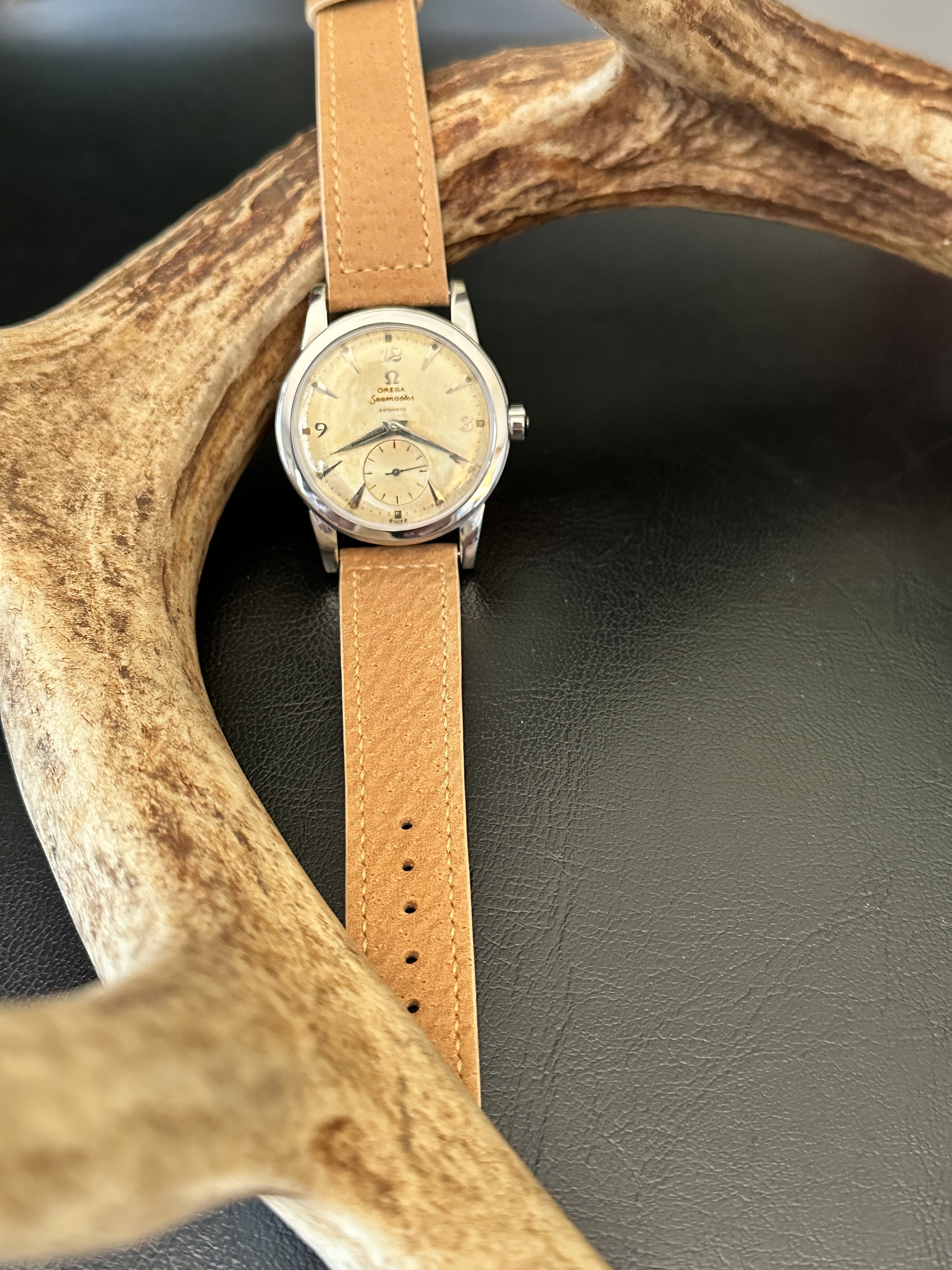 ·I’m looking for another strap to add to the wearing rotation for my 1952 Seamaster. The pics show the cream colored dial and the strap it’s currently on, but I’d like to broaden my choices to a darker, and a bit thicker leather as an option to change up the look from time to time. Here are three options from the Veblenist site. Input welcomed and requested. Thanks!