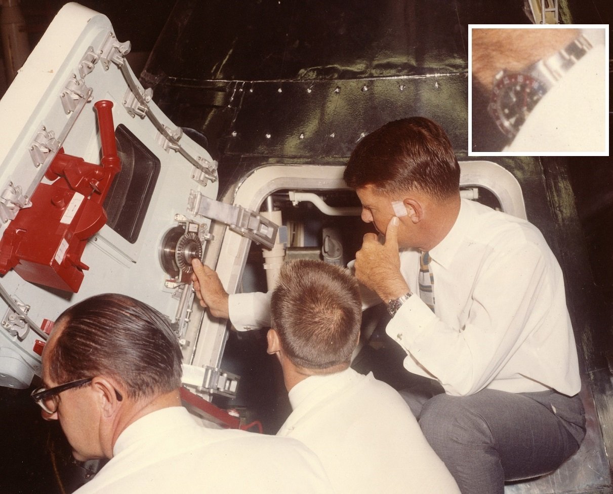 ... the very first photo I got in my hands showed Major General cosmonaut Andriyan Nikolayev wearing a Rolex GMT-master pilot watch while sitting in a Soyuz simulator with NASA astronaut Thomas "Tom" Stafford. (Photo: NASA)
