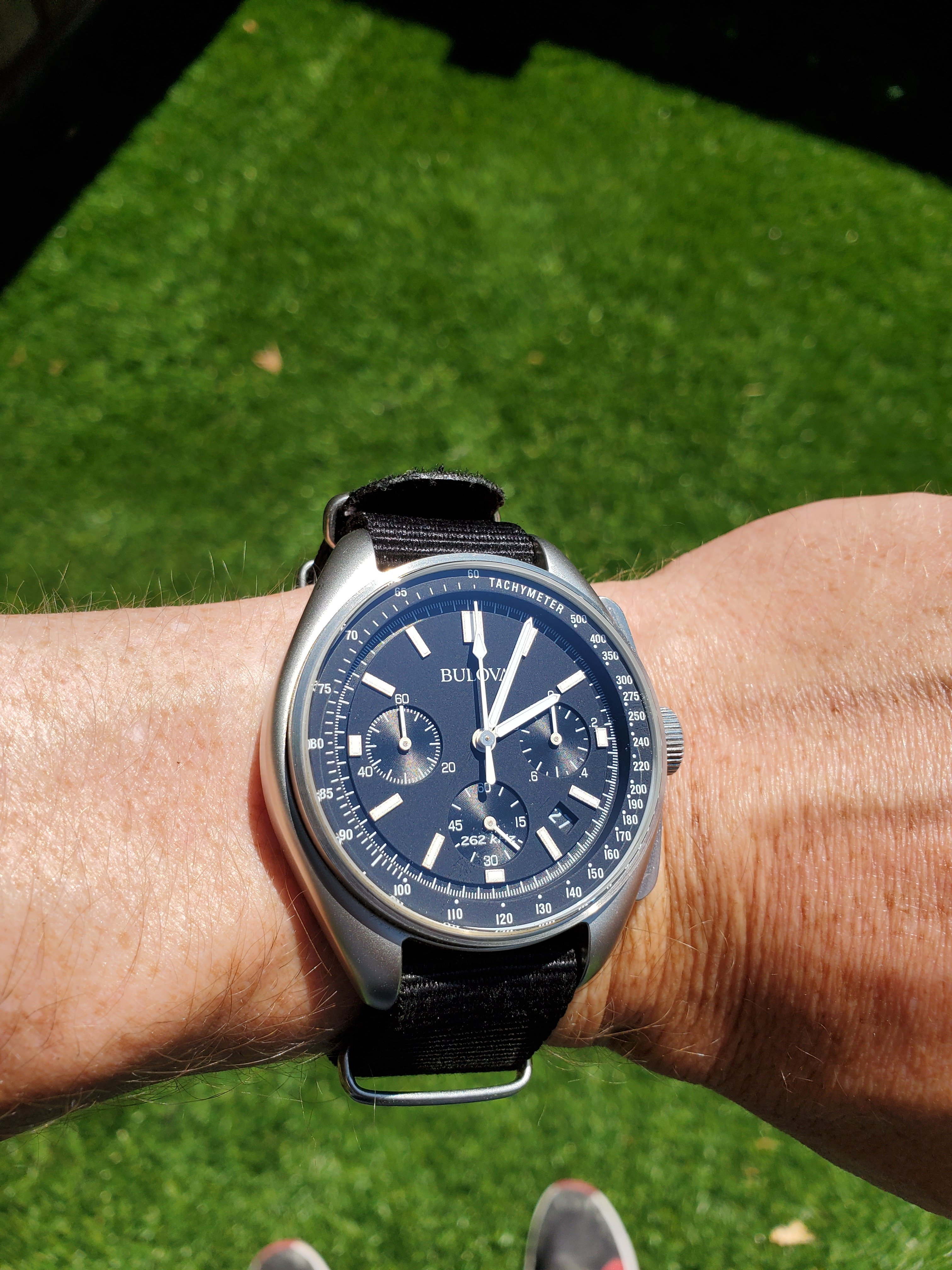 路Cleaning out the drawers this past weekend(not those drawers), and rediscovered a Bulova Lunar Pilot I had kept in the box, bought over 2 yrs ago. I'm not a fan of quartz in general, but I liked the idea of the technology (262khz) and the commemorative nature of it (Apollo 15). I think I wore it a couple times when I got it and its been in the box since.