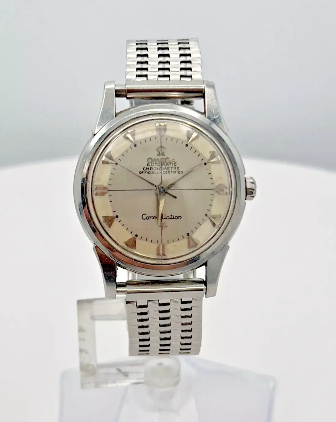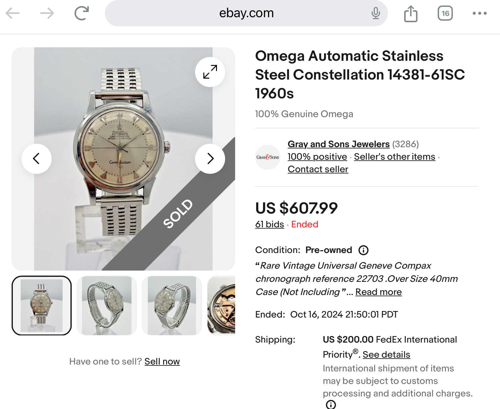 Terrible redial, wrong crown and, although not shown, I'd wager real money that the case back medallion is polished out of existence -- and it already has 50 bids on it. The seller also can't seem to decide whether this is an Omega Constellation or a Universal Geneve Compax. Moral: do your homework before buying, not after.
