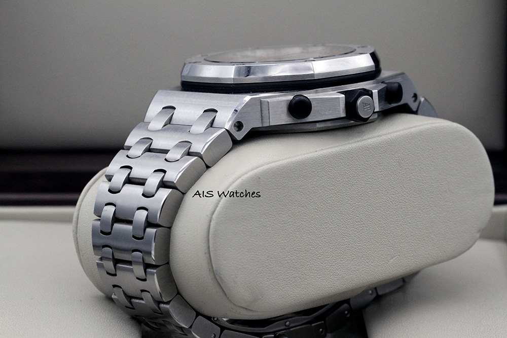 Up for sale is an Audemars Piguet 26170ST Royal Oak Offshore SS White Panda Dial 42MM H Series. The timepiece is in good condition for its age and comes with a stainless steel bracelet.
