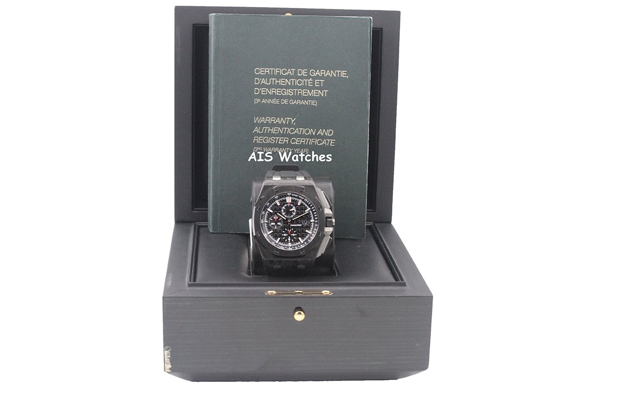 Up for sale is an Audemars Piguet Audemars Piguet 26400AU.OO.A002CA.01 Royal Oak Offshore 44MM Ceramic/Forged Carbon Box & Papers. The timepiece is in excellent condition.