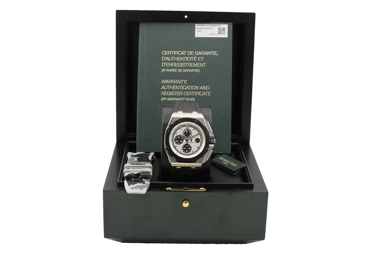 Up for sale is an Audemars Piguet Royal Oak 26400SO.OO.A002CA.01 Panda Offshore Chrono 44MM Silver Dial B&P. The timepiece is in excellent condition.