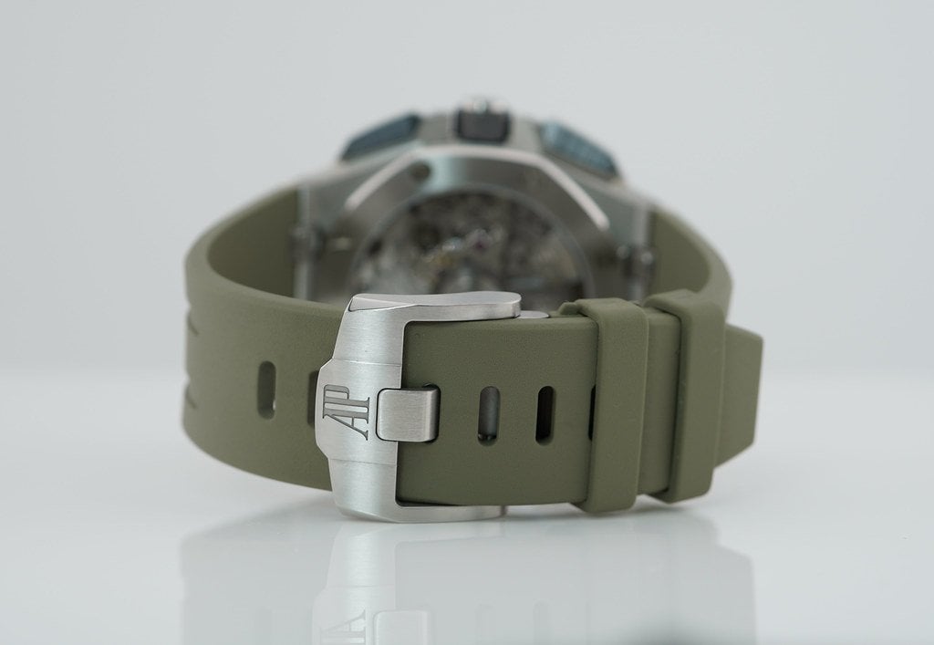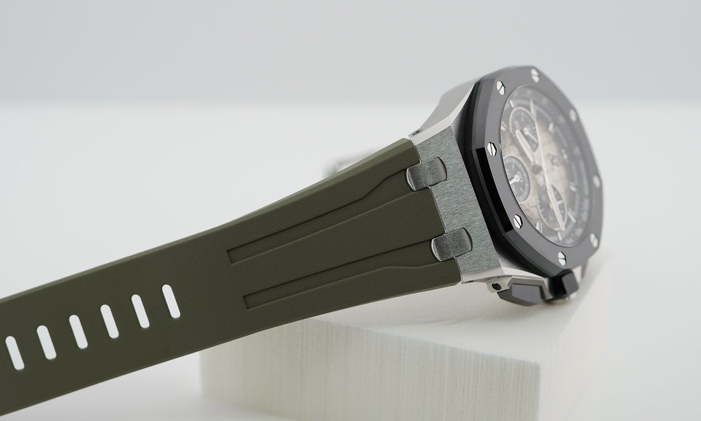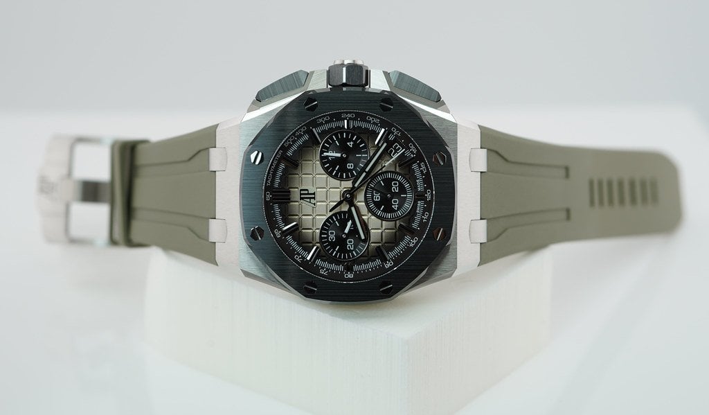 A Mint, Unpolished Condition & Very Beautiful New Model 2022 43mm Audemars Piguet ROO 26420 Stainless Steel Case with Black Ceramic Bezel & Smoked Taupe Dial. Its on Light Brown Strap with Stainless Steel Pin Buckle and Interchangeable Strap System. Purchased from Audemars Piguet Boutique in 11.2022. Watch Running Perfect with Non Issues. Complete Set with Additional AP Black Rubber Strap. Under 5 Years Factory Warranty.