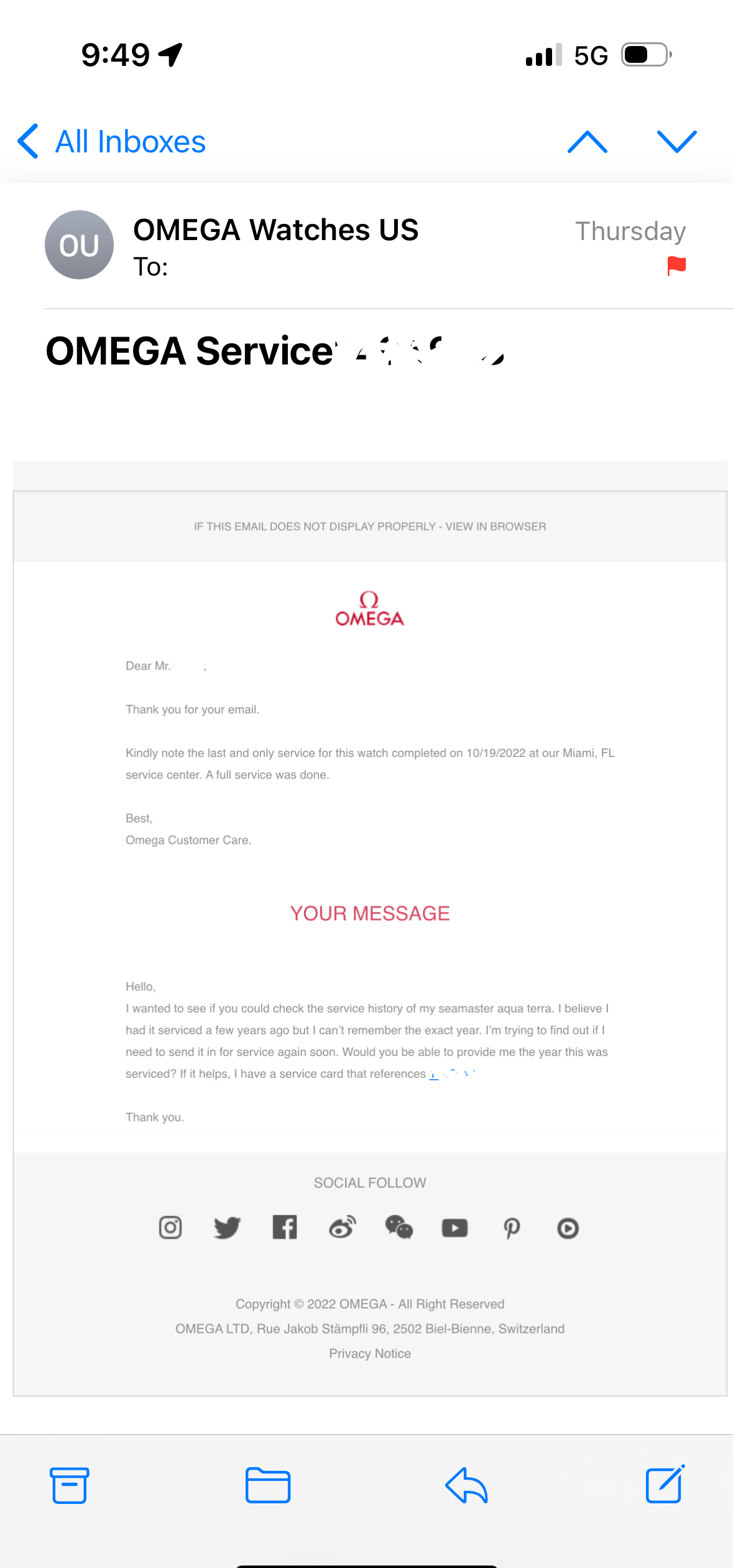 I was told the watch was serviced in 2022, so I contacted Omega to inquire about the watch’s last service since I have the service card and service reference number. Omega has you provide the watch reference number and serial number when sending the question as well. Omega confirmed the watch was last serviced in 2022 and had a full service (Omega response attached). I think this explains the spare parts that were returned considering this is a 2500B movement. If I’m not mistaken, Omega has been upgrading the 2500A and 2500B movements to the 2500D movement because of the issues in the A and B.