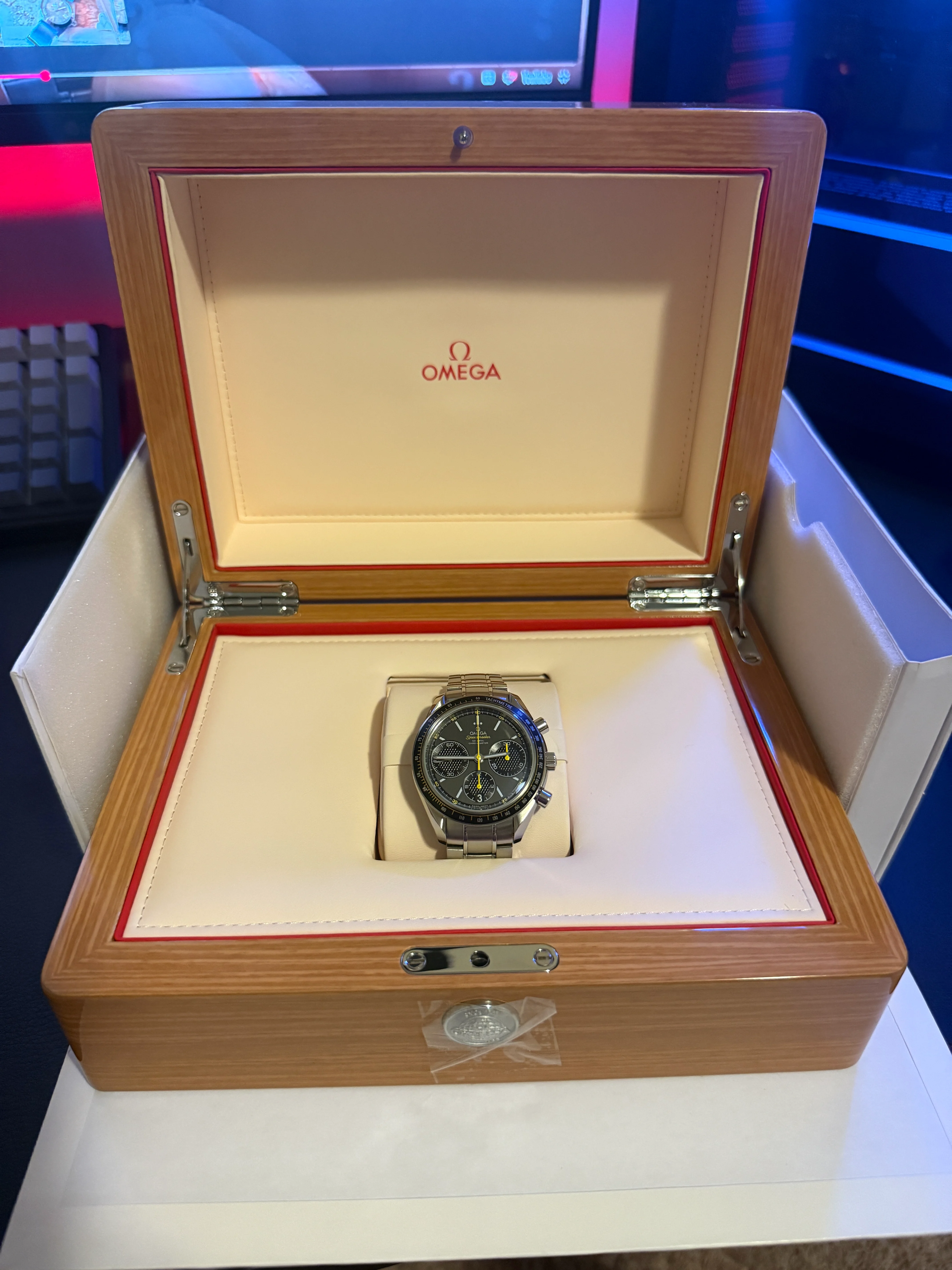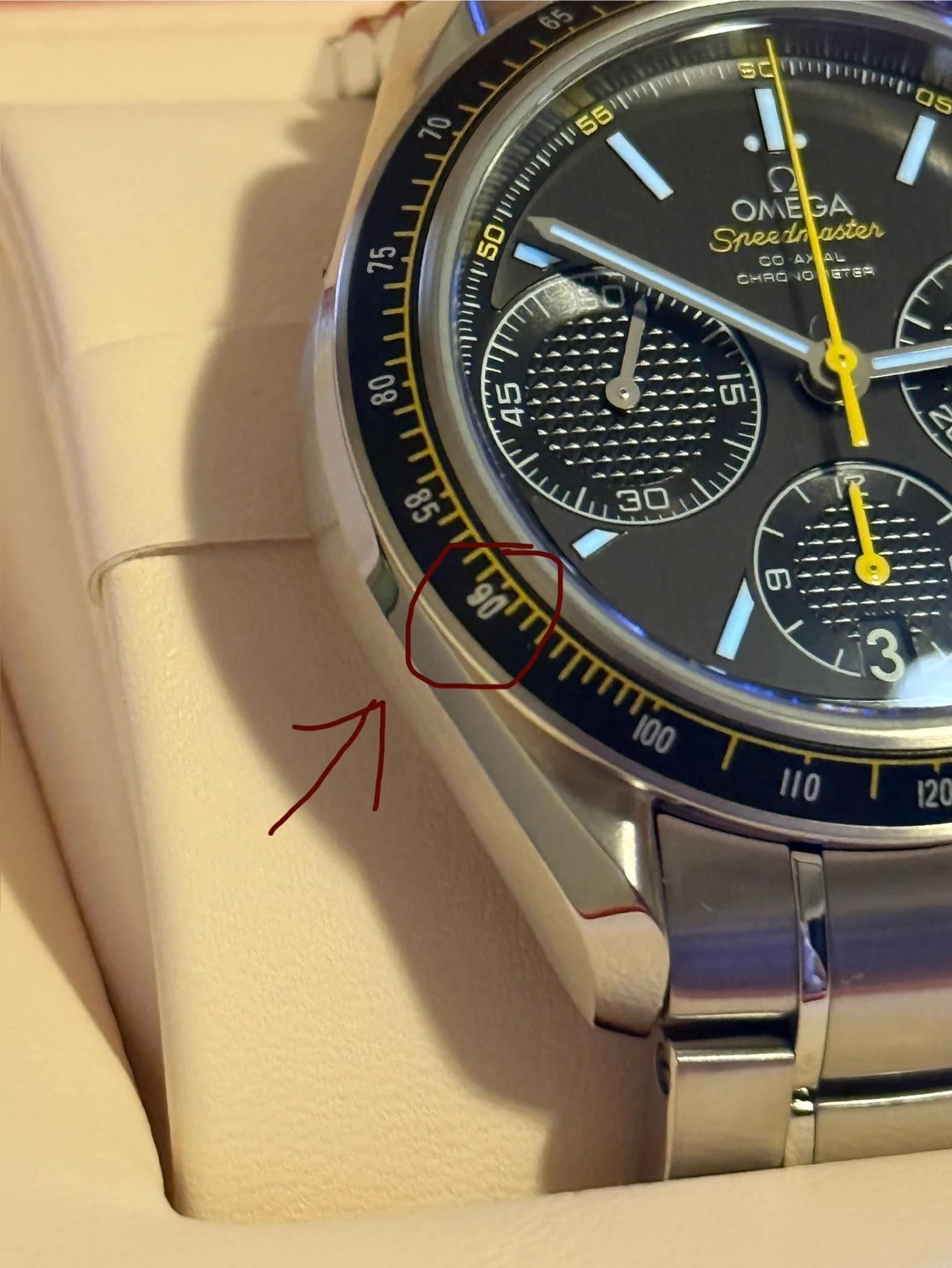 ·Picked up this Omega Speedmaster racing from my trusted local pawn shop. Came full set and appears to be in unworn condition with the exception of light showcase/handling scratches. I got a pretty good deal on it but not good enough to necessarily raise any red flags. Ive been over the watch with a bright light a few times and everything feels/looks good to me HOWEVER.... I noticed the "90" circled in red on my second photos appears a bit off. The top of the 0 bleeds upwards a bit which has caused slight concern. The 9 also looks a bit wonky. Im still within my return window. Im still erring on the side that its okay and maybe just some wear or a factory defect. Any feedback is greatly appreciated. Thank you!