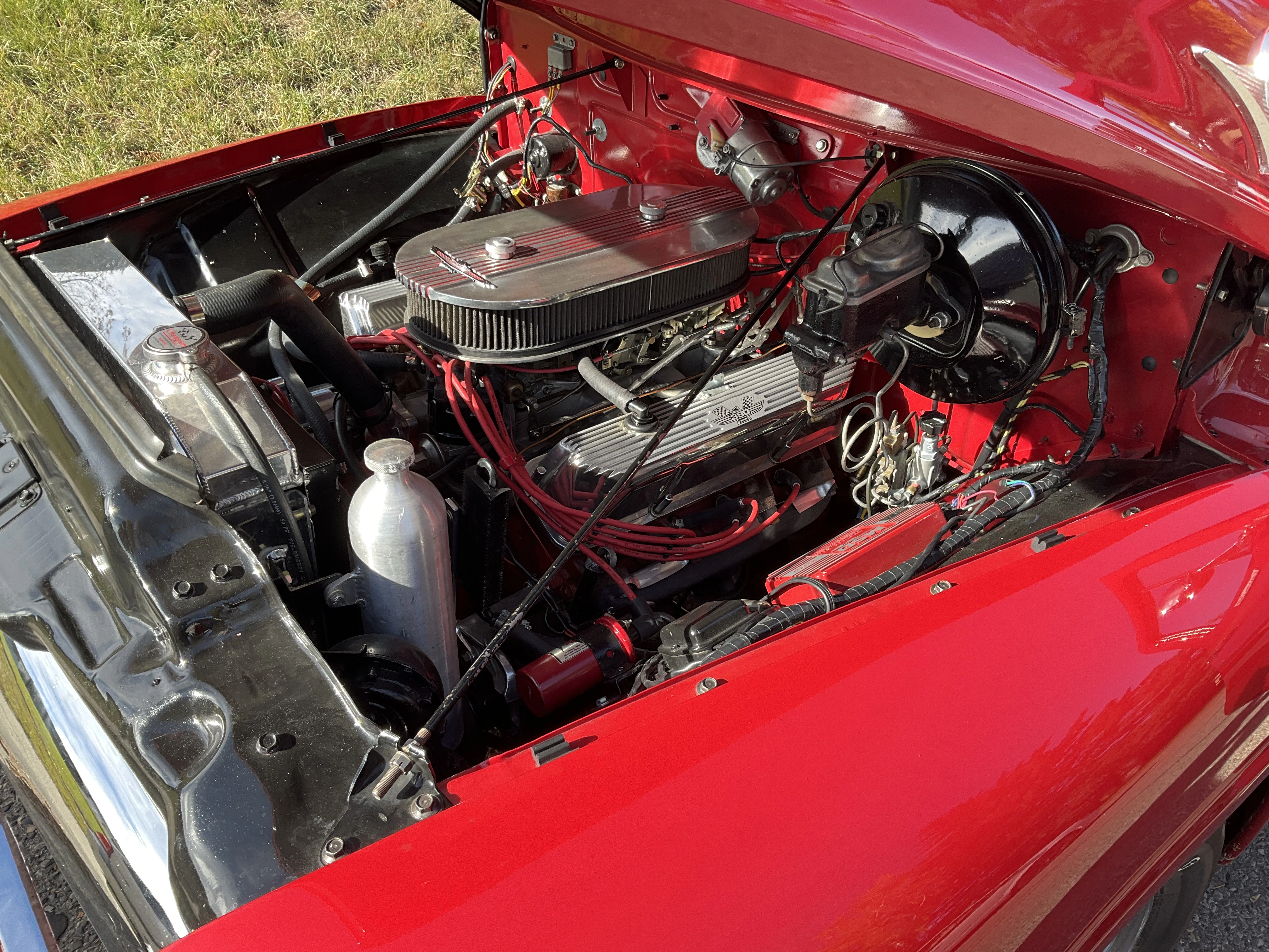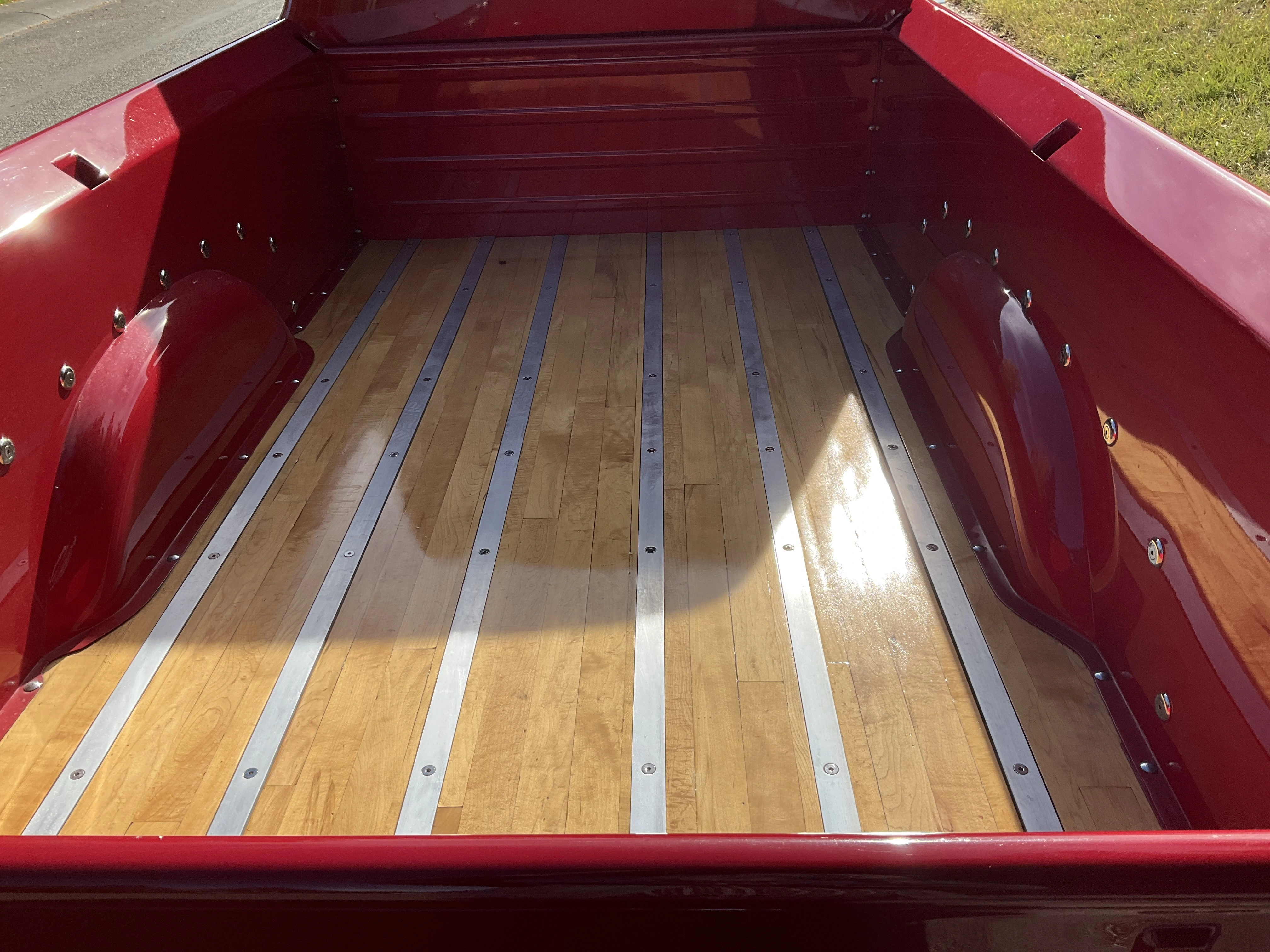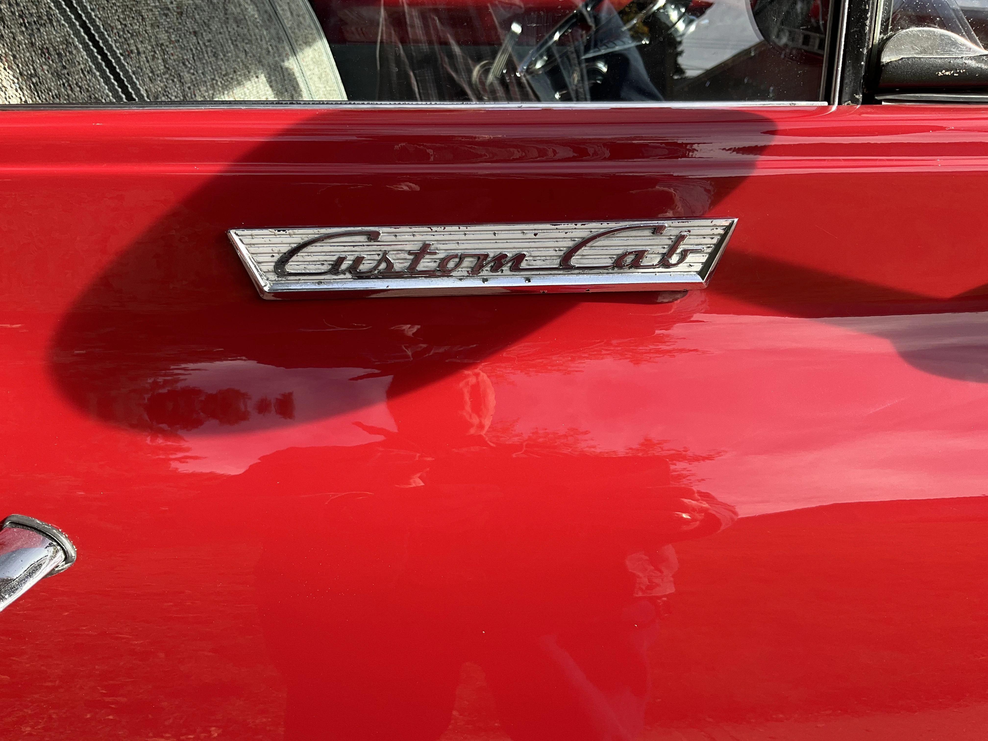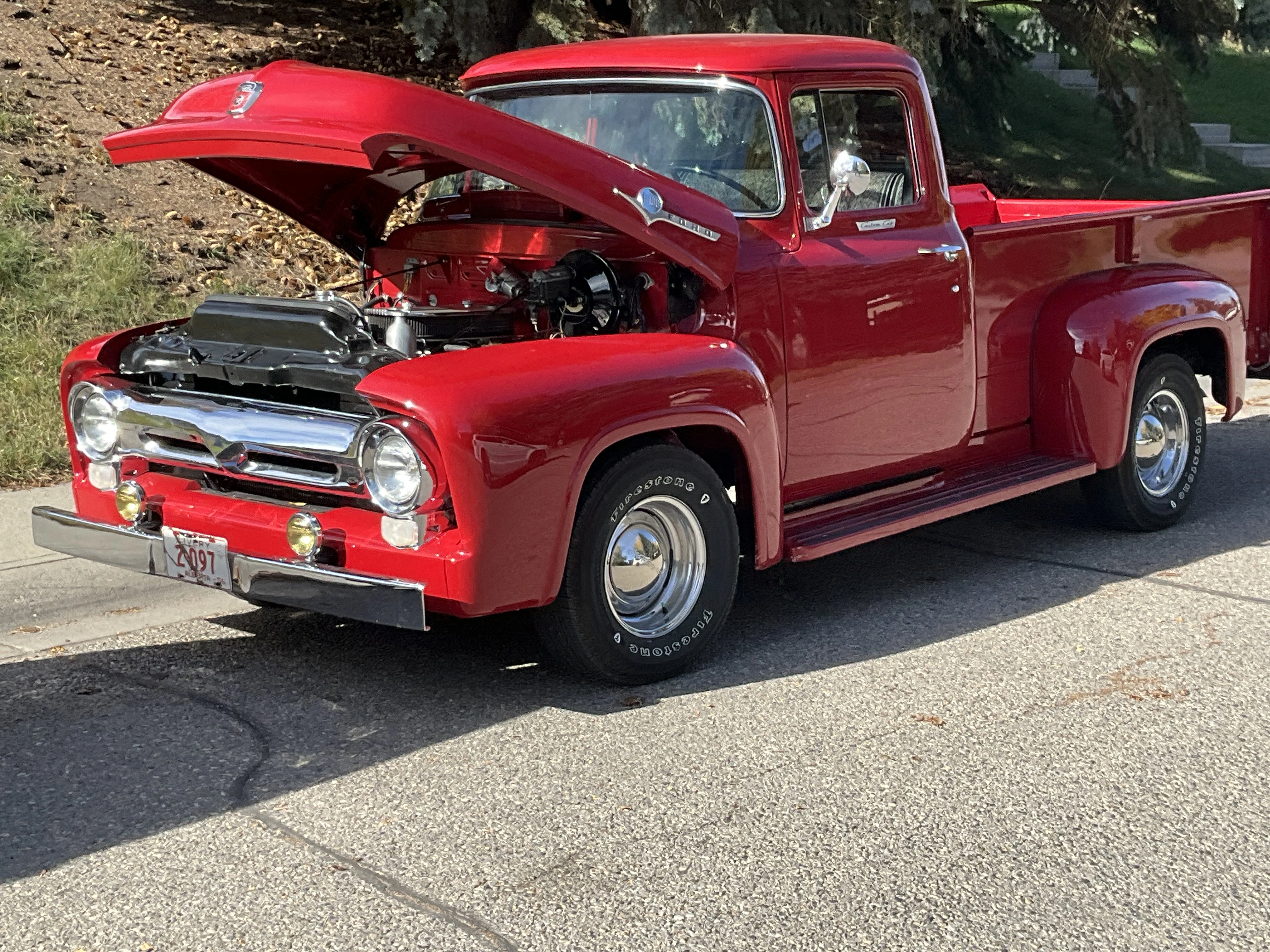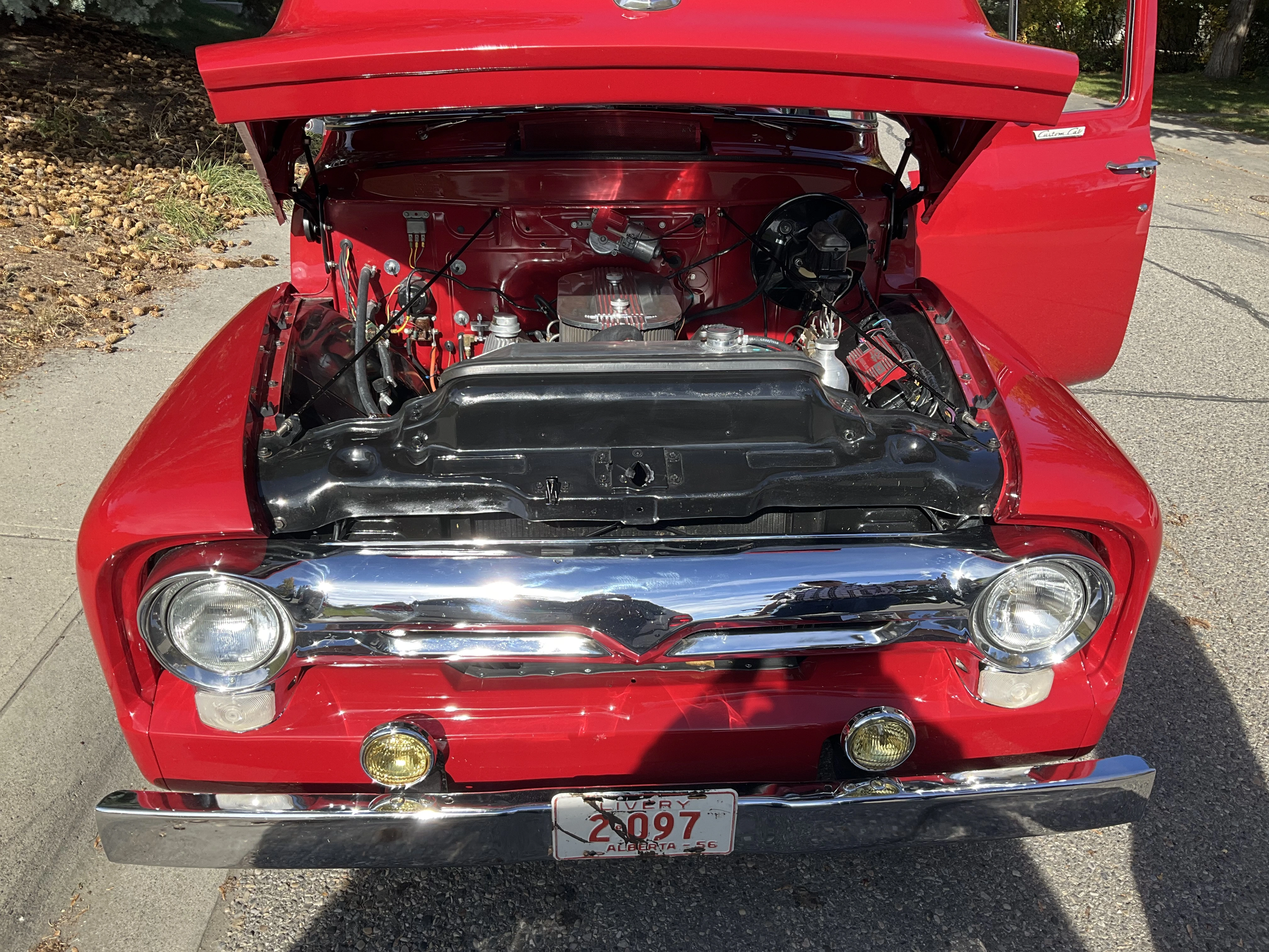 A friend stopped by today with his 1956 Ford half-ton. This truck was previously owned by a guy who spent about 40 years slowly building it into his dream truck. After he passed away, his widow sat on it for several years before she decided my friend should have it. The engine is a 390 ci V8 out of a ‘67 Thunderbird. It has a rare 3-2 barrel carb set up, custom aluminum valve covers, an ignition system of his own design, C-6 automatic transmission, more modern Ford differential, disc front brakes, drum rear brakes. The box is partly new and partly original. Stock suspension all around. Paint is a 1970 Datsun colour, custom blended, and $1,000 a gallon. Maple box floor made of wood from the gym floor of a demolished 100 year old school. All new chrome. My friend has been working on this project for 15 years, and it is now complete.
