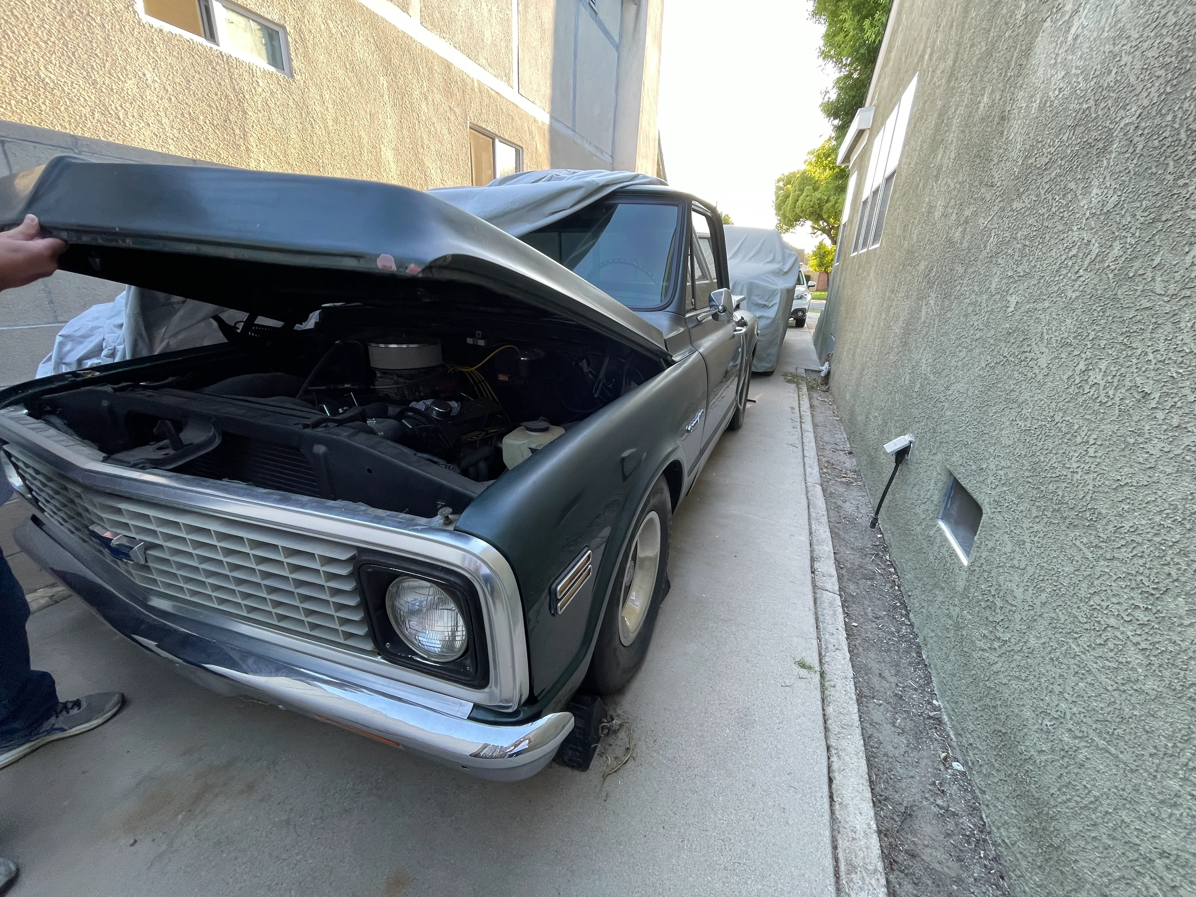 A week or two later, after doing some research online, I decided to go knock on the buyer's door and see if either he still had the truck or if he could share where it went. I arrived at the house, walked up to the stoop, knocked on the door, to which a short in stature woman opened the door. I shared who I was and that I was looking for so and so who had purchased a C10 from my father in-law to which she quickly replied, "Oh yeah, that's my husband, let me get him." A few moments later the door reopened and the gentleman who had bought the truck re-opened the door. I quickly explained the story of why I was knocking on the door and asked if he knew the whereabouts of the truck. He smiled, pointed his hand down his driveway, and said, "The truck is right there under that car cover." I almost couldn't believe my ears. After all these years, here it was less than a mile from my house.