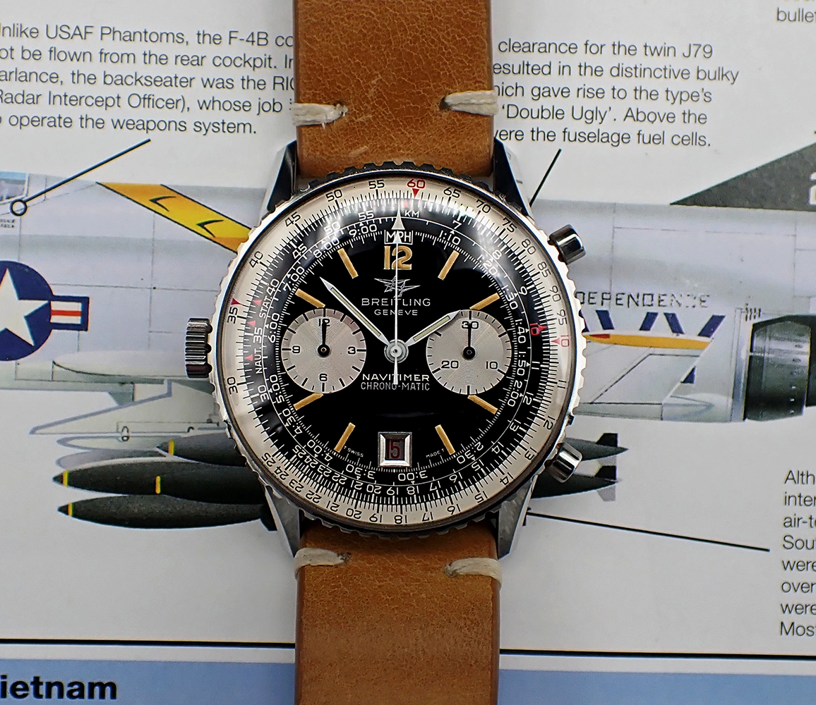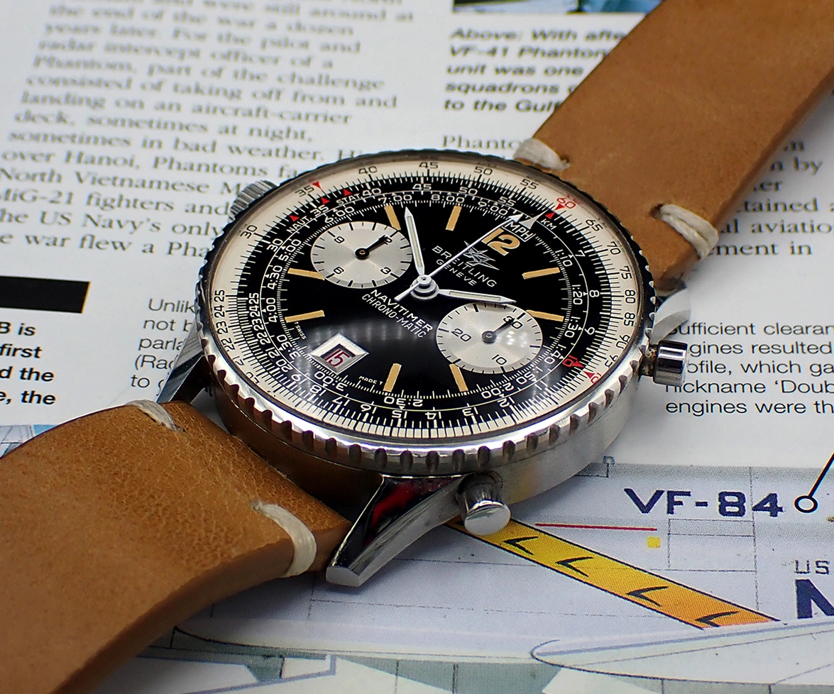 ·This beautiful Navi came to me in near NOS condition and, having worn it frequently but carefully, the unpolished 41mm steel case is still easily in Excellent+ condition, with razor sharp chamfers and lovely satined sides. This is a fantastically pure vintage tool watch with great wrist presence and panache, as well as a model you’re not likely to see on someone else’s wrist. To put the cherry on top of the sundae, this great Breitling retains its original gloss black dial in absolutely Minty condition. Featuring two silver-white engine turned sub-registers, gorgeous puffy tan tritium luminous “12” & bar markers and intricately printed slide rule calibrations in silver “gilt”, this fantastic dial really shows off Breitling’s unmatched prowess at creating highly functional, complexly printed dials back in the day.