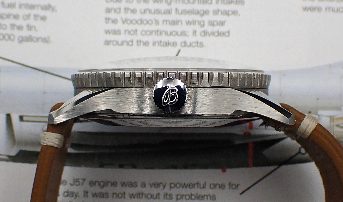 BEZEL: The heavy steel rotating bezel with big, chunky serrations is Near Mint with only light marks and sharp, well-articulated knurling. The slide rule insert is quite bright white and crisp with no water damage and bright red numerals for “60” and “10". The bezel itself rotates in both directions with firm finger pressure and good resistance, as designed, and stays right where you want it to be lined up when you’re making important calculations.