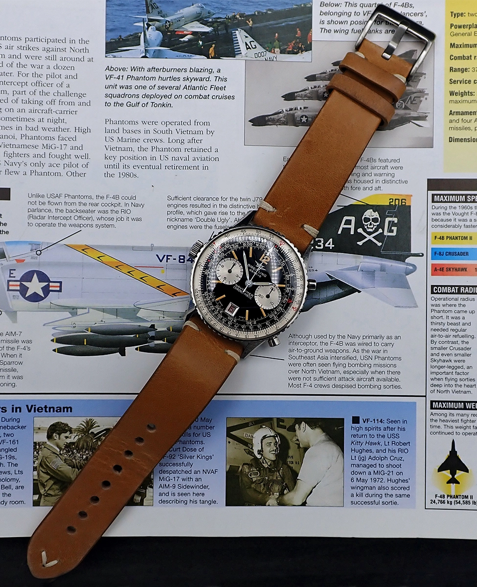 STRAP: This cool Navitimer comes on a rugged and thick pilot-style tan leather strap with white stitching and generic brushed steel buckle. It has been worn a bit and is delightfully distressed, IMO, and also features quick release spring bars. This big watch has a lug width of 22mm.
