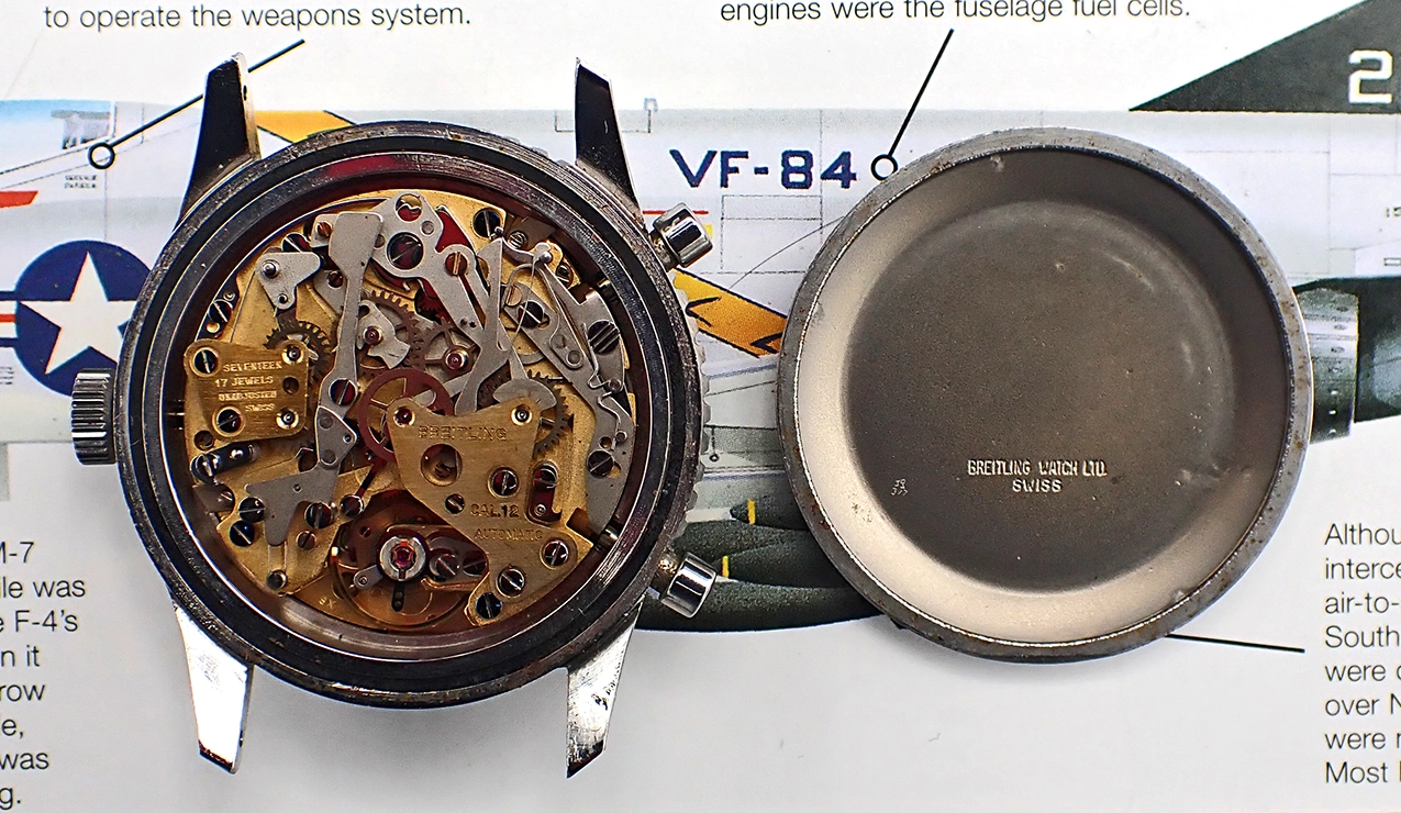 MOVEMENT: Under the hood is Breitling’s Caliber 12 auto wind chronograph movement with 17 jewels, shock protection and all the correct Breitling nomenclature of the era on the bridges and beneath the balance. This pioneering modular chronograph has a bright and handsome golden brass finish to most of its parts, which is correct for the later production Caliber 12. I had this watch overhauled some years back and it still has a decent power reserve, keeps good time and the semi-quickset date change (by moving the hands back and forth between around 9pm and midnight). All chrono functions are also working properly, of course, and returning to zero.