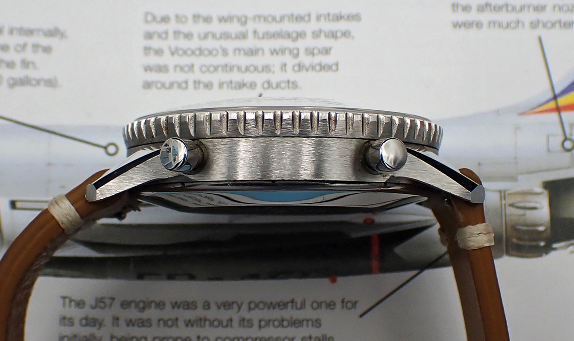 CROWN & PUSHERS: The signed Breitling steel crown is found on the left, as in all Chronomatics, and is very clean, undamaged and in Near Mint original condition. It sits tightly to the case, winds smoothly and pulls out to the time-setting position as it should. Both chrono pushers on the rights side of the case are likewise Near Mint and work as they should, with crisp stop-start from the top one and clean reset with the bottom.