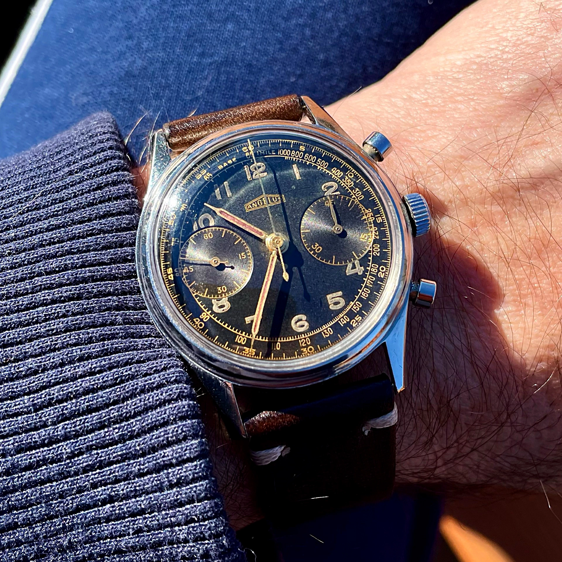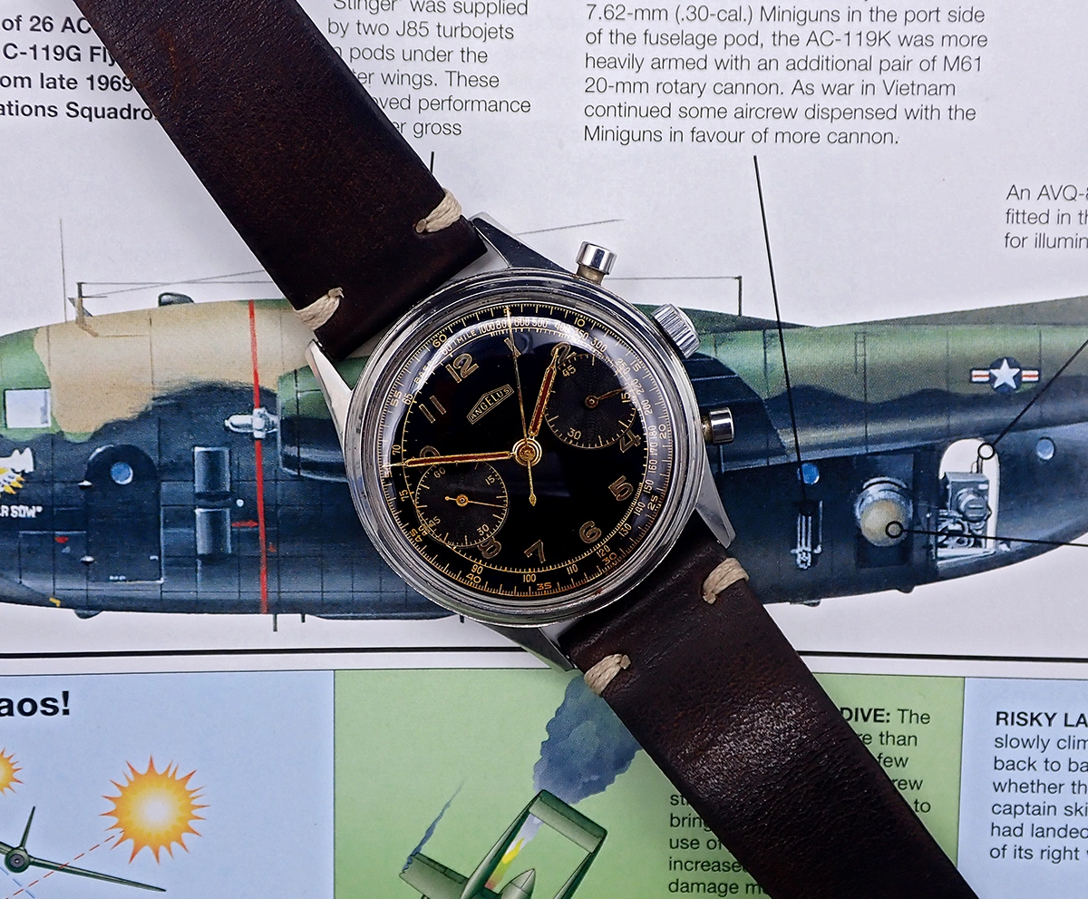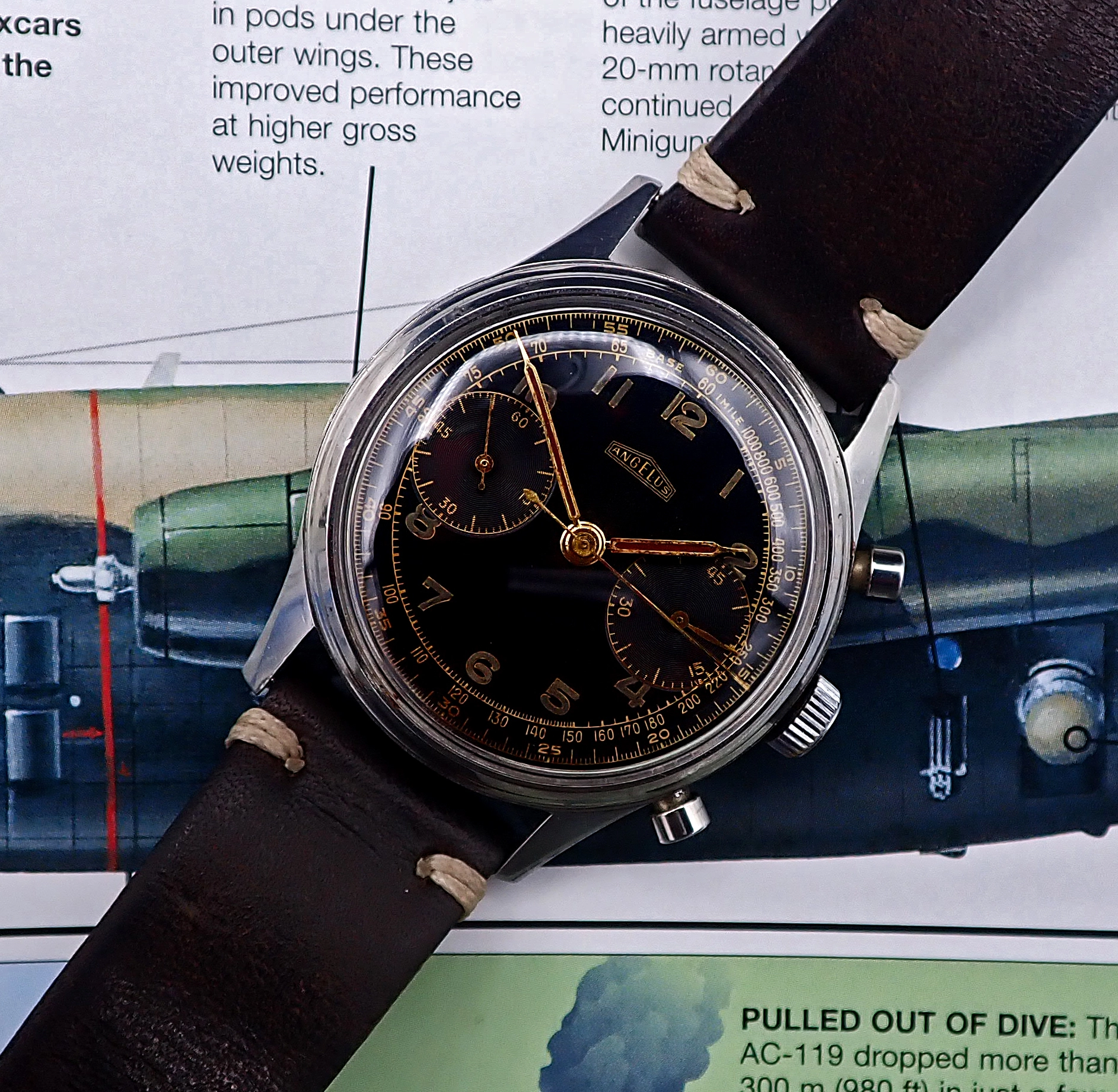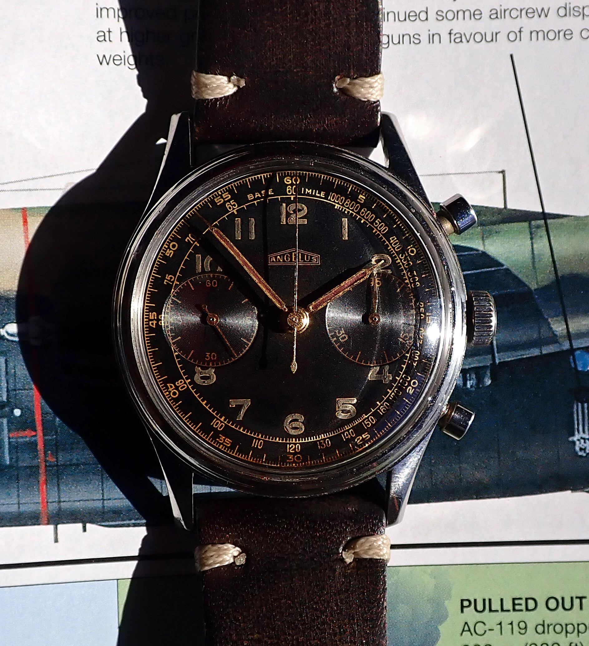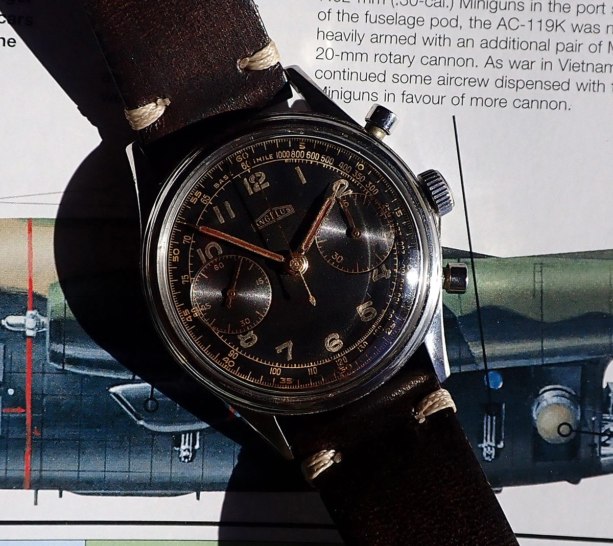 ·Up for sale is this large and beautiful circa 1940s-50s Angelus chronograph in all-stainless steel case with stunning dark brown tropical gilt dial, powered by the in-house Angelus cal. 215 movement. A famed maker of movements for others, Angelus came into their own in the middle of the twentieth century, when the demand for chronographs for military and civilian use reached a fever pitch. In addition to their famed Chronodato models, Angelus also produced aviator & military-style chronographs to meet the demand of the WWII and post-War era, like this one, which is exactly the same model as the “L.E.” marked Hungarian Air Force-issued version. This example has no issue marks but is notable not only for the large and sought after 38mm case but the stunning original gilt dial with “big eye” sub-dials and original radium luminous Arabic numerals that has also aged to a very beautiful and even deep brown tropical tone. This oversized Angelus military-style chronograph is pure vintage charm on the wrist.