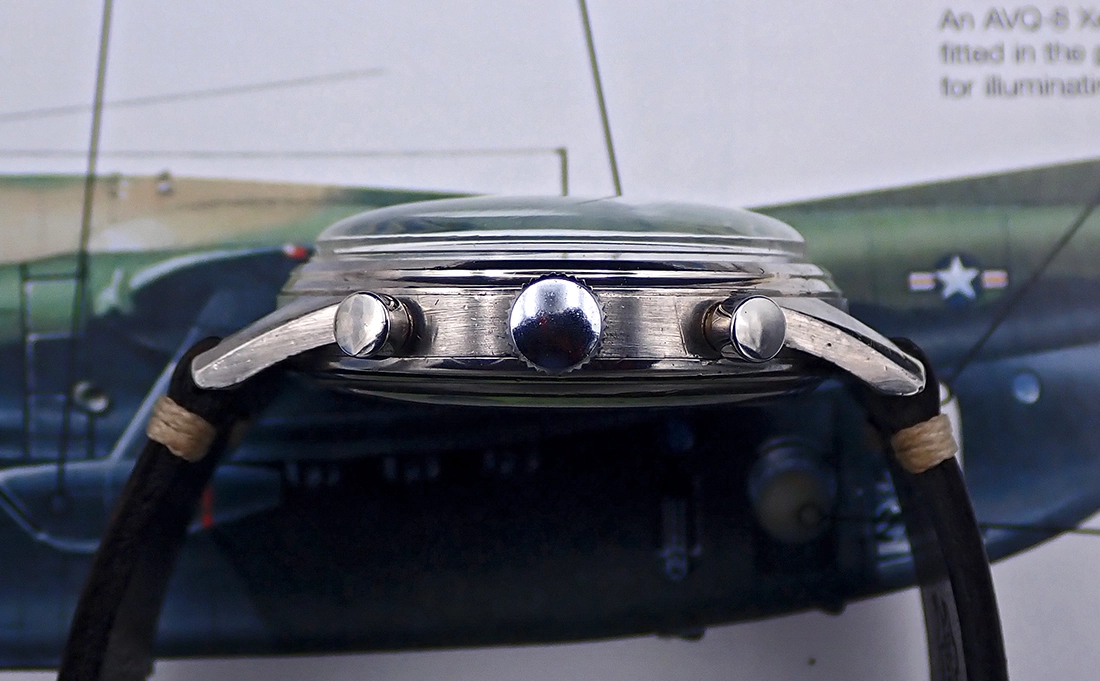 CROWN & PUSHERS: Oversized unsigned steel-clad crown might be a service replacement, as it just has that appearance to me. But it matches the watch just fine, is in Excellent cosmetic condition and operates perfectly well, winding the movement and setting the time when pulled out as designed. The smallish pusher caps show only minor wear and, as is most common, the top pusher starts & stops the timer and the bottom resets it. The operation of both pushers is quite crisp and all counters reset to zero with firm finger pressure on the bottom pusher.