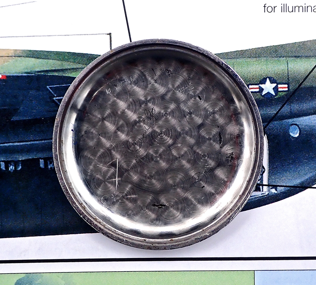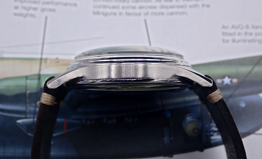 CASE & BACK: Classic all-stainless steel two-piece chronograph case with faceted lugs and integrated stepped bezel measures an oversize 38mm wide (not including crown) by 45mm long by around 12mm tall to the top of the crystal This case is kind of a hybrid water resistant case with round pump pushers but a snap back, exactly like the “L.E.” models issued to the Hungarian Air Force (for Légi Erő). The case shows wear and marks from the years, particularly to the side where one pries open the back, but the original brushed matte finish appears present on the sides and the polished faceted lugs and stepped bezel are all very crisp - Excellent condition for a more than 70-year-old tool watch. The exterior of the shiny snap-in caseback shows some light marks, likewise Excellent cosmetic condition, with all external nomenclature - ANGELUS logo, complete serial number & “Acier Inoxydable” - present and crisp. The inner back and the back of the case have minimal corrosion and the inner caseback does not have any branding or hallmarks, merely the original attractive perlage finish and some watchmakers’ marks from different years of service.