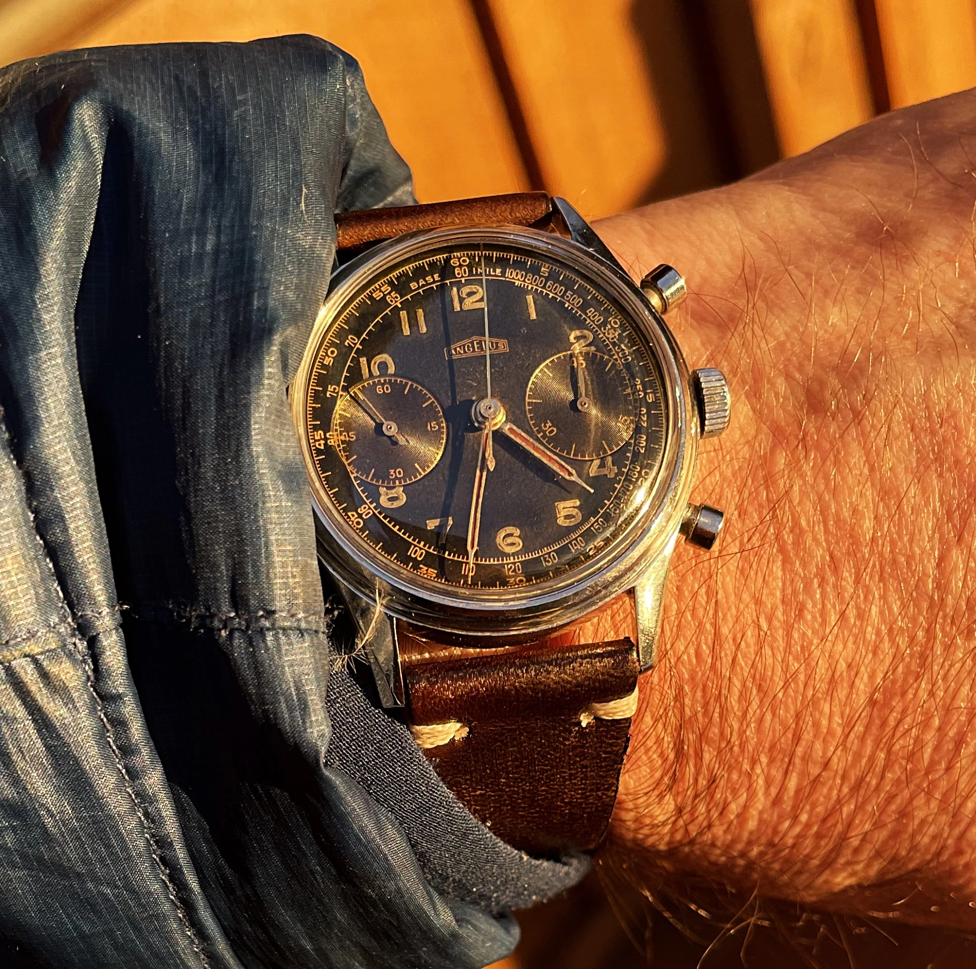 DIAL & HANDS: All-original and absolutely stunning gilt dial with complex outer calibrated minute/seconds and Tachymeter scales that has aged to wonderfully warm dark chocolate tone best admired in sunlight. This dial also features large, “big eye” engine-turned sub registers for constant seconds at “9” and the 45-minute recorder at “3”, also with gilt numerals. The original red lines for the three three-minute markings have faded with time but can still be made out under close inspection. This handsome dial is very clean with only minor signs of aging to the surface and all the original radium luminous material still present on the Arabic numerals. Overall, Excellent+ original condition for this wonderfully warm and complex vintage git chronograph dial. Original gold “syringe” hour & minute hands are Excellent and are aged a bit darker/more brown than the lume on the dial -- while they react similarly to the dial under UV light, I now believe they may have been stabilized/touched up at some point with another luminous compound other than their original fill. Still very handsome in appearance regardless and they really do glow pretty much the same way as the dial. The gold sweep seconds chrono hand two gold subdial hands are likewise Excellent. This Angelus military-style chrono represents beautifully on the wrist and the organic, even, warm dark chocolate tone is especially appealing.