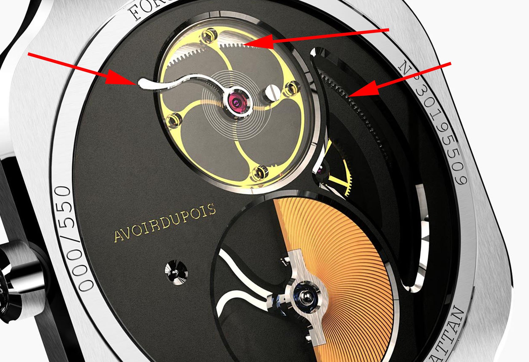 However, just looking at the movement construction, I don't see how this movement would actually function. Where is the barrel? Where is most of the gear train and escapement? What's the giant wheel that you can see behind the balance wheel. There is no shock-absorber/cap jewel on the balance.