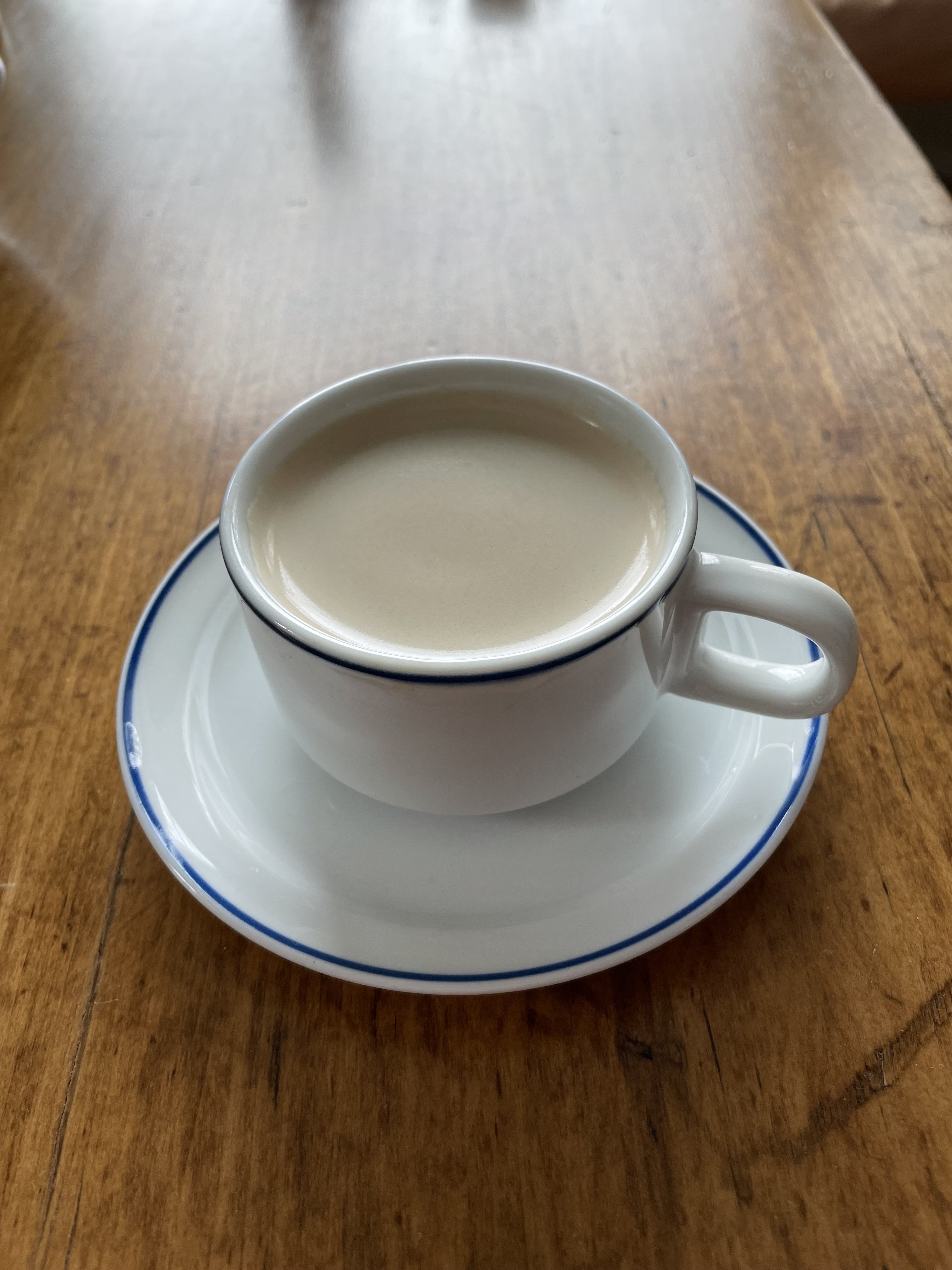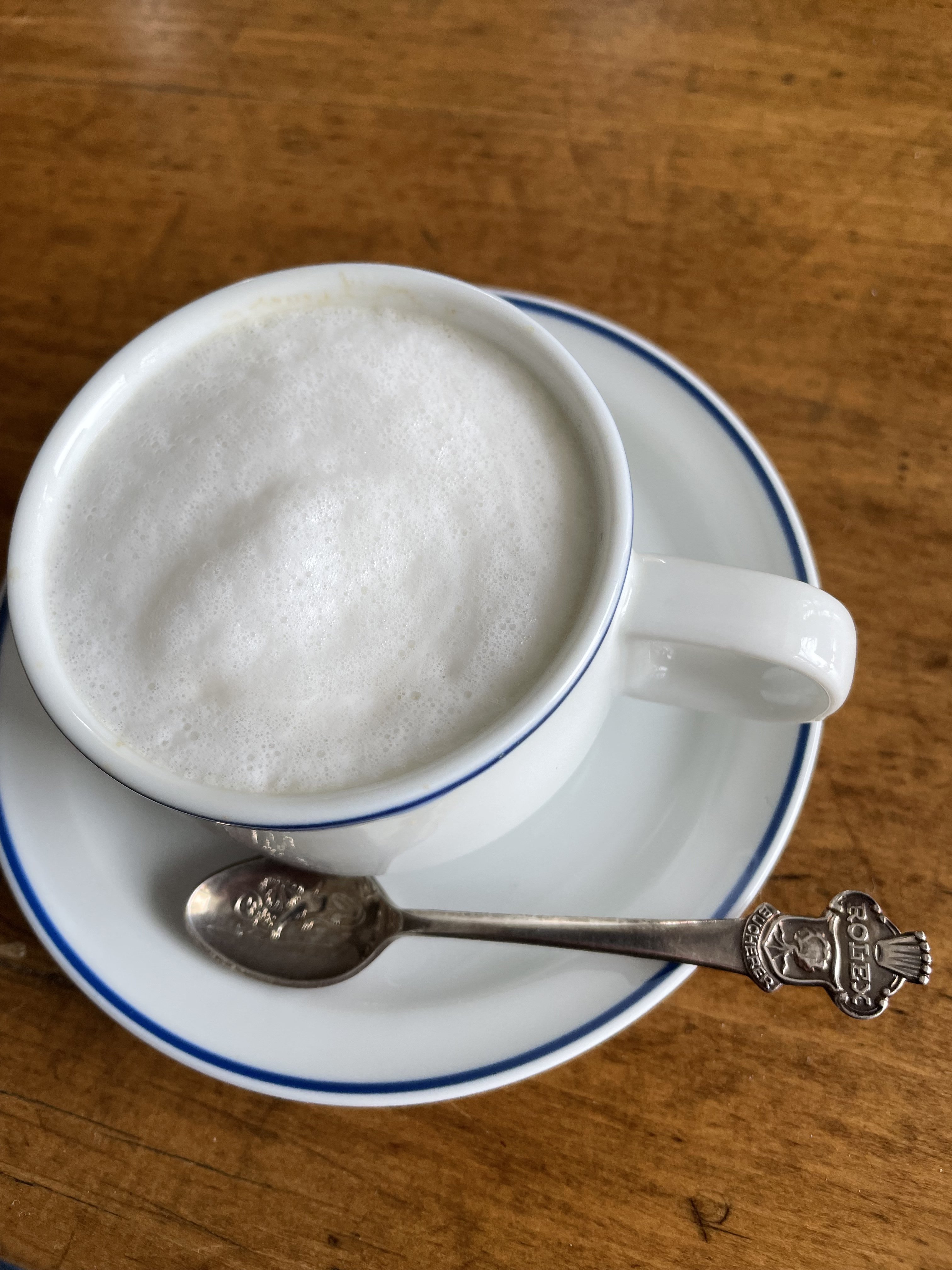 The VIPs. One of the cups and saucers and a latte for my wife, plus another with my coffee. The spoon. Have a very nice day. Share any memories of early or upscale travel.