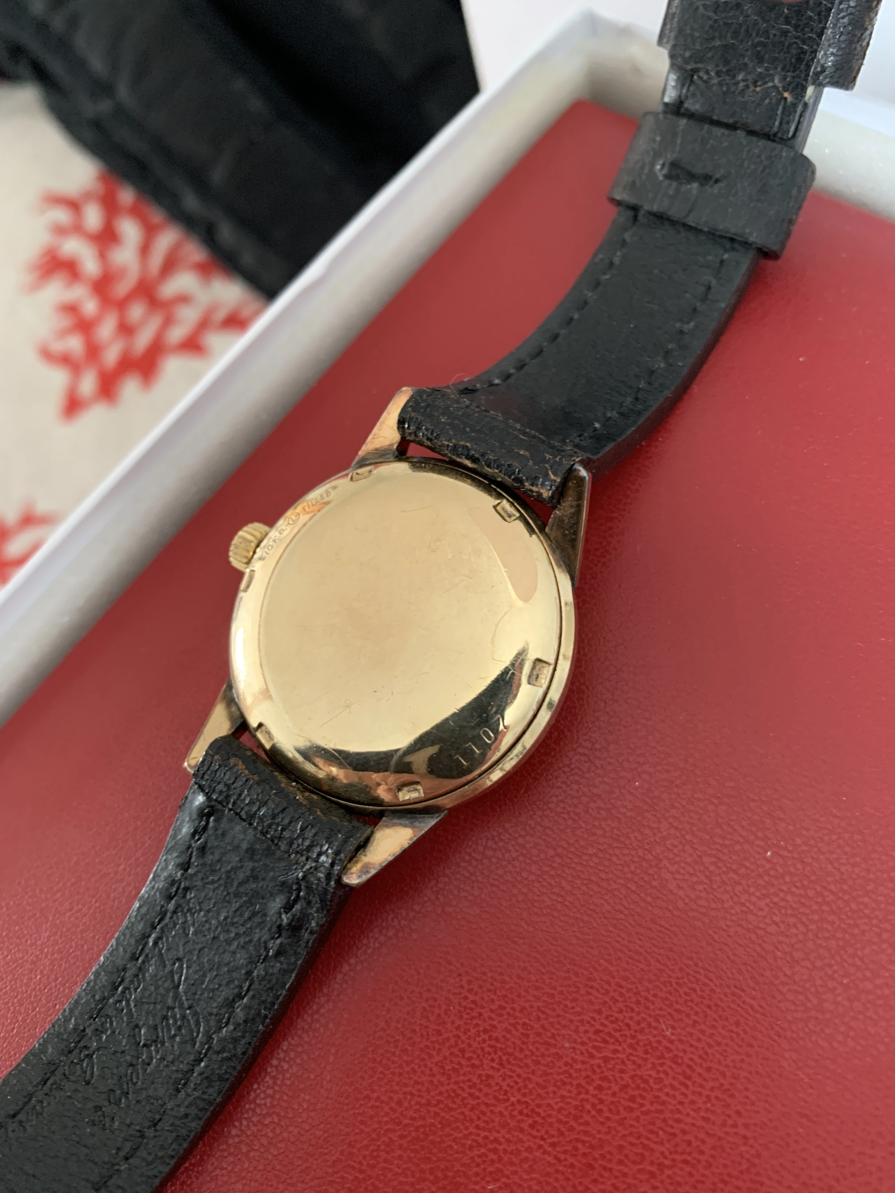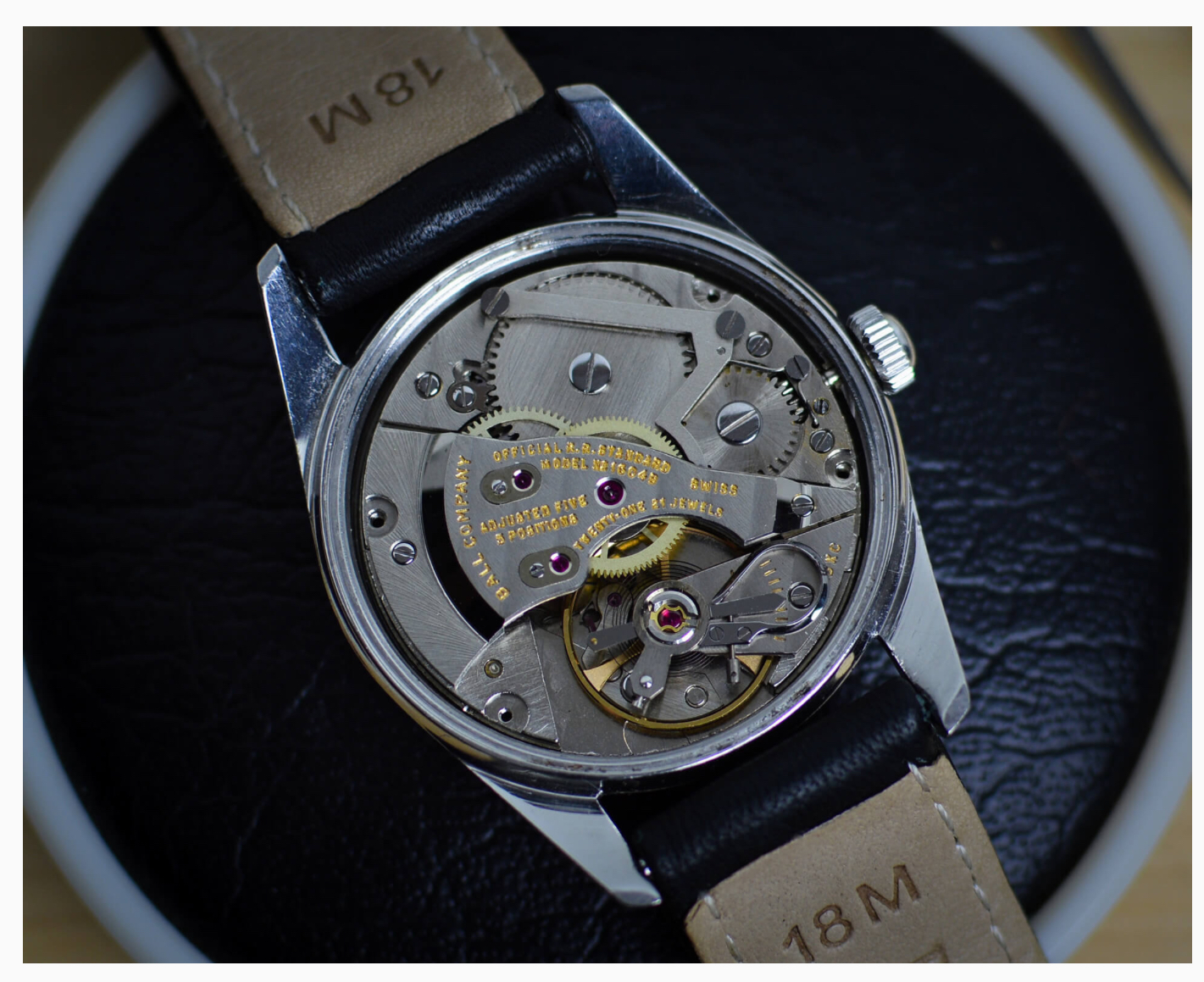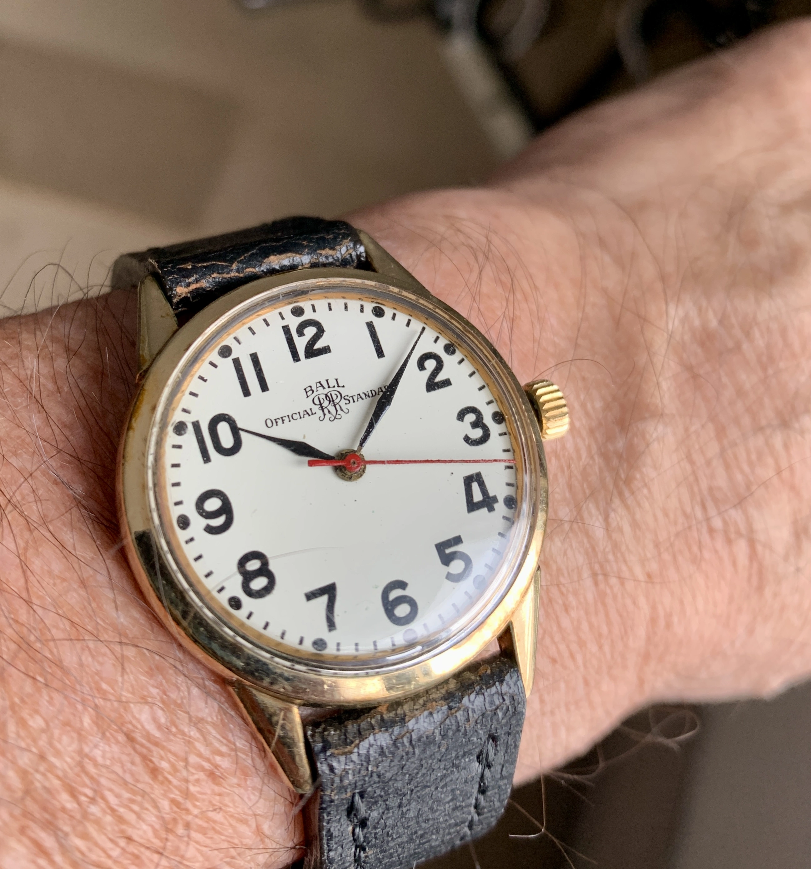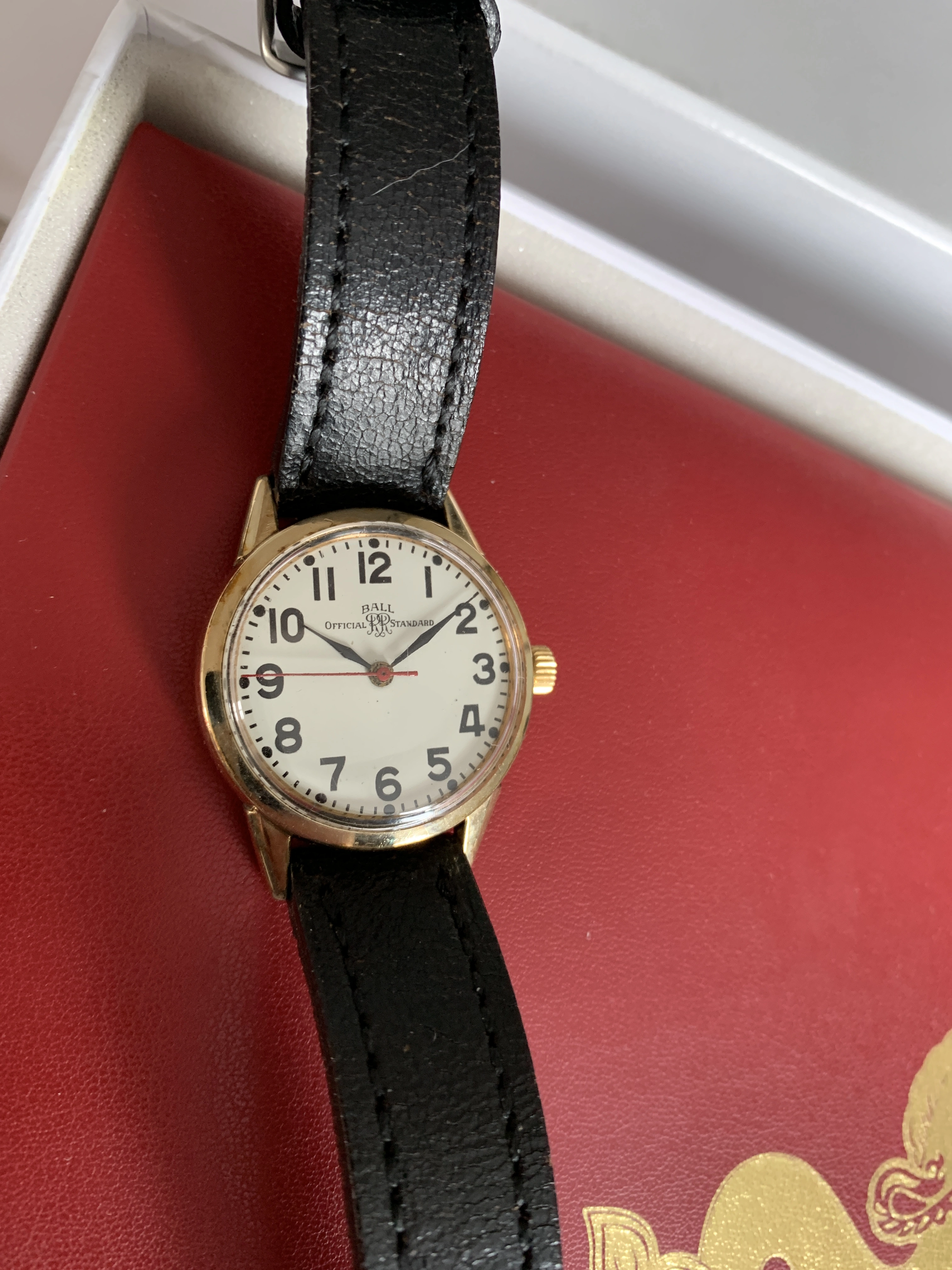 Selling this very pleasant Ball Official Railway standard from the late 50s early 60s based on my research. Couldn’t open the case back but this watch is certainly powered by the adjusted 21 jewel movement. The hacking movement runs accurately and sets as it should. Not serviced in my possession so please consider having a competent watchmaker service it for years of pleasure. The 10k gold filled case measures 34 mm without the crown. I think the beautiful creamy dial makes this piece pop. Base back #1107 also bears the “10k gold filled” markings.