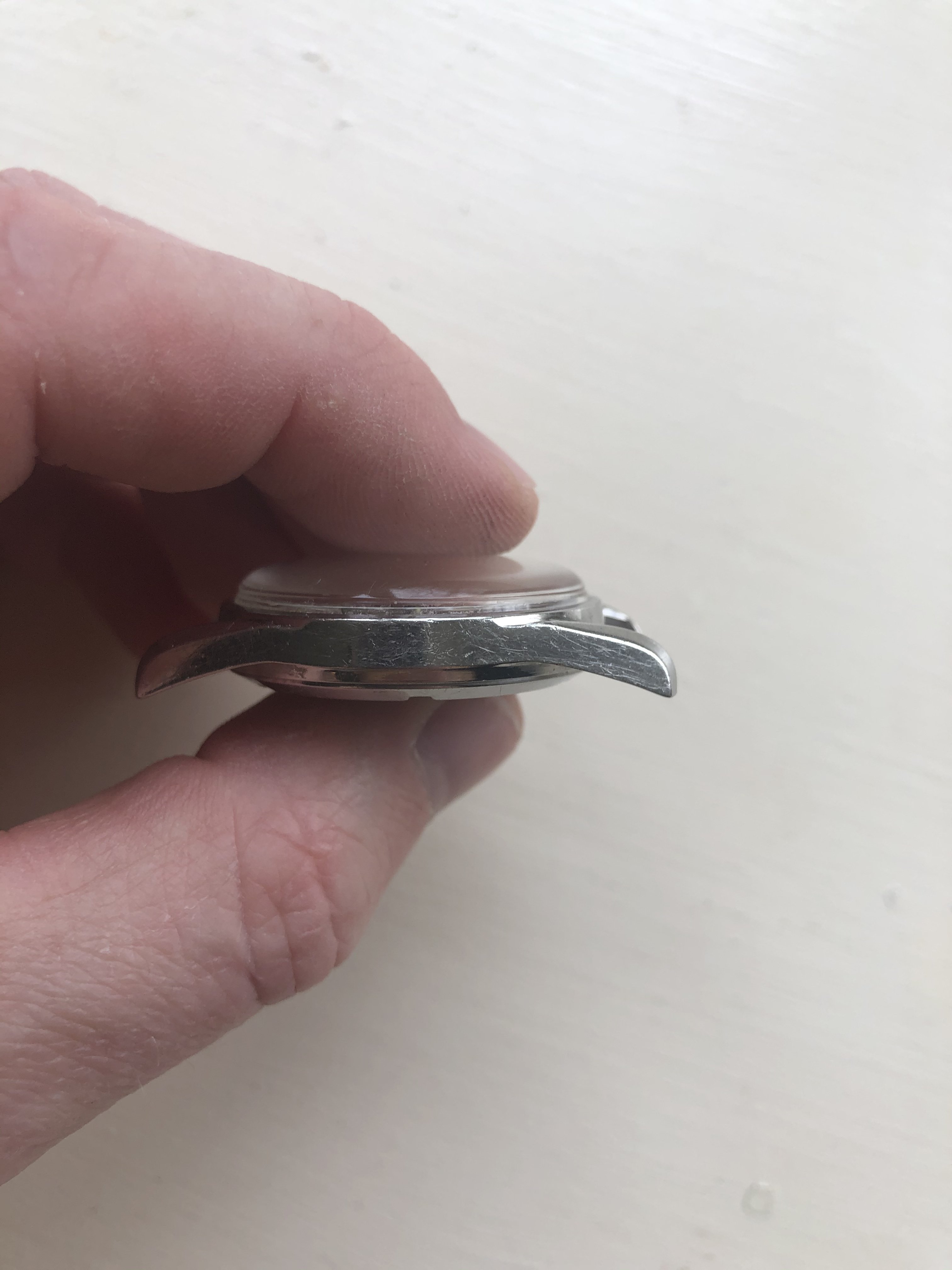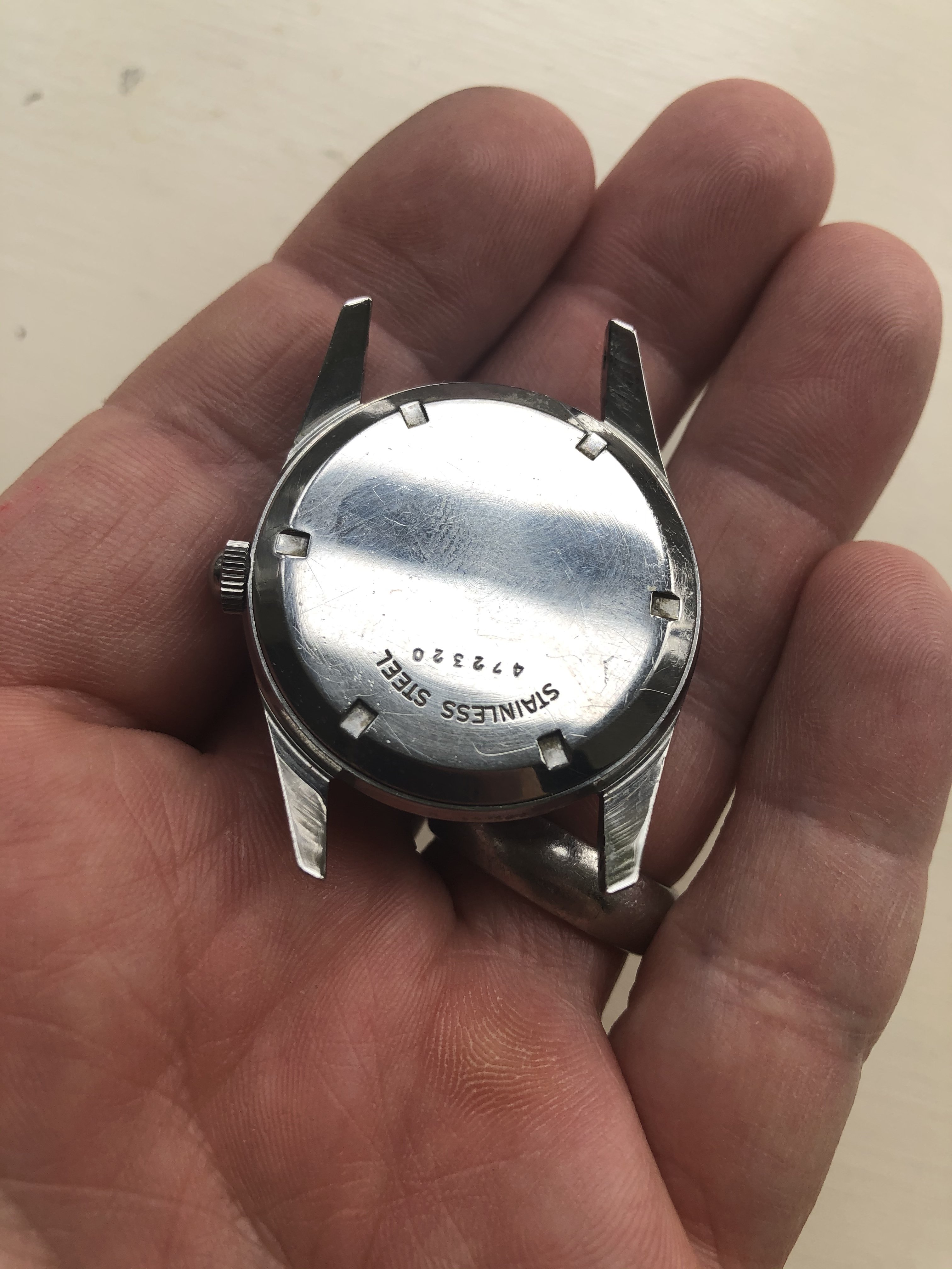 Case: 34.5mm stainless screwback case with bombe lugs in very good condition. 18mm lugs. Very similar to UG Polerouters of the era.