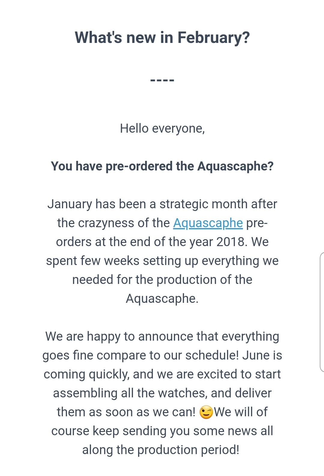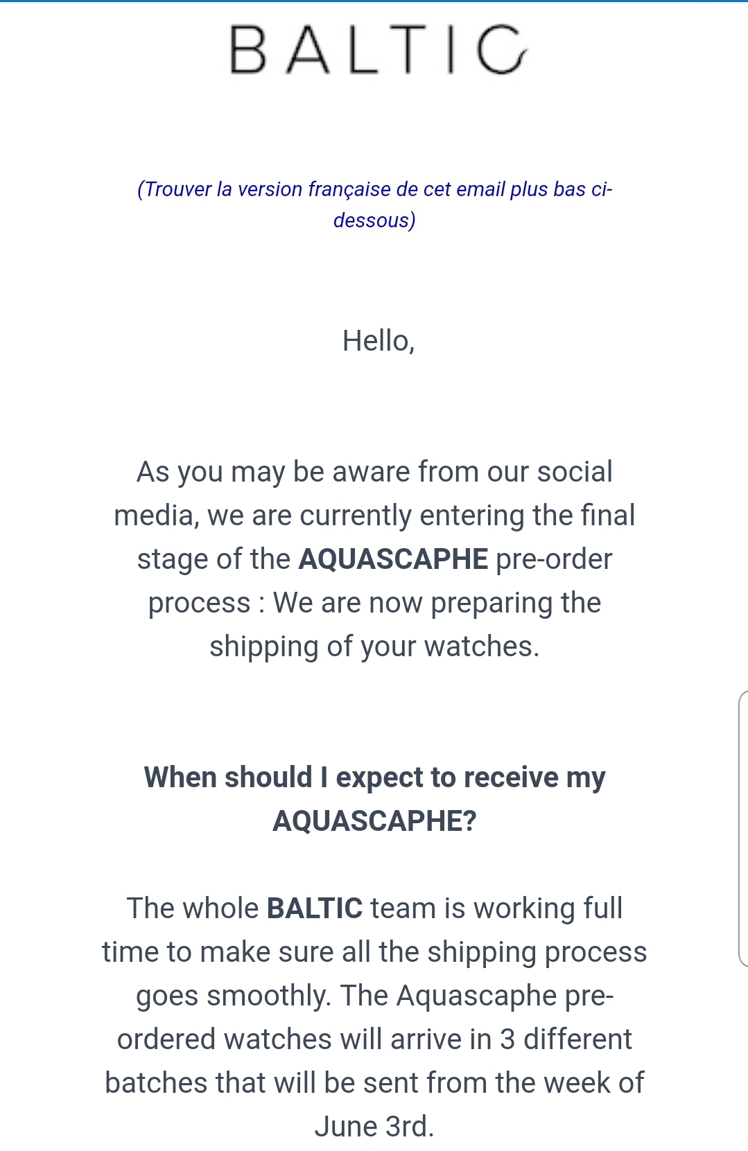 Still sounds like June to me... PS: Sending my Bi-Compax to Central Watch in NYC ...Their repair place. Baltic was very responsive. Chrono hand issues....