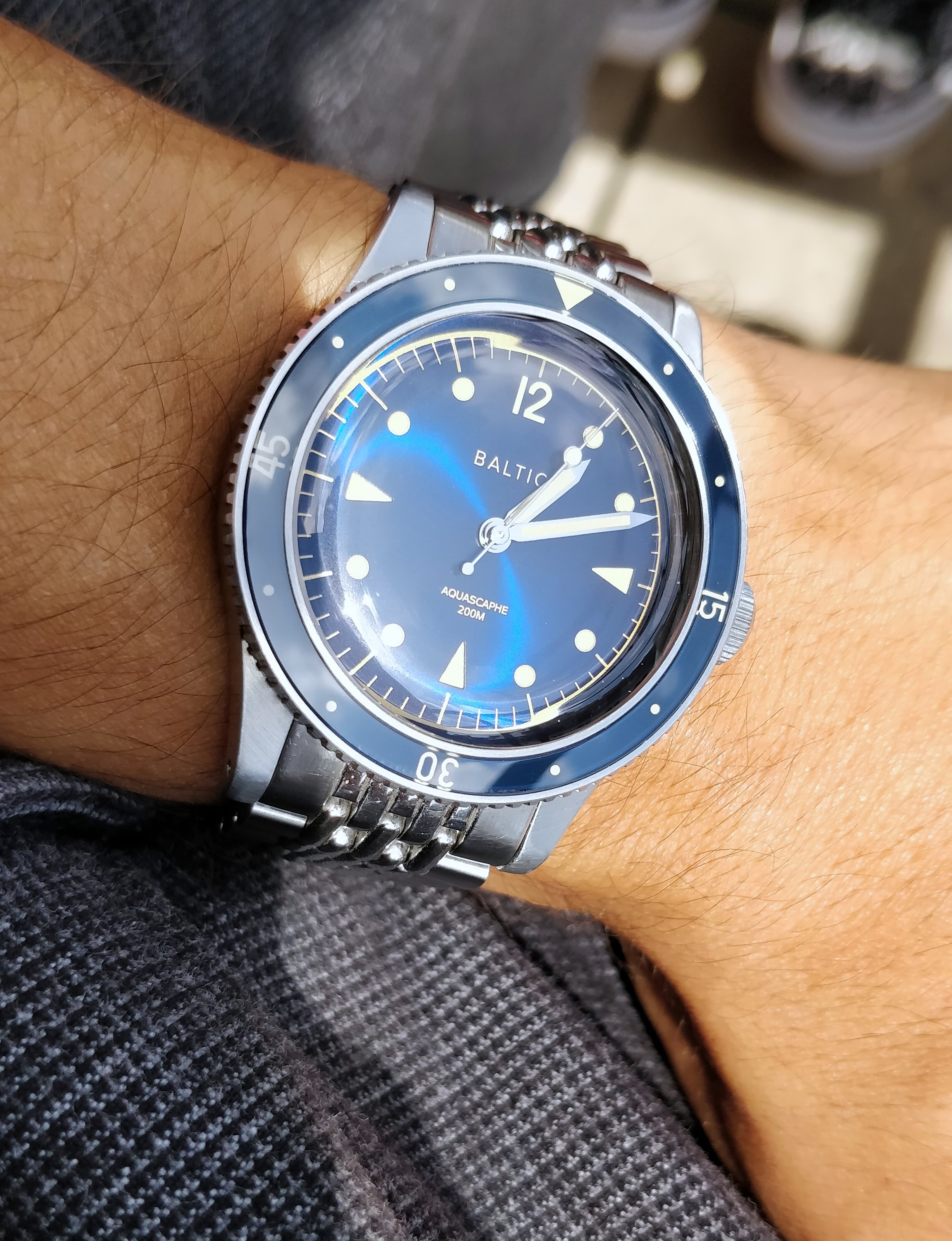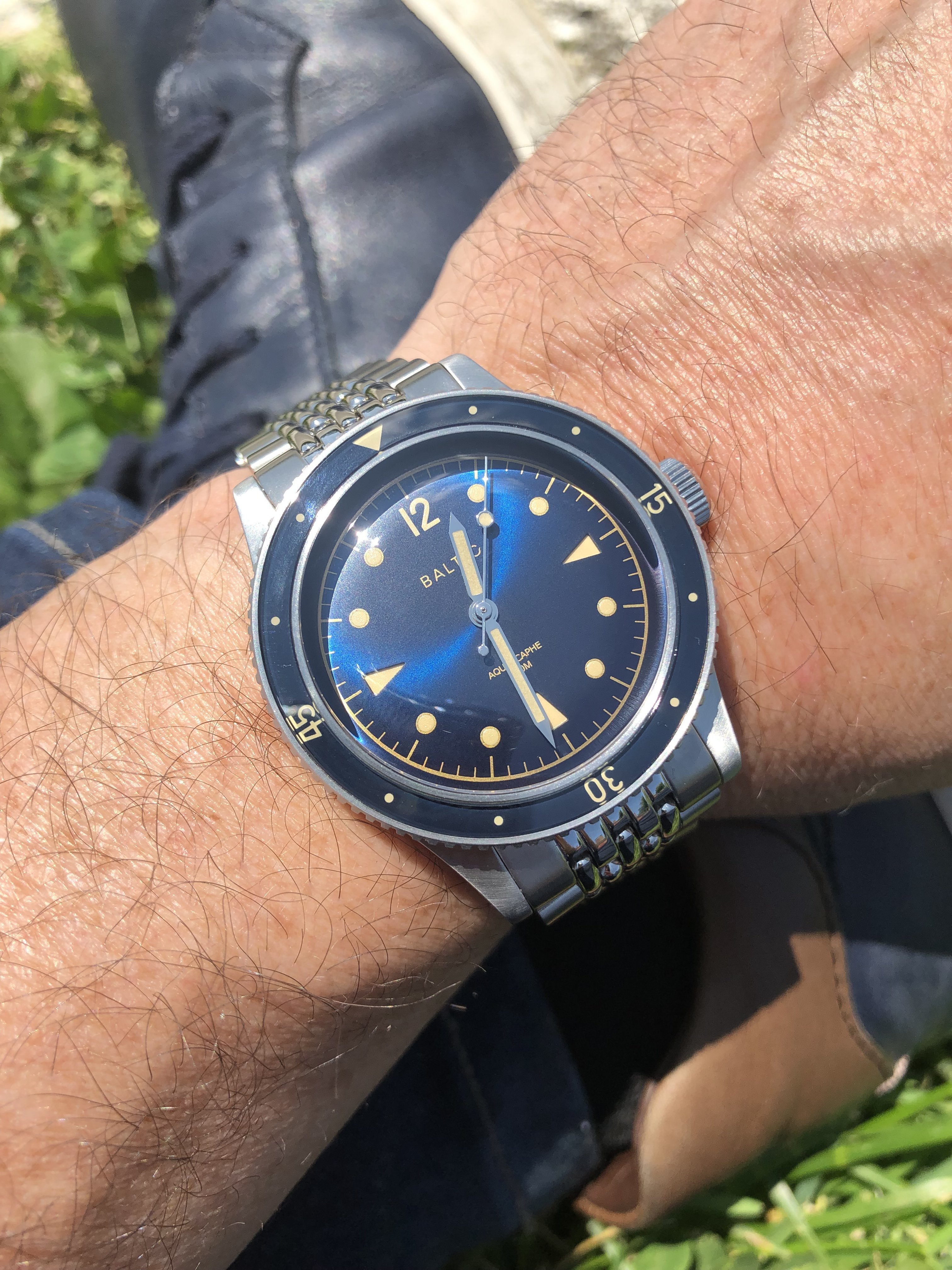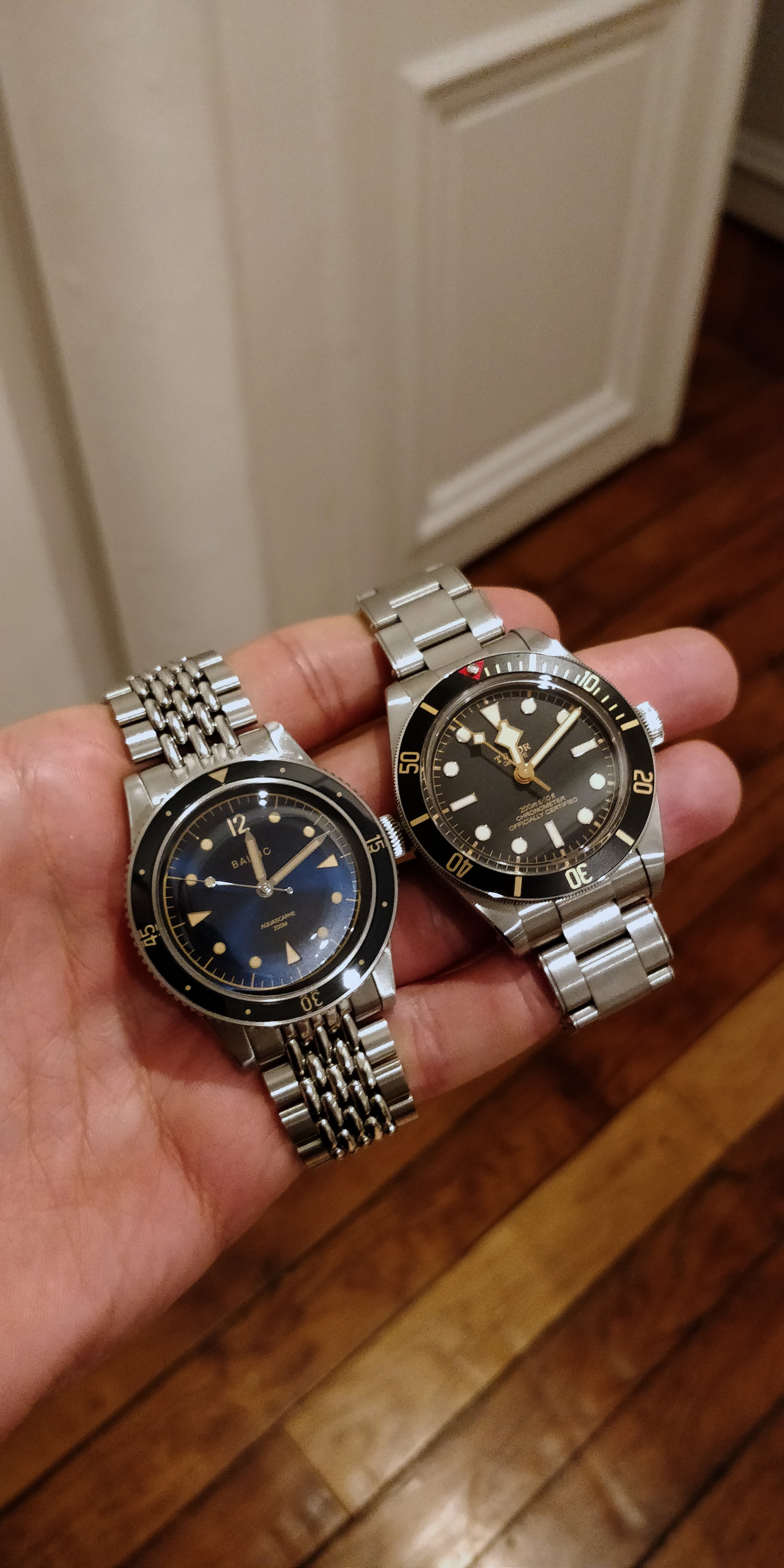 Here is a shitty pic of my BB58 with the blue gilt Aquascaphe. The quality of the BB58 is of course superior in term of finishing, but when you have the two in hand the Baltic doesn't feel cheap at all. It is actually really well made for the price, and if you like it in picture you'll like on the wrist. Considering the price gap the Aquascaphe is a good alternative for a nicely sized diver if you're not 100% settled on the blackbay and you just want a cool "toolwatch".