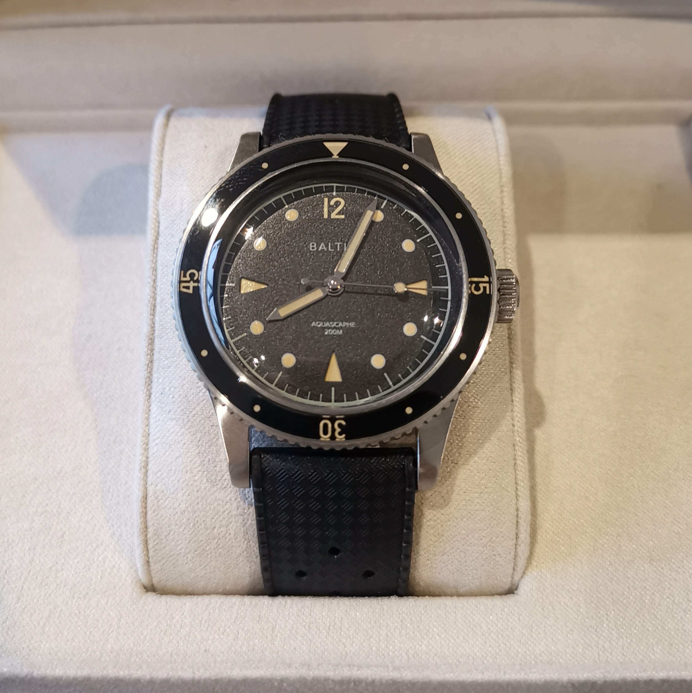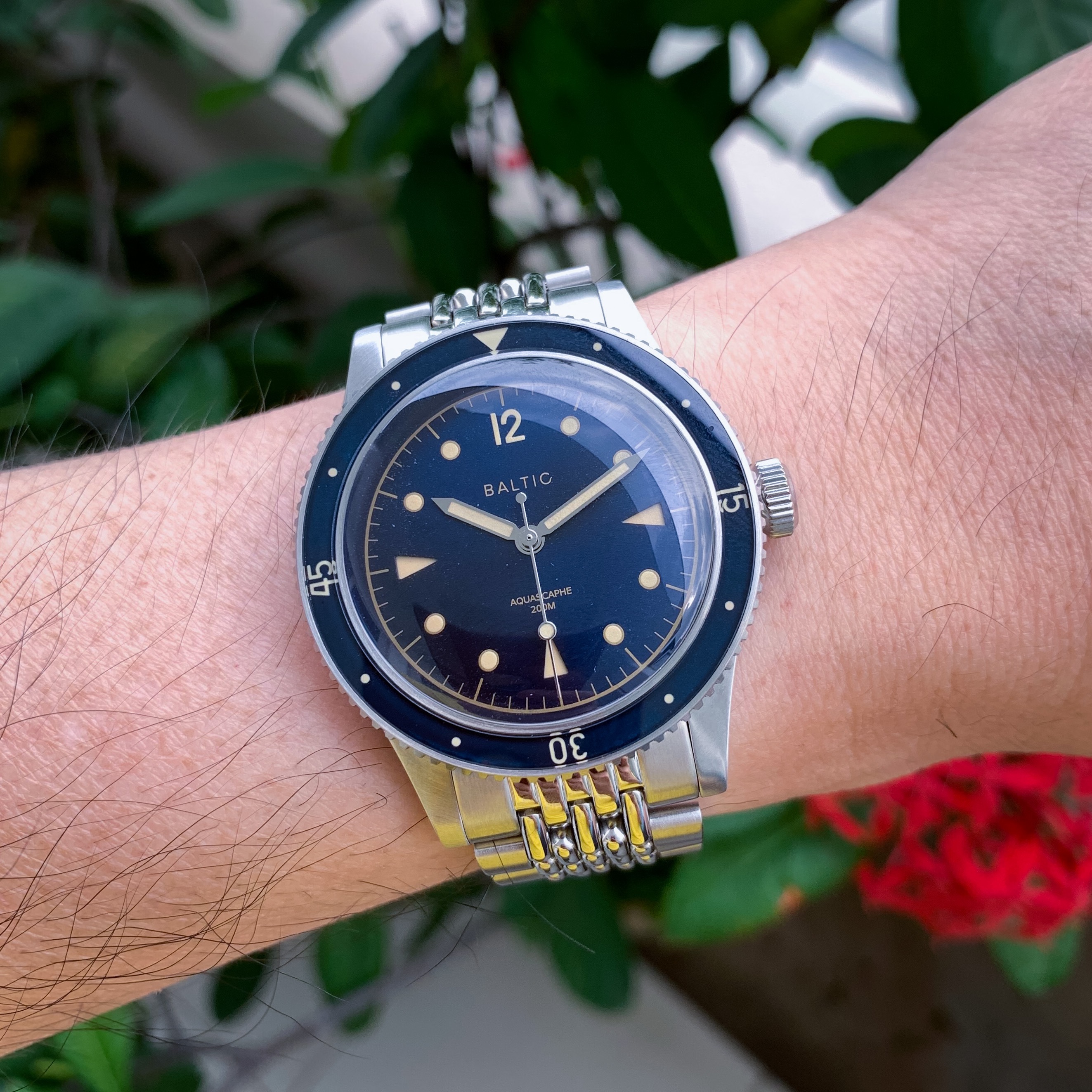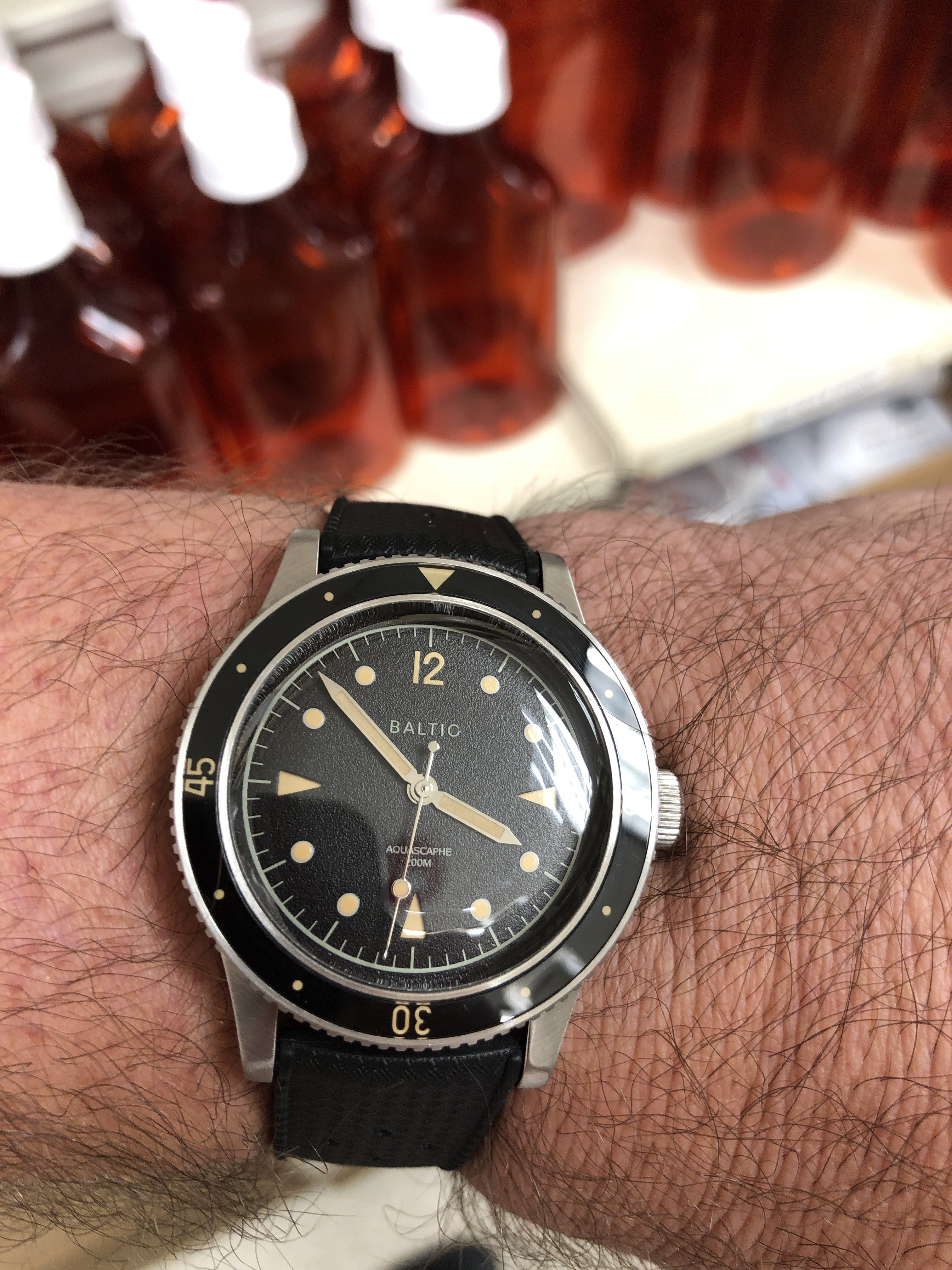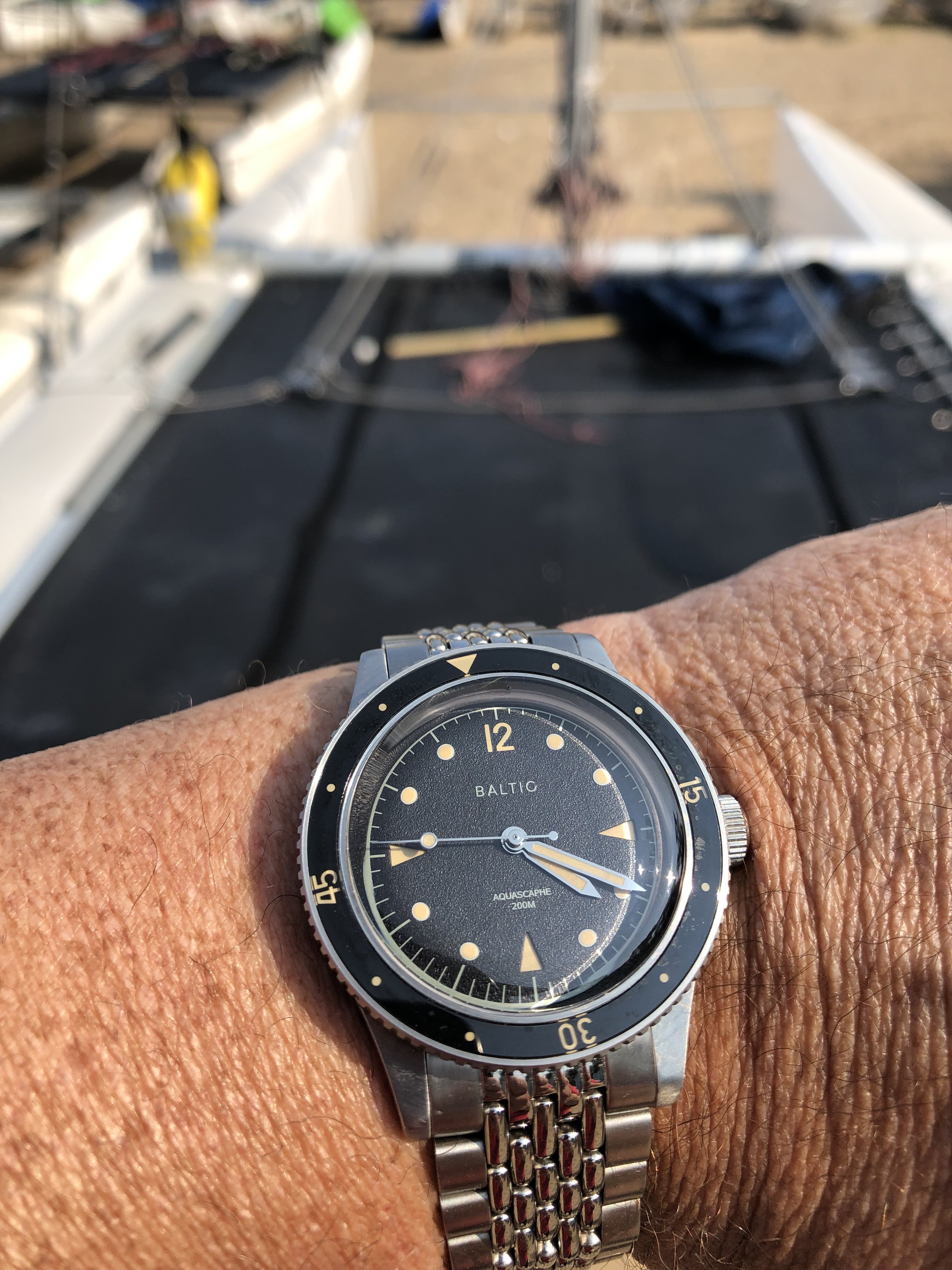 Here is a shitty pic of my BB58 with the blue gilt Aquascaphe. The quality of the BB58 is of course superior in term of finishing, but when you have the two in hand the Baltic doesn't feel cheap at all. It is actually really well made for the price, and if you like it in picture you'll like on the wrist. Considering the price gap the Aquascaphe is a good alternative for a nicely sized diver if you're not 100% settled on the blackbay and you just want a cool "toolwatch".