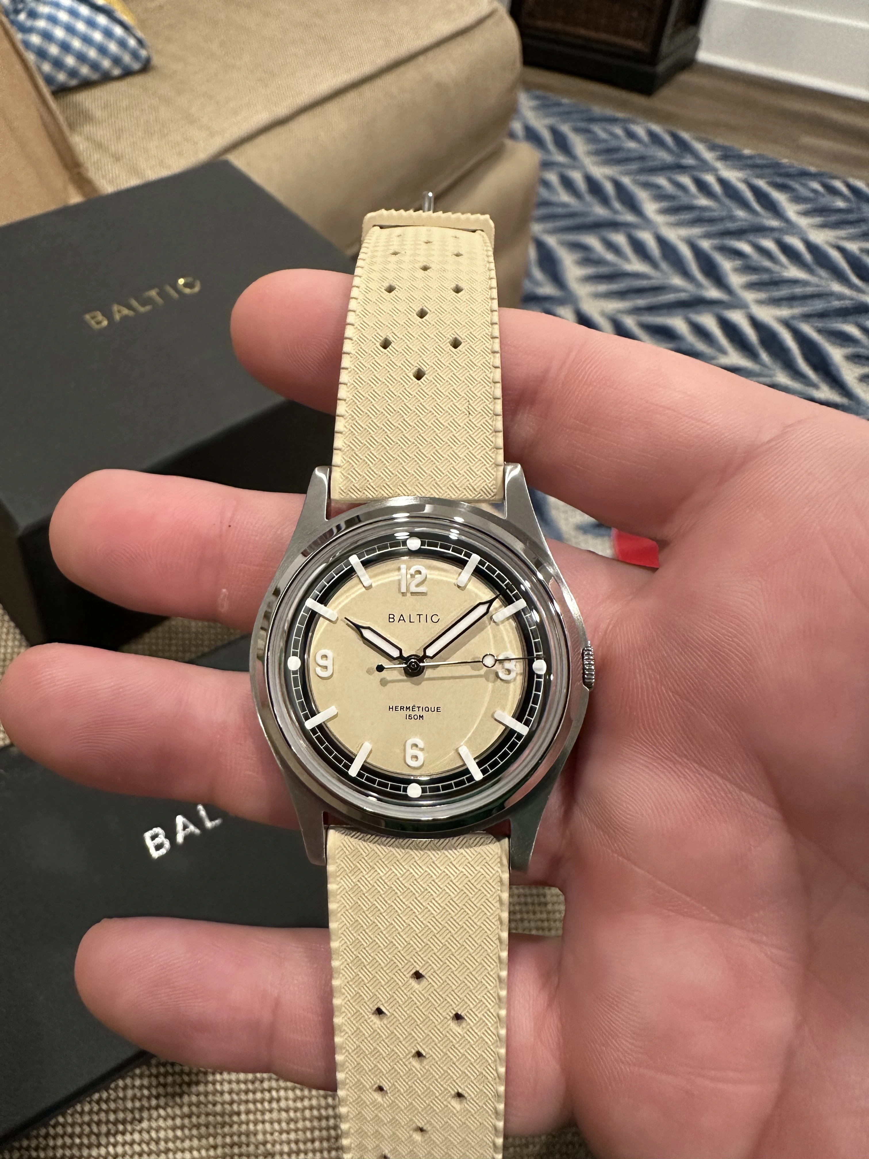 Bought brand new, I’ve worn it a handful of times. No visible wear, still has caseback sticker intact. I opted to also add the bracelet and strap tool which provides a nice touch.