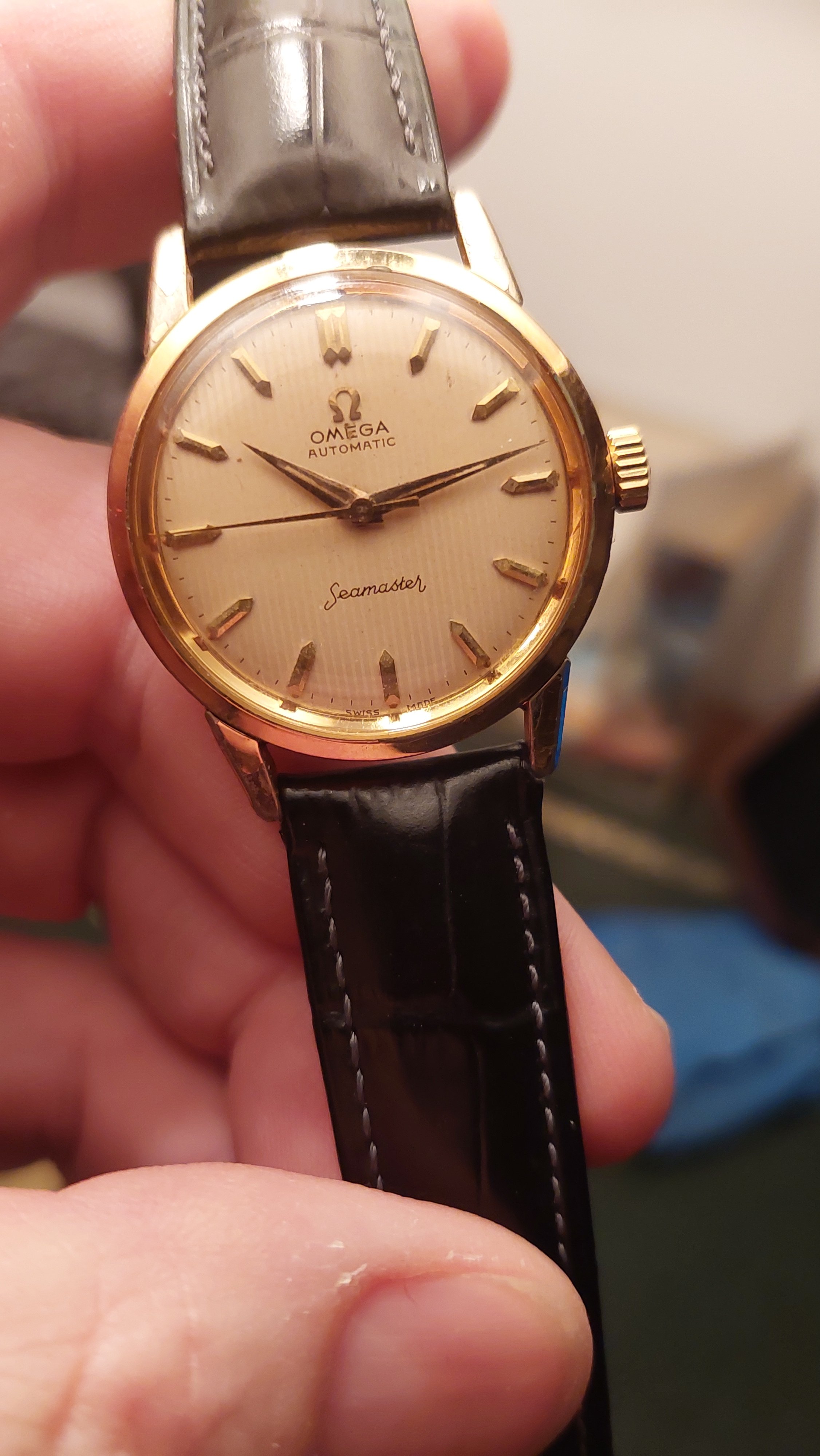 路My dad bought this watch new, and wore it until he replaced it with, surprisingly, a very similar Omega. When he got his new watch he gave me this one, I am guessing that was 40 years ago, I am not sure how original it is but its sentimental value is off the charts for me. The plating has chipped of in a few places but otherwise it is in excellent condition and keeps perfect time. I have always worn it on a black leather strap as shown here, and that is how he wore it too.