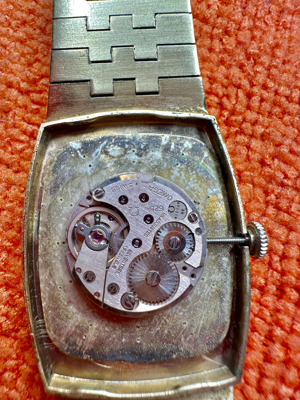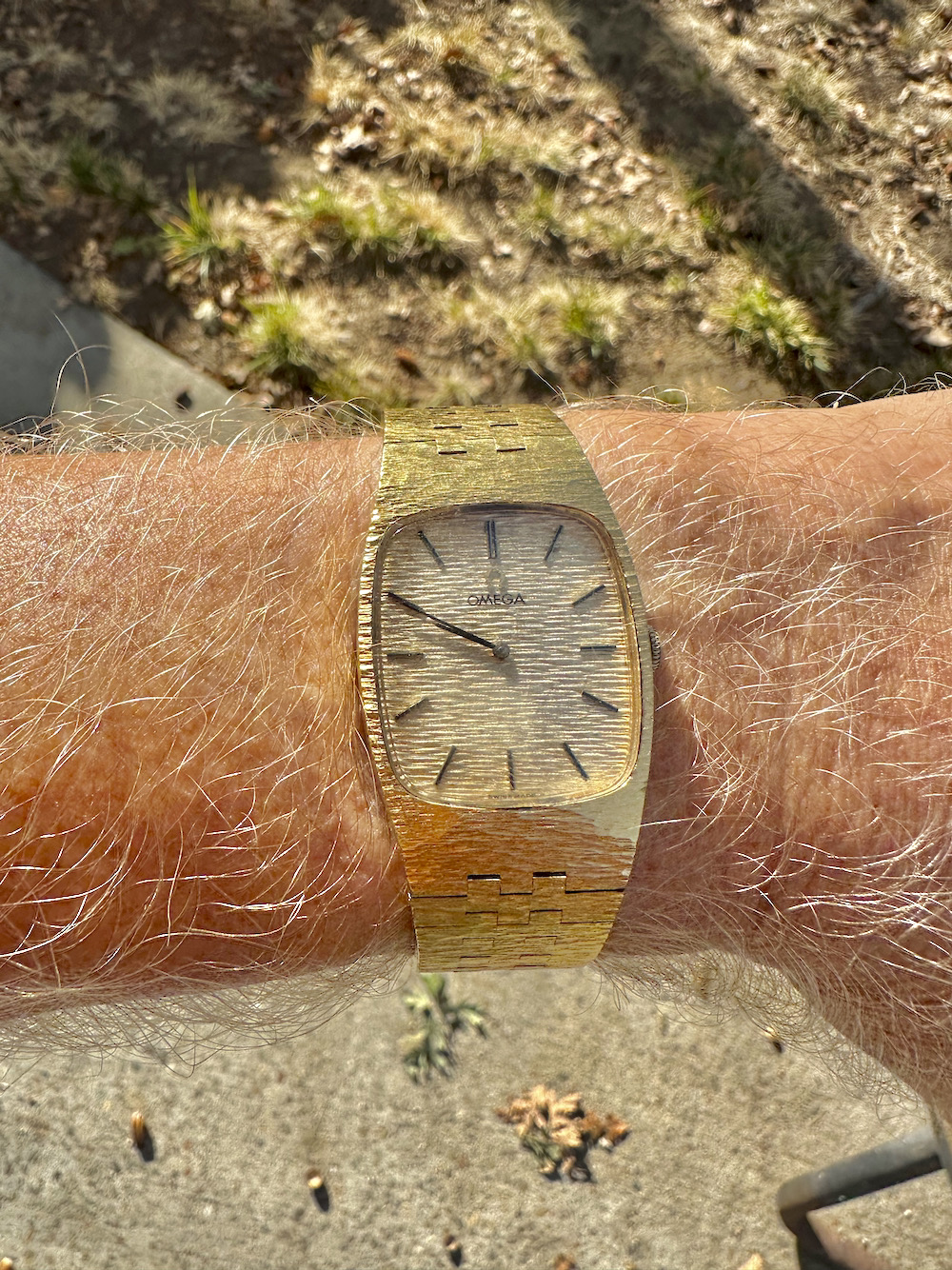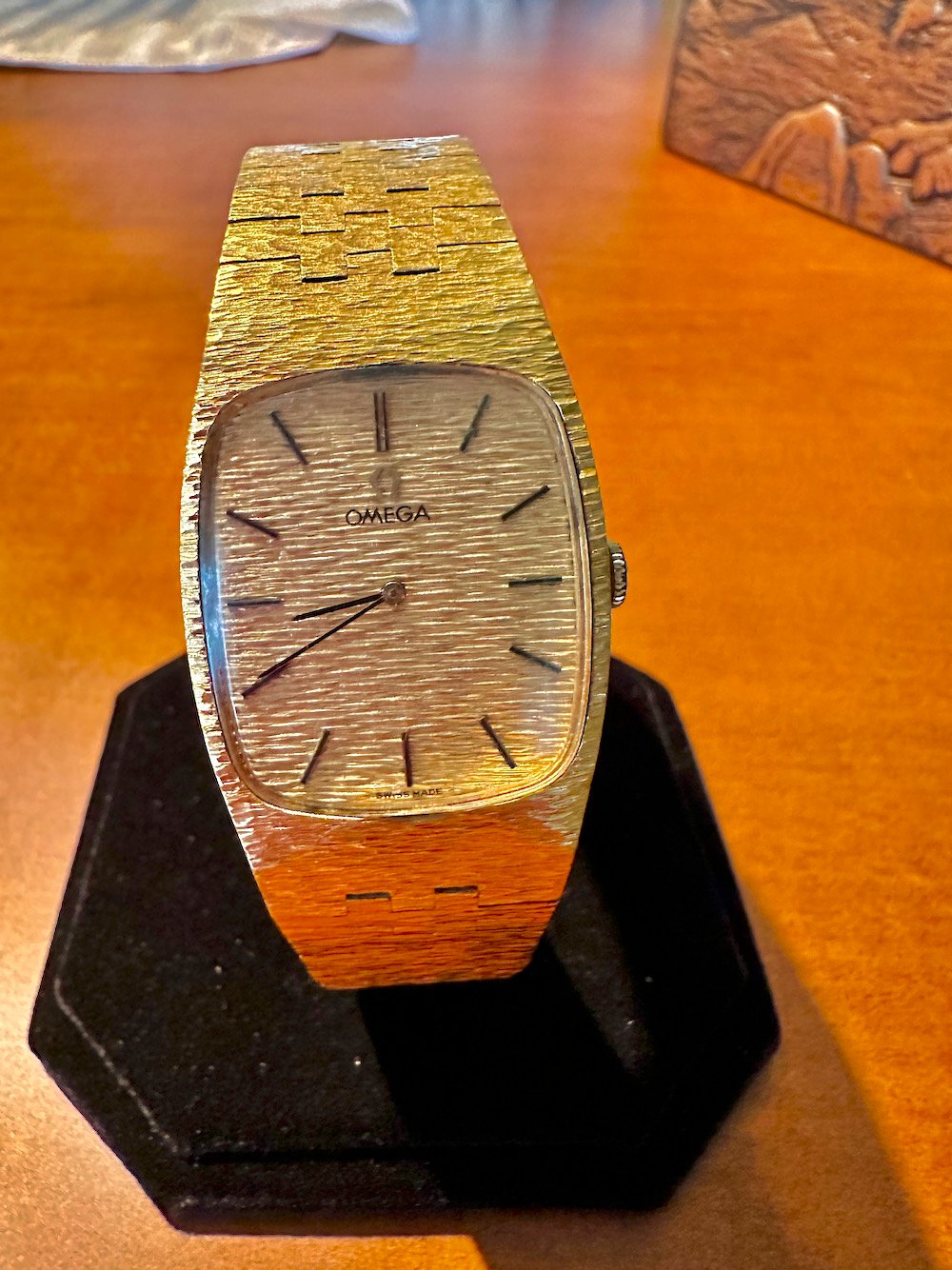 In the mid 1970’s I used to frequent a pub in Cheshire and the landlord wore a beautiful gold Omega bark effect watch, it was a really elegant design with the bracelet blending into the watch face which I think was quartic ( square with rounded corners ). It might have been a Sea Master or De Ville similar to this one on the Omega Vintage watches website.