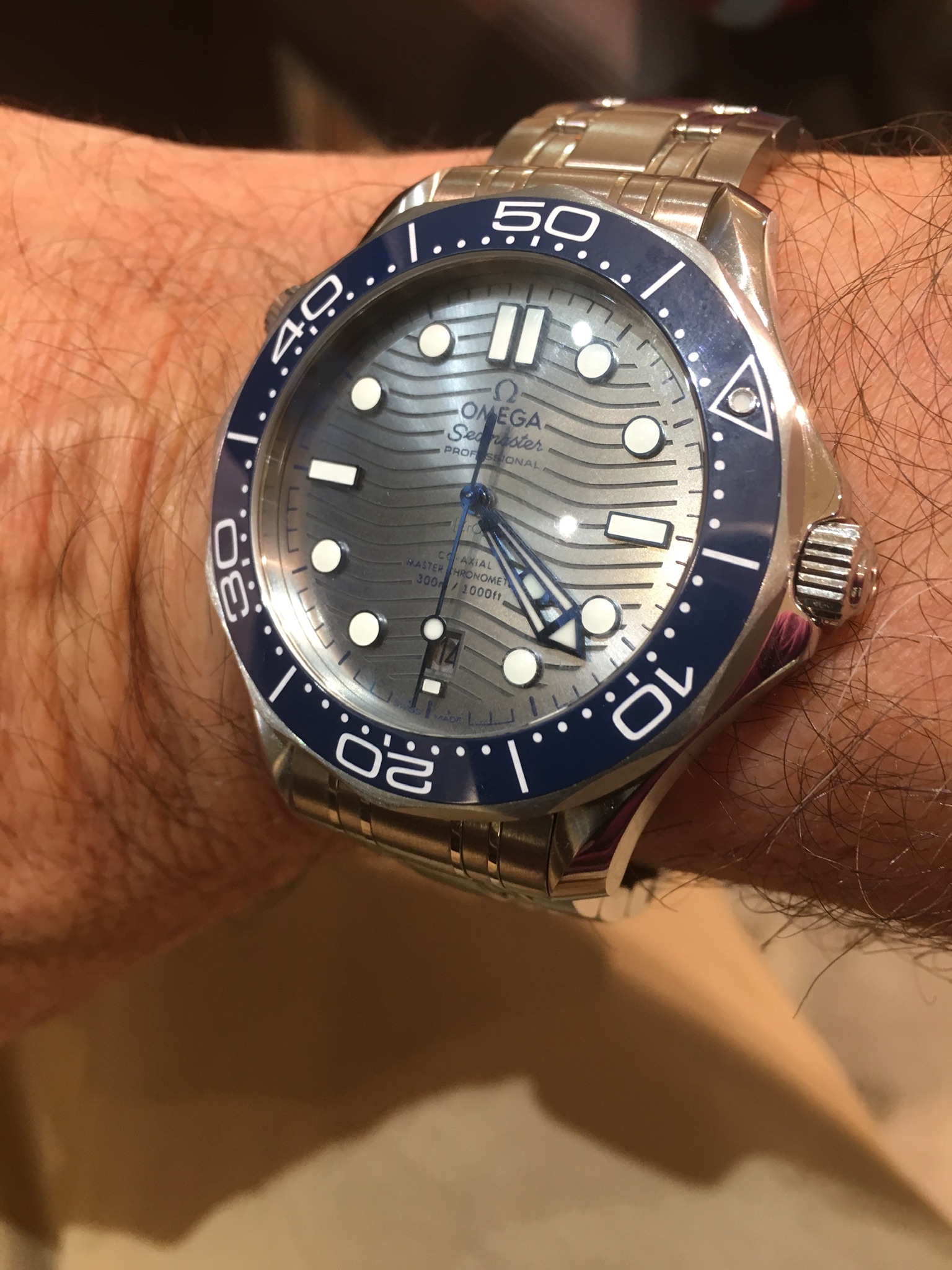 Fit and finish is top notch, at least compared to my older Seamasters. You can really appreciate the flatness of the links compared to my Bond I think, noticeable on the wrist as well. The flatness also makes the polished bits less blingy IMO as well. The waves on the new version are not as pronounced in person, contrasted with the older waves which disappear in the accompanying photo.