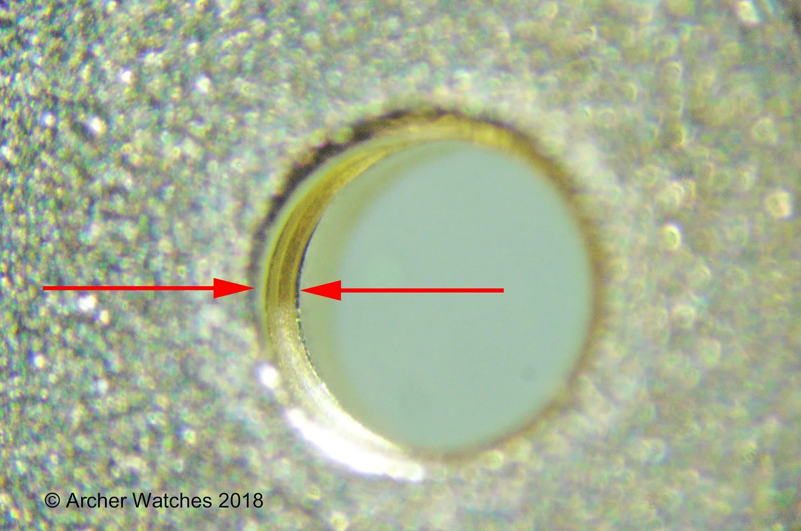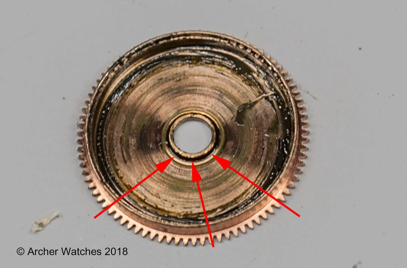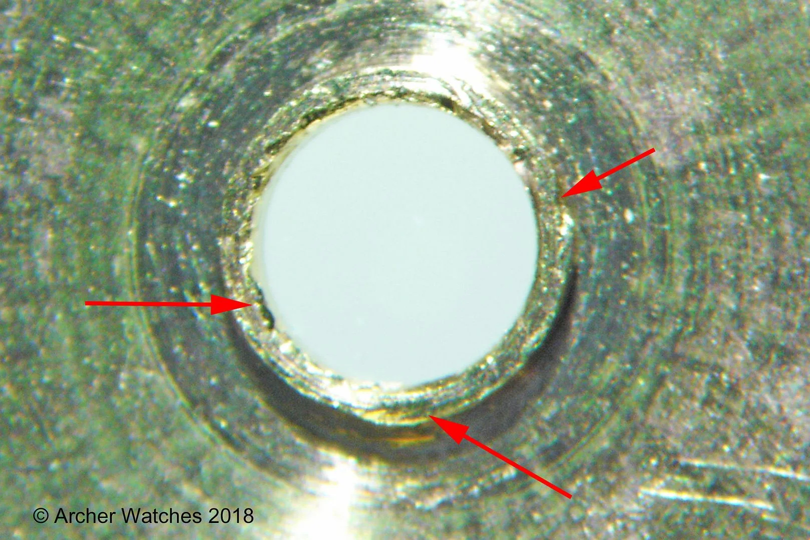 You rarely see this damage on corresponding hole in the barrel lid, because this is damage caused by a watchmaker, rather than wear. This is some watchmaker making a very ham fisted attempt at installing the barrel arbor, and in the process the hardened steel arbor has caused damage to the soft brass of the mainspring barrel. The damage here can cause a lot of problems with lost balance amplitude and erratic running, because when the mainspring unwinds, the barrel spins around that arbor. If there are burrs here it's going to cause added drag. This damage can be repaired (cleaned up) to a certain extent, but if it's really bad, a new barrel drum is needed.