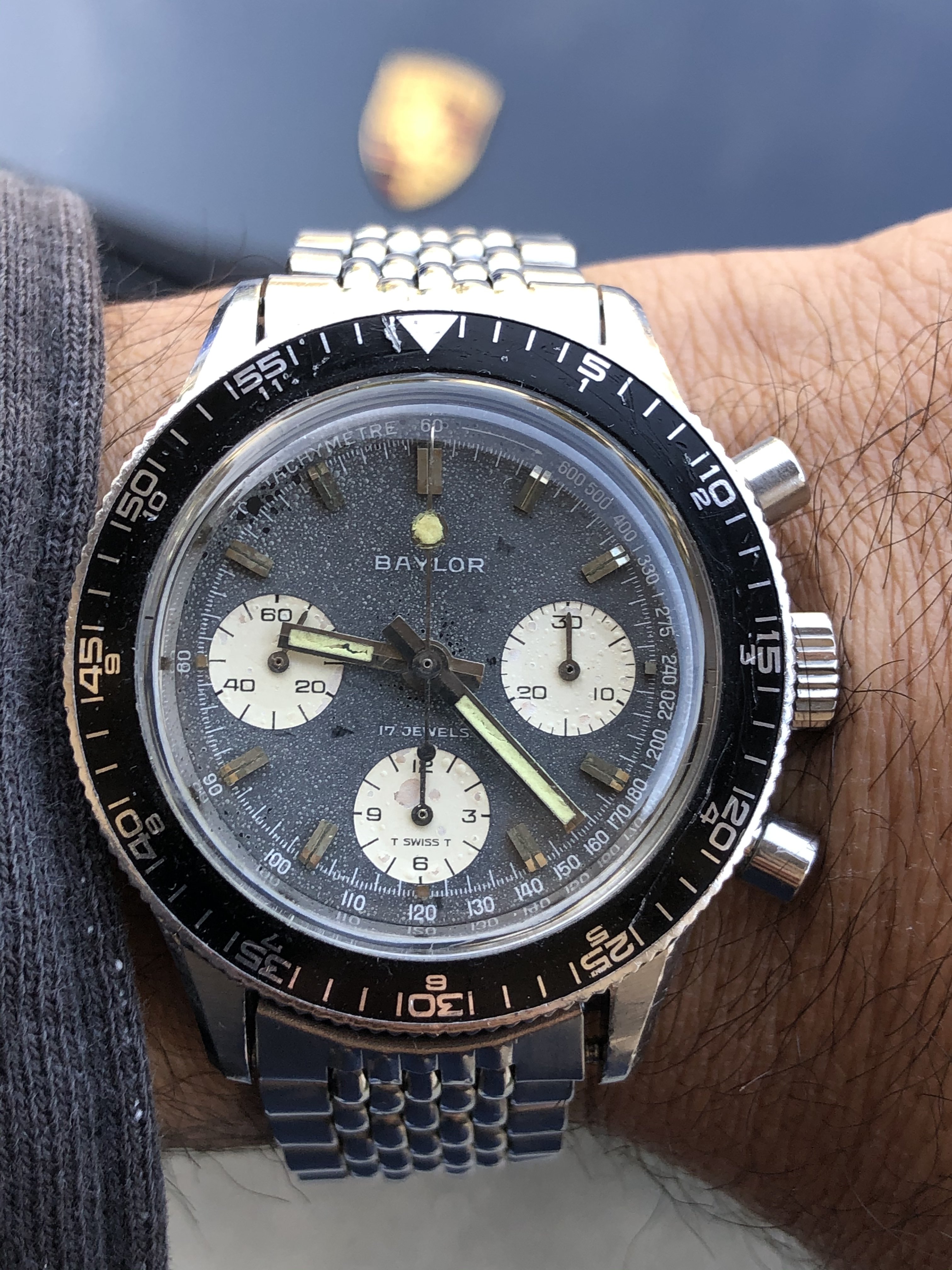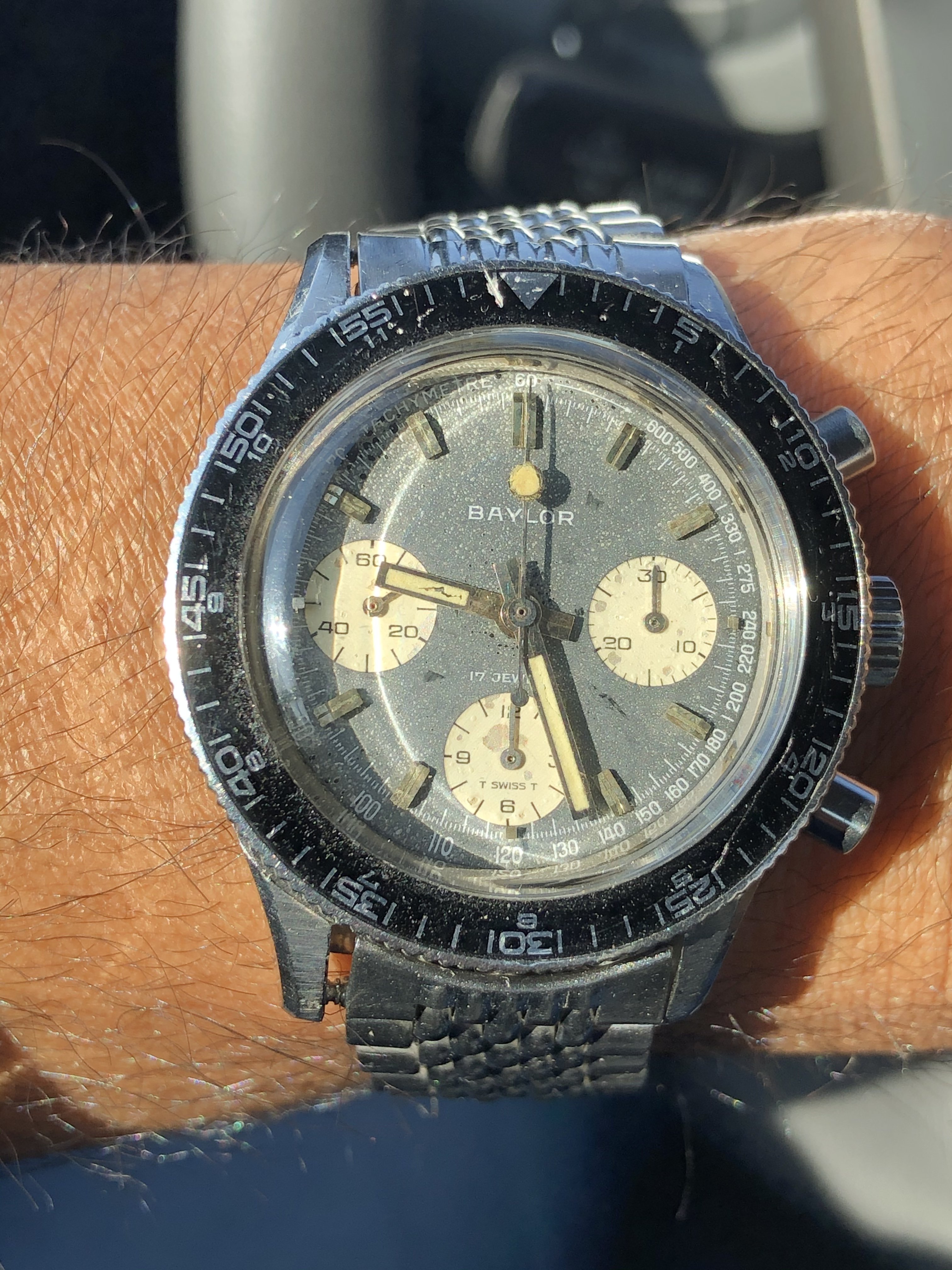 Baylor was sold through Zales jewellers. The seller really doubled down on the Heuer connection: "Baylor-branded watches used many of the same parts as the Heuer Autavias and Carreras of the late 1960s. It is even rumored that as Heuer began to shift its focus toward automatic chronographs with new cases and dials, Zales was able to snatch up parts for pennies on the dollar."