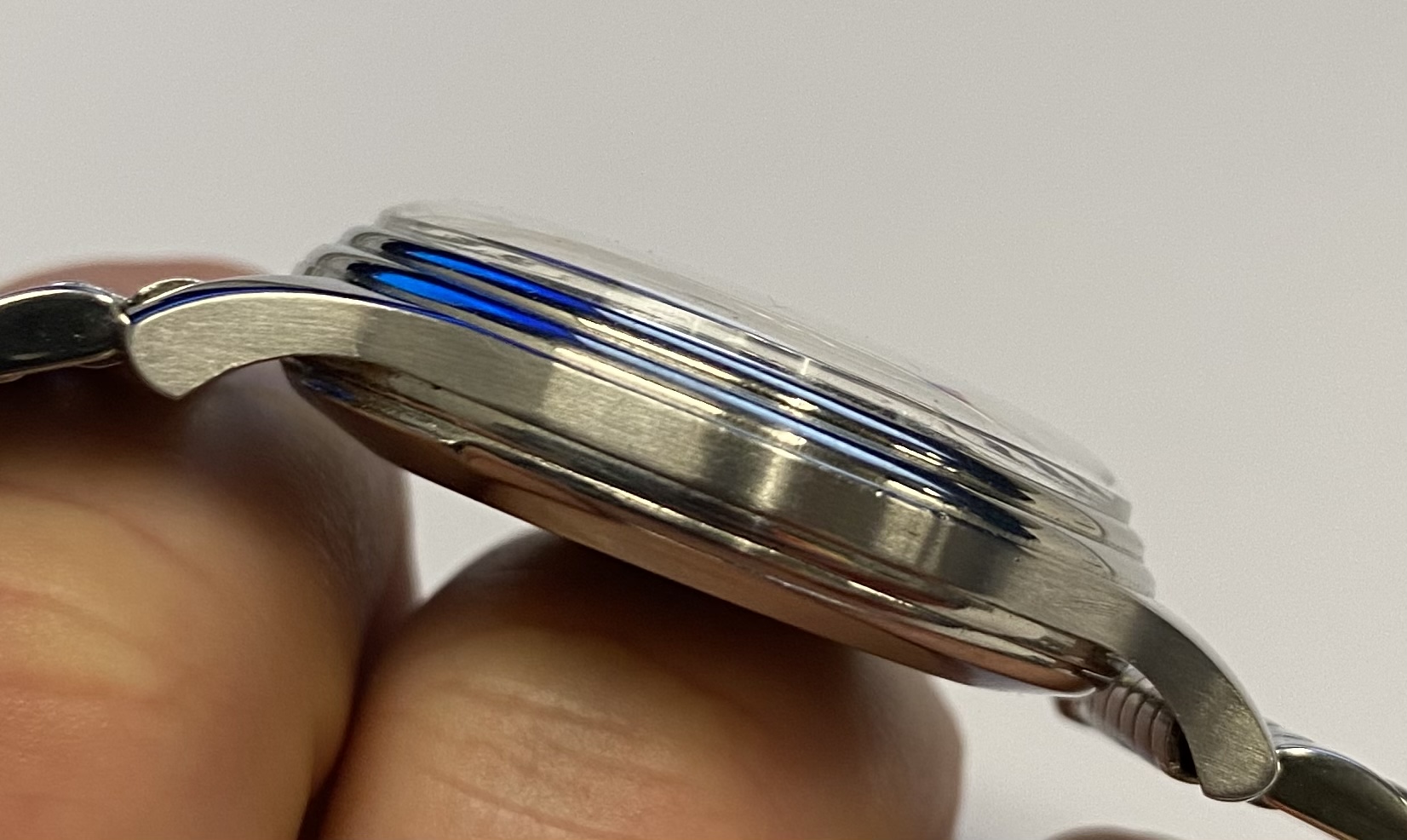 It’s 33.5 - 34mm case is polished but still looks really good in my opinion.