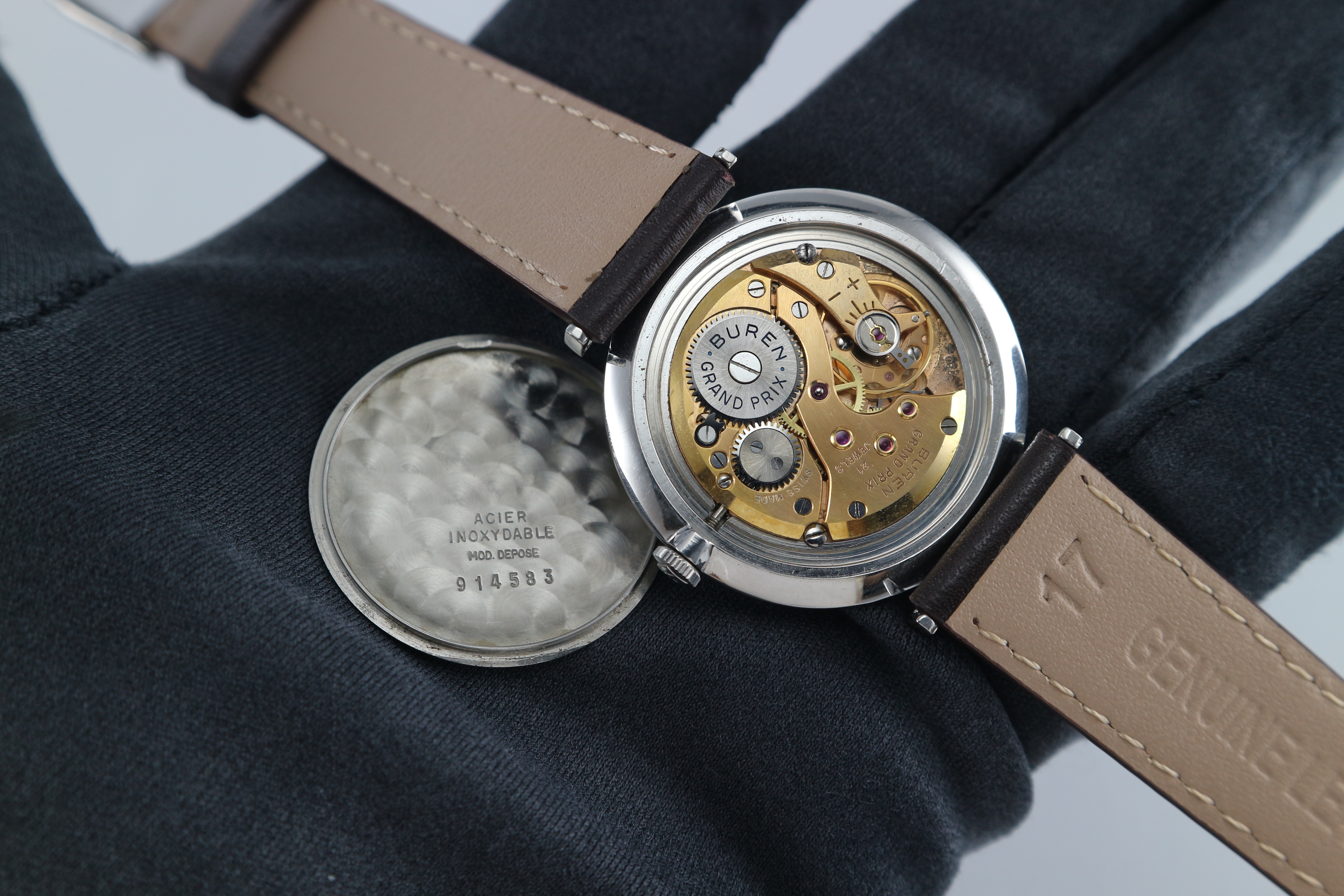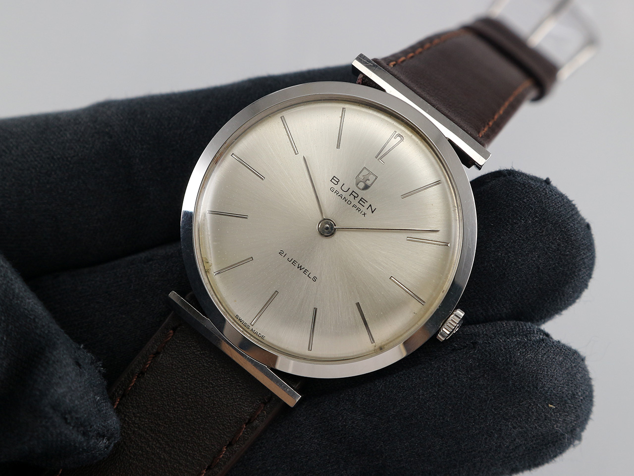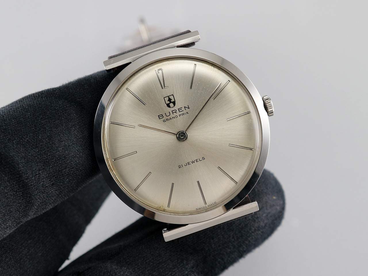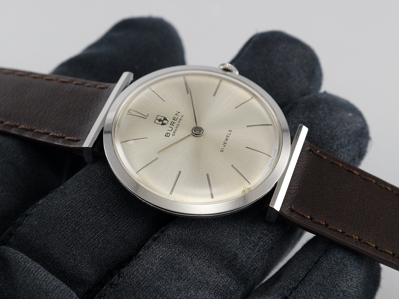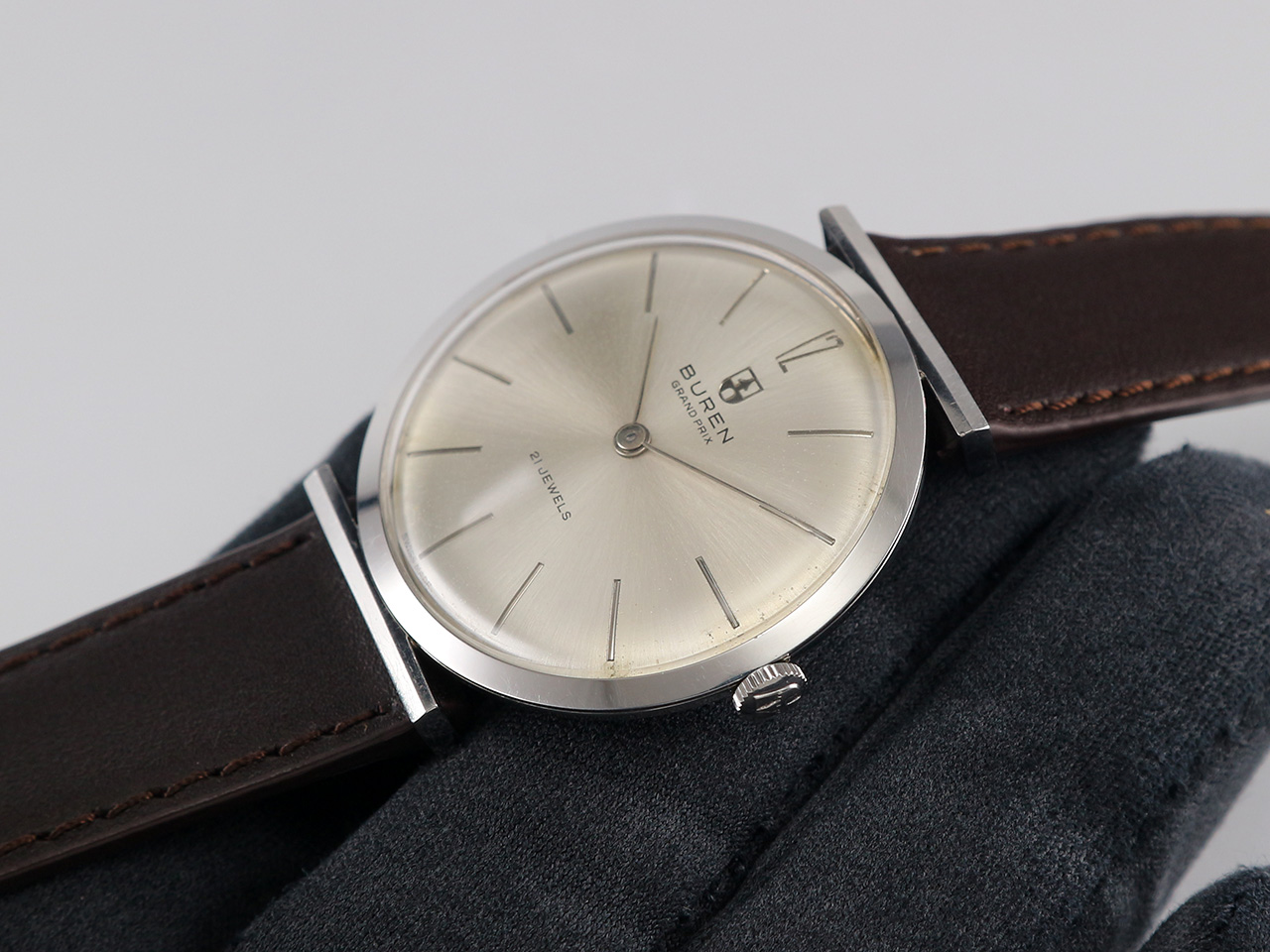 ·Up for sale is a very nice Buren Grand Prix dress watch Ref. 813802. The original sunburst dial is still in good condition. The case is unpolished and in great shape plus the original crown. It is measure 33.3mm wide without crown and 36.2mm lug to lug, lug width is 17mm. Thanks to the ultra-slim profile: only 6.5mm in thickness, it wears larger. Inside is the Buren cal. 280, service history unknown but still keep decent time.