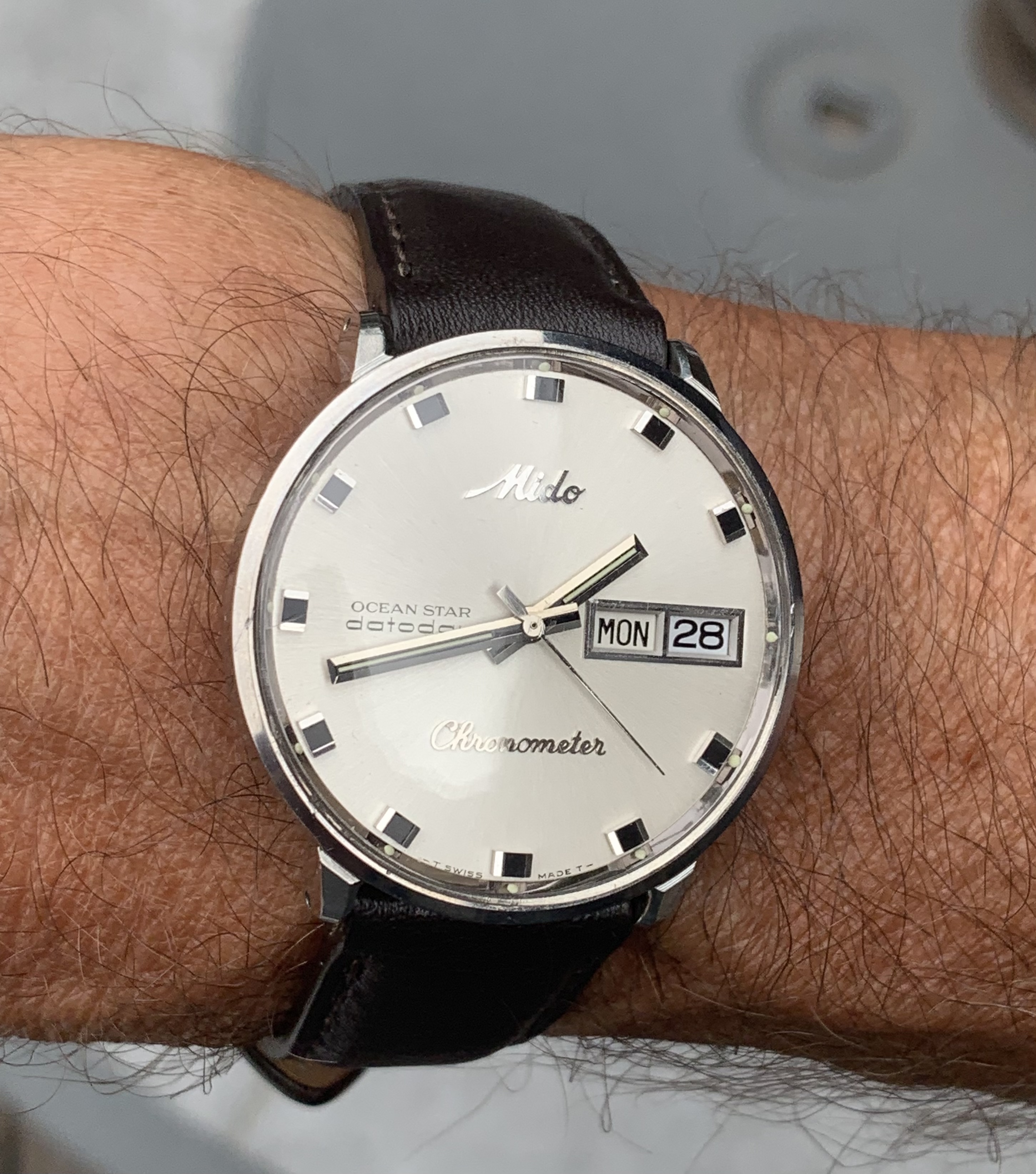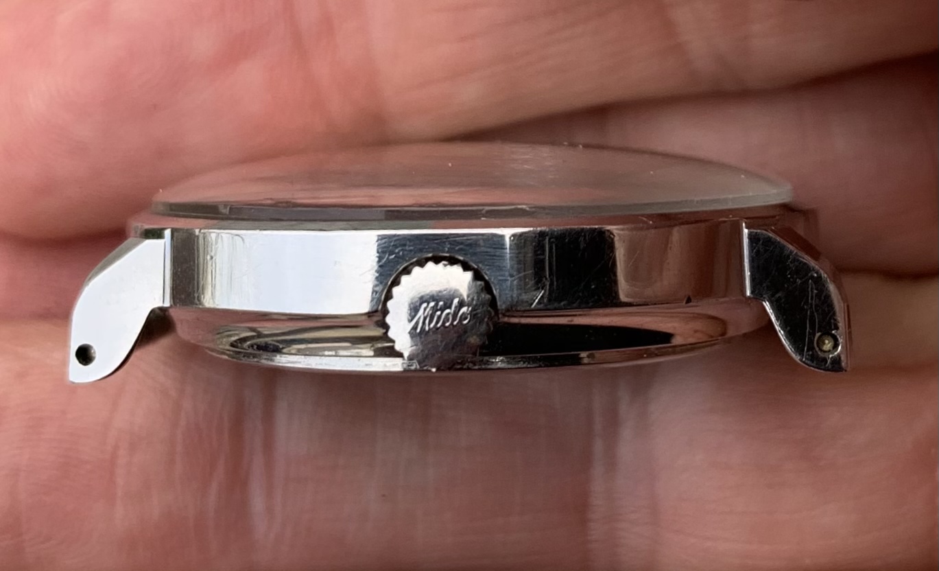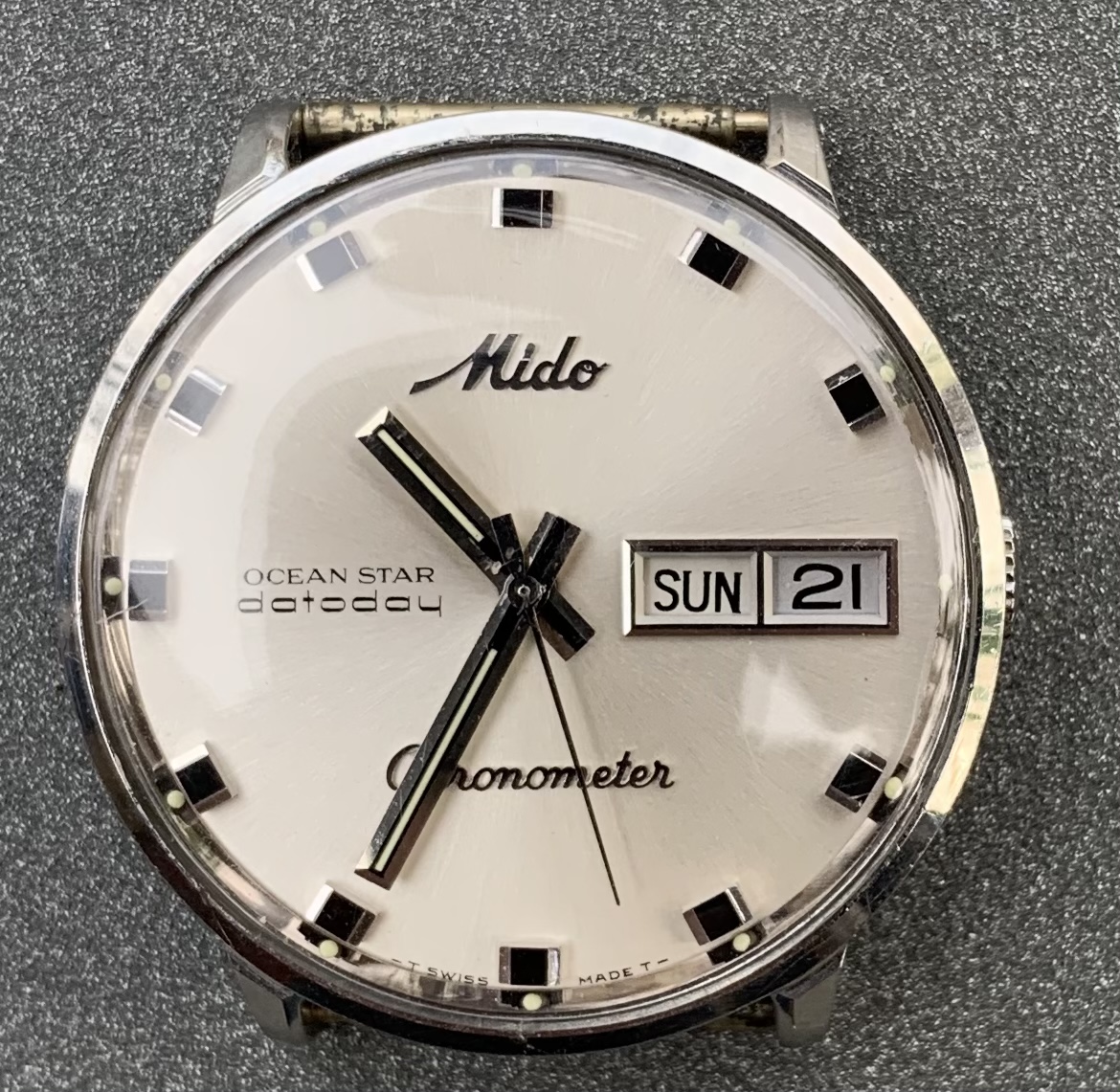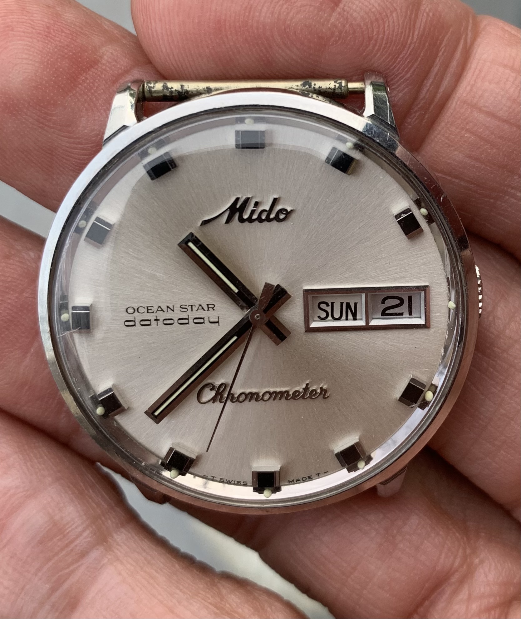 ·I have for sale from my collection this excellent, unpolished Mido in stainless steel with gorgeous 60’s styling. It was serviced about 2 1/2 years ago just before I took possession, and it continues to set, wind, and run beautifully. The sale is for the head only. If you absolutely must have a strap, I might be able to dig one up to include before shipping.