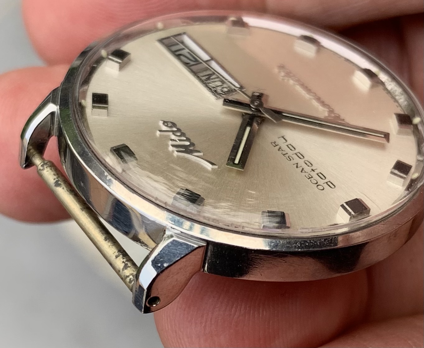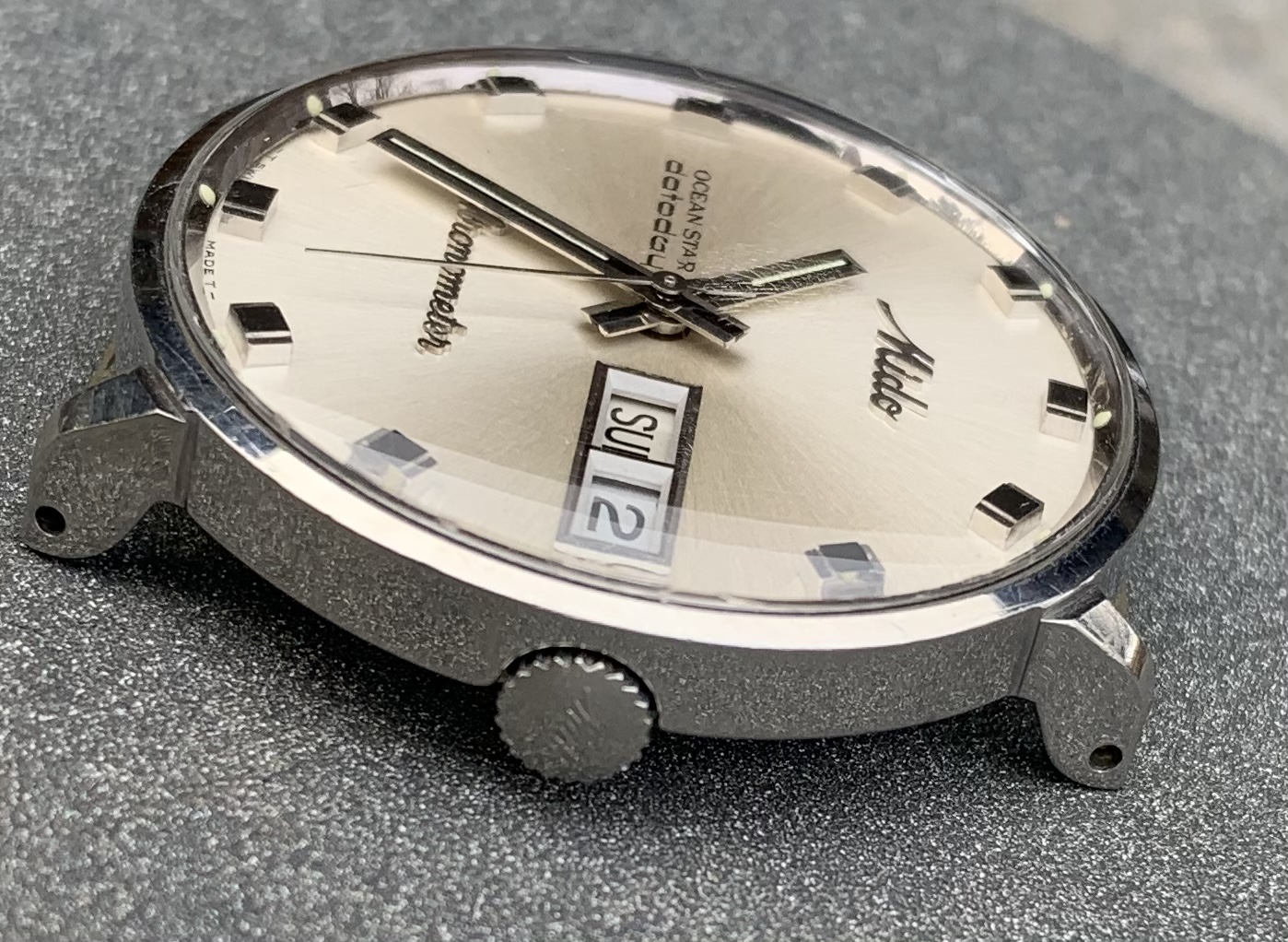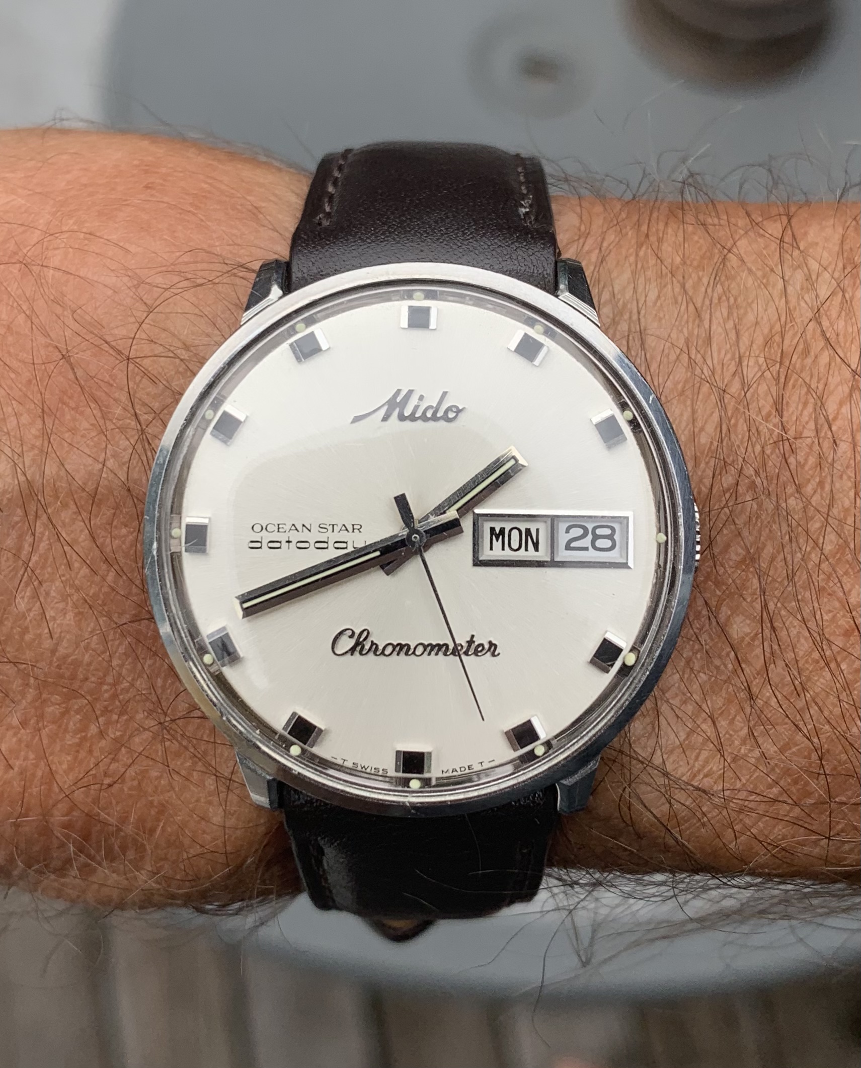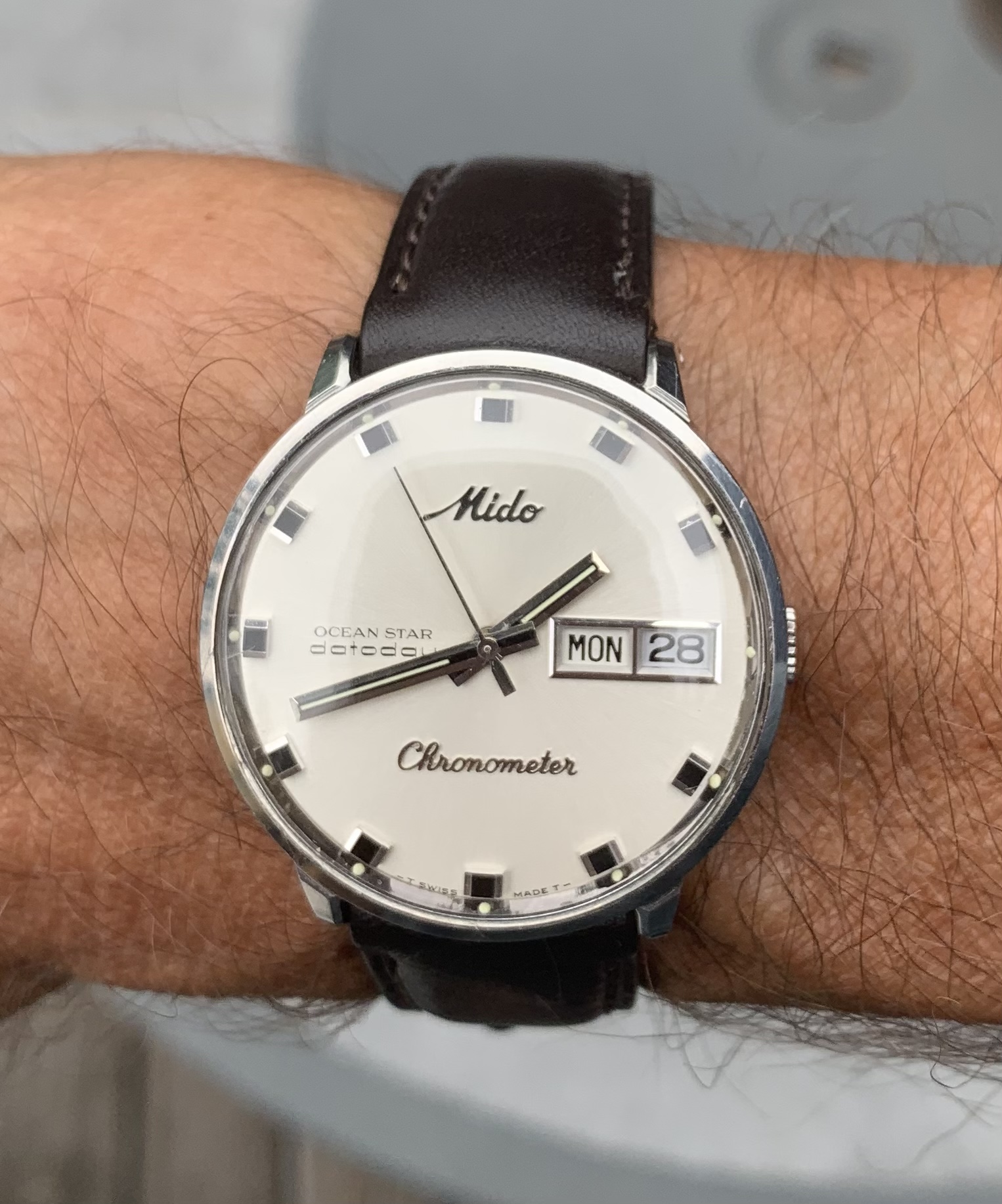 ·I have for sale from my collection this excellent, unpolished Mido in stainless steel with gorgeous 60’s styling. It was serviced about 2 1/2 years ago just before I took possession, and it continues to set, wind, and run beautifully. The sale is for the head only. If you absolutely must have a strap, I might be able to dig one up to include before shipping.