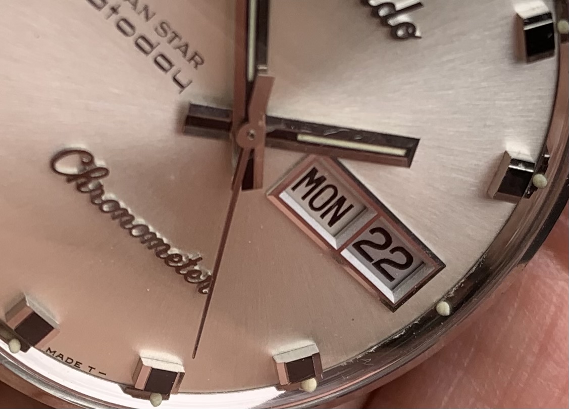 Addendum: Note: In the first few pics ‘SUN’ in the day window is already starting to move to ‘MON’ position, so it doesn’t look perfectly aligned. So, no worries here, once the day switch has been made, the letters are perfectly aligned within the window.