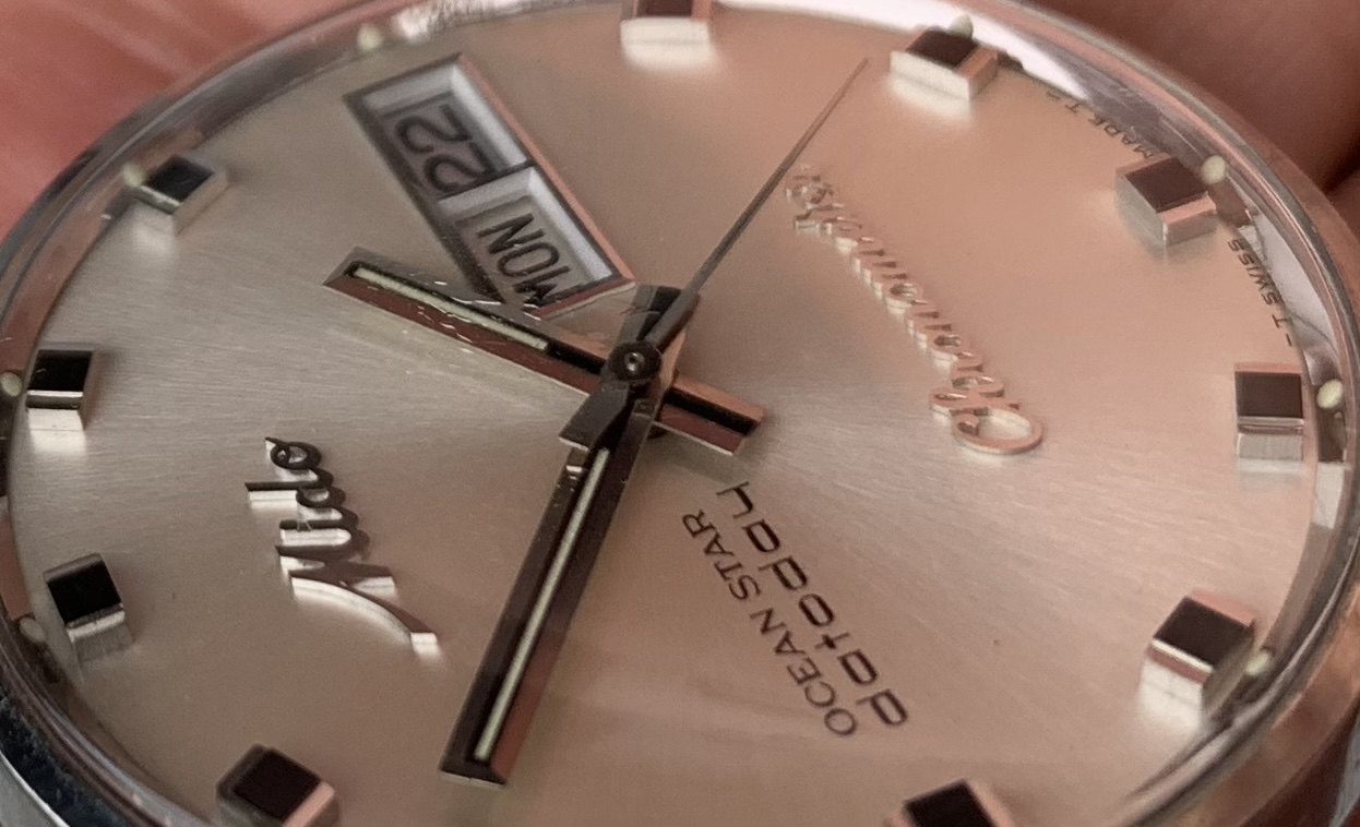 With just a few blemishes, I consider the watch to be in excellent condition. Of note in particular, I see a small scratch on the bezel at 9 o’clock, the outer part of the crystal at 3o’clock and again in the center. These are hard to notice with the naked eye, so overall, still a very beautiful example of 70’s Mido style!
